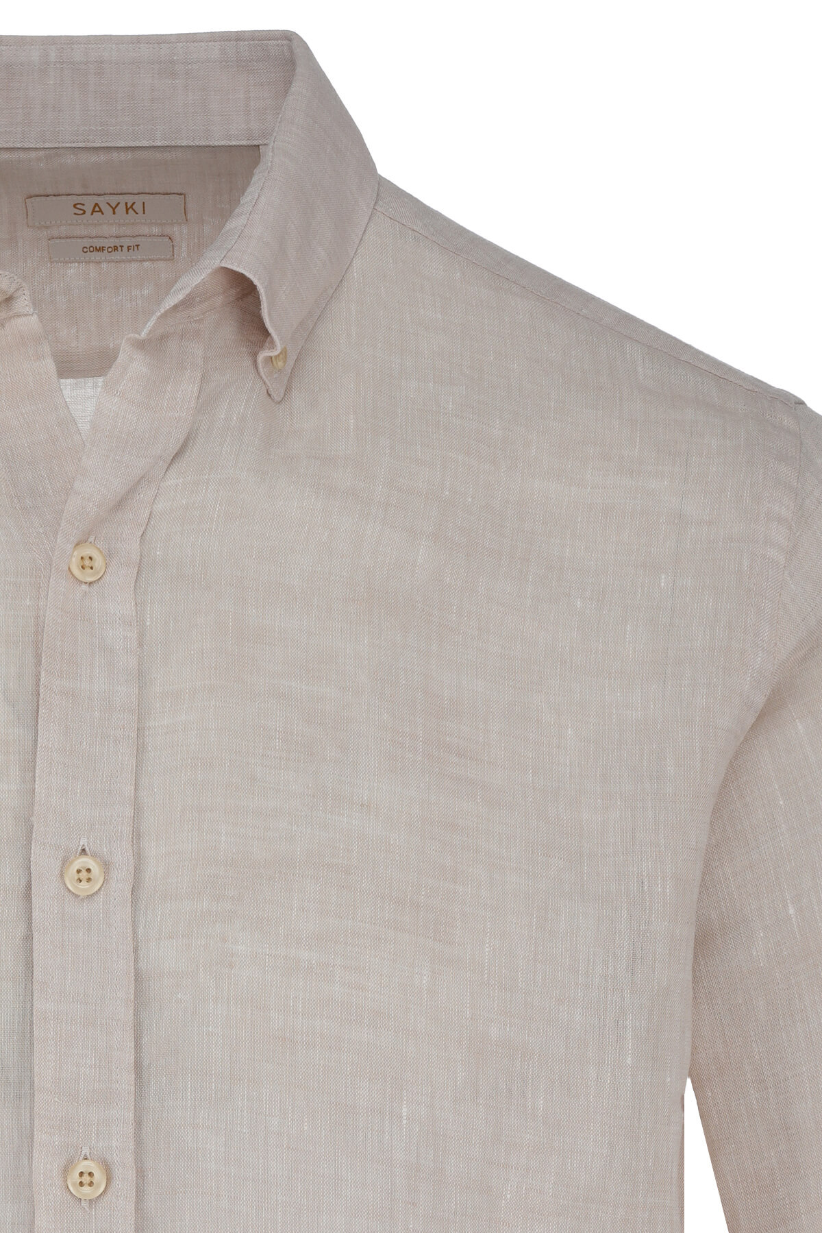 Bej Comfort Fit 100% Keten Düğmeli Yaka Uzun Kollu Keten Gömlek