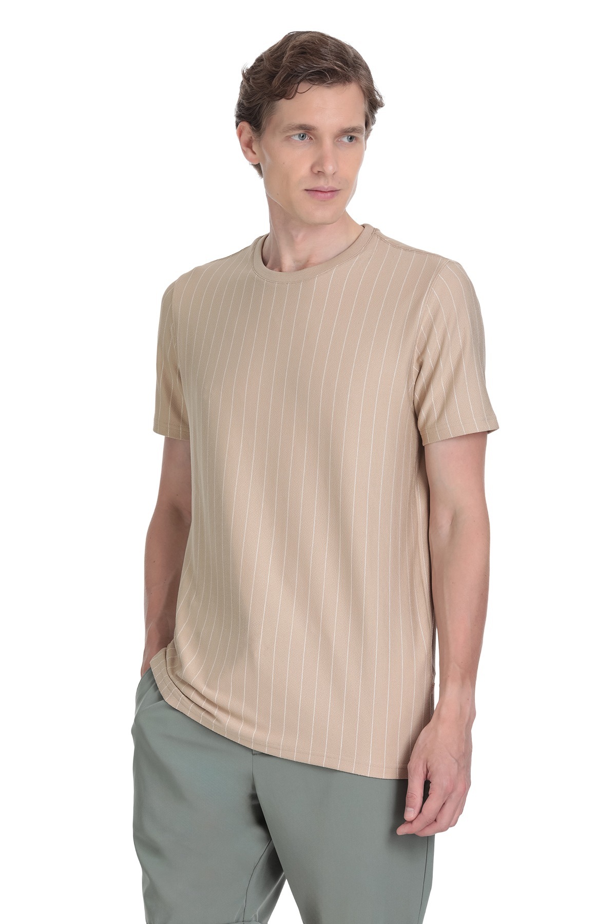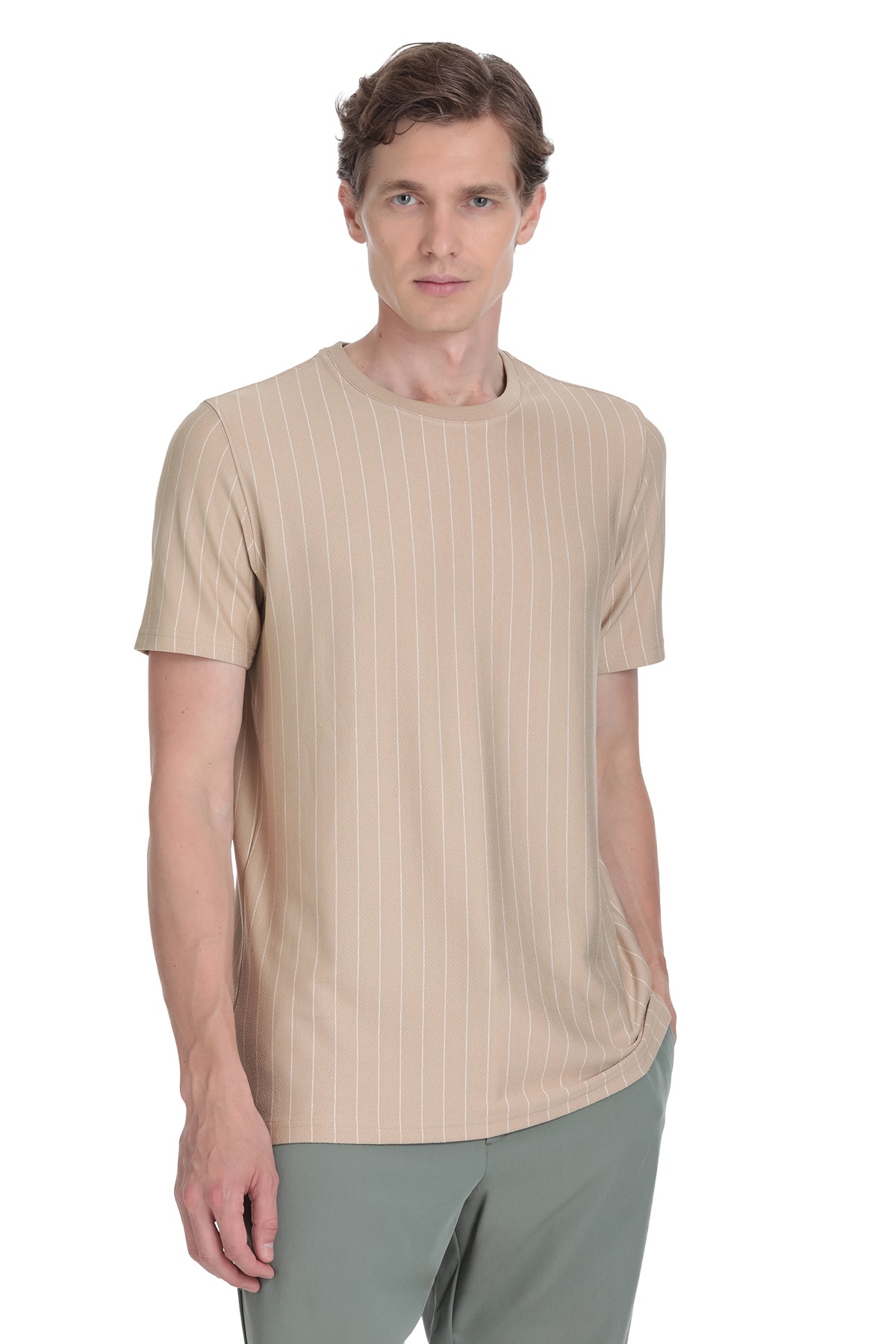 Bej Regular Fit Çizgili Bisiklet Yaka Tişört