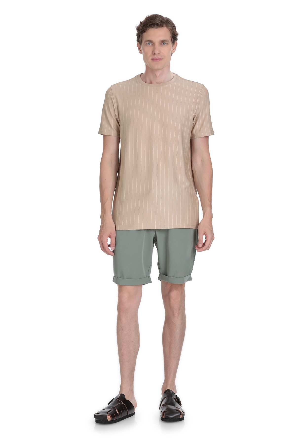 Bej Regular Fit Çizgili Bisiklet Yaka Tişört - 5