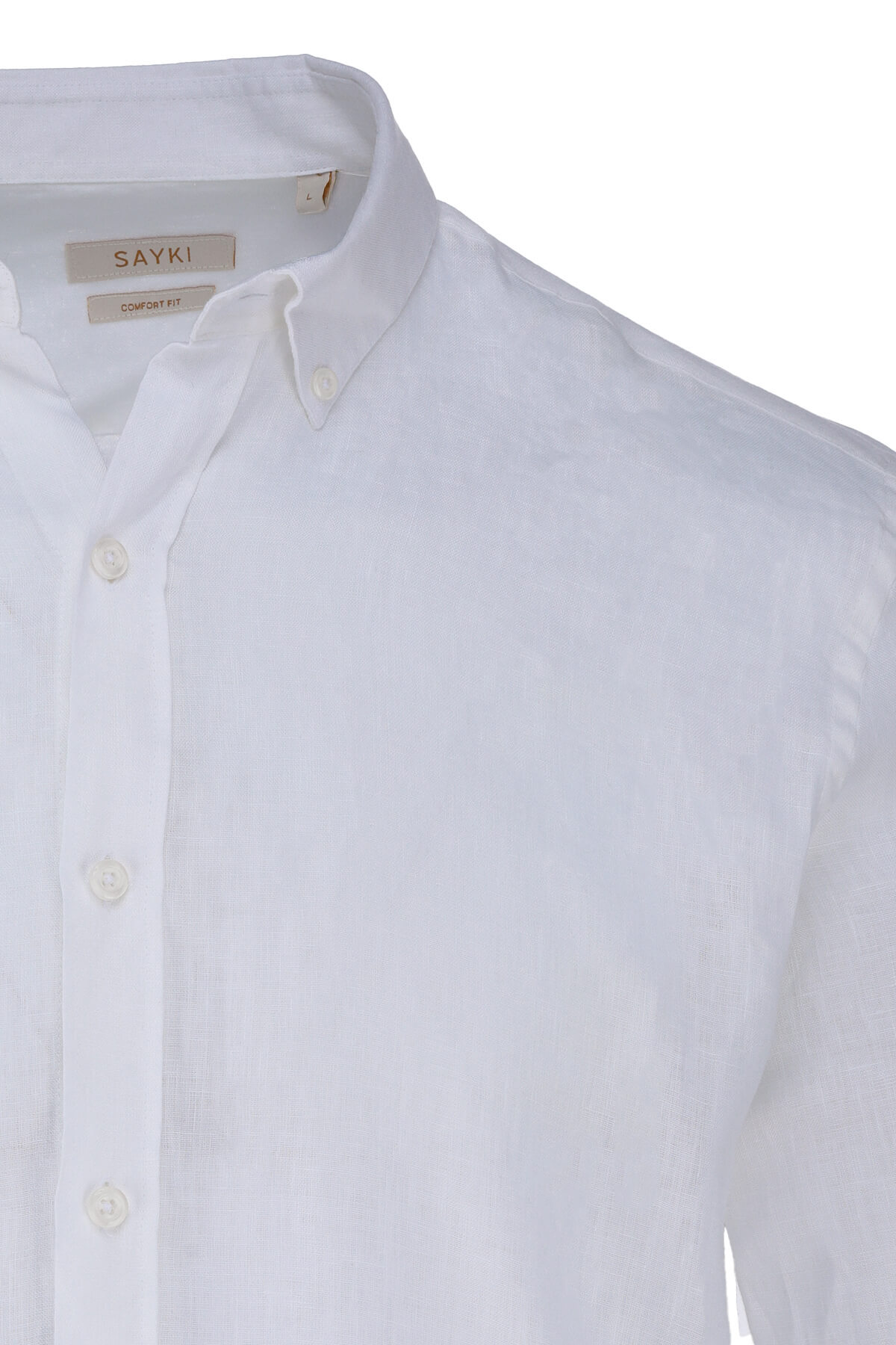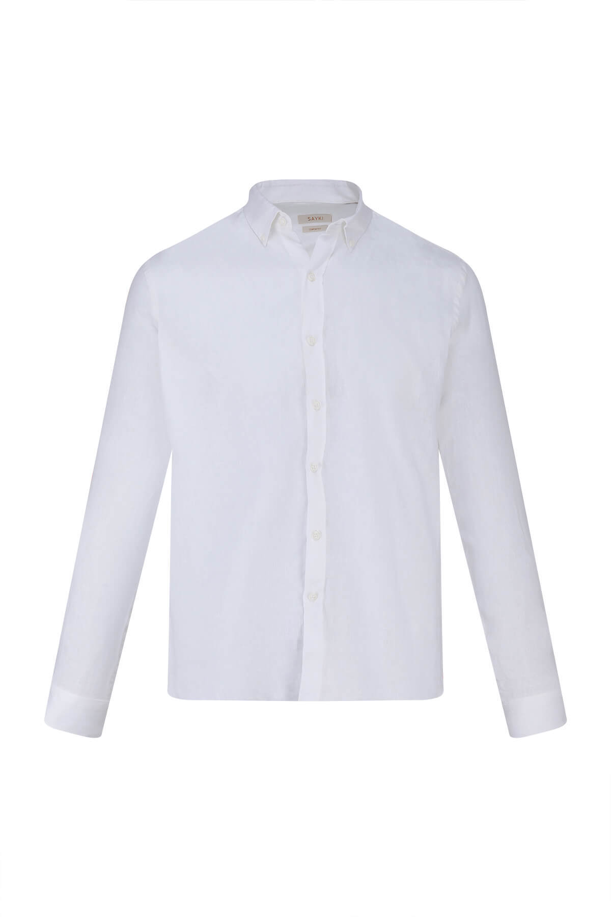 Beyaz Comfort Fit 100% Keten Düğmeli Yaka Uzun Kollu Keten Gömlek