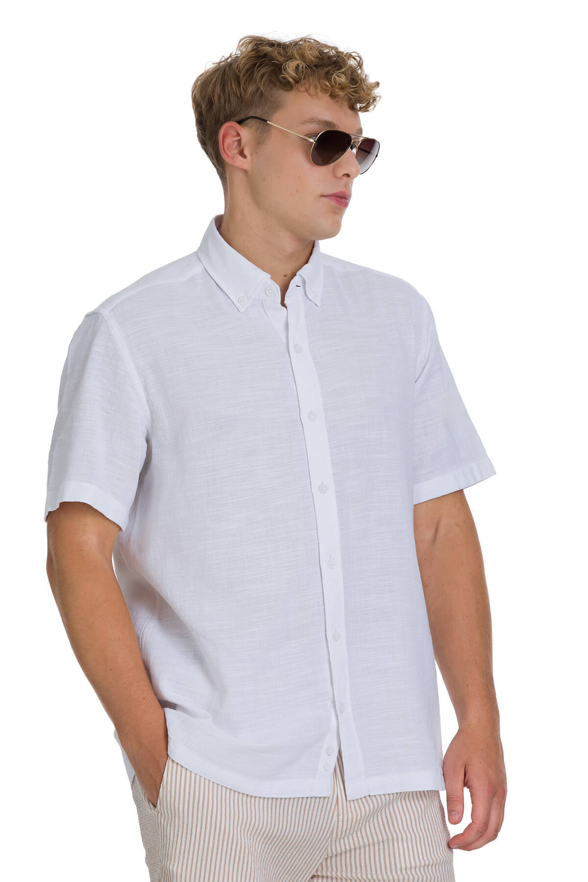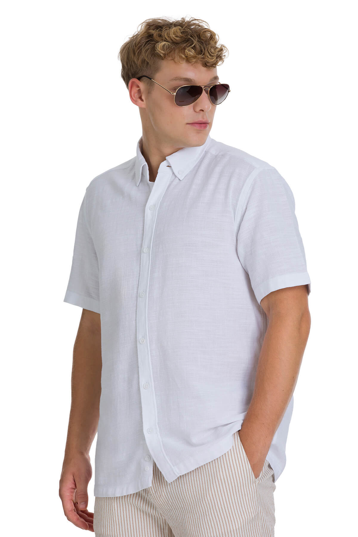 Beyaz Comfort Fit 100% Pamuk Düğmeli Yaka Kısa Kollu Pamuk Gömlek