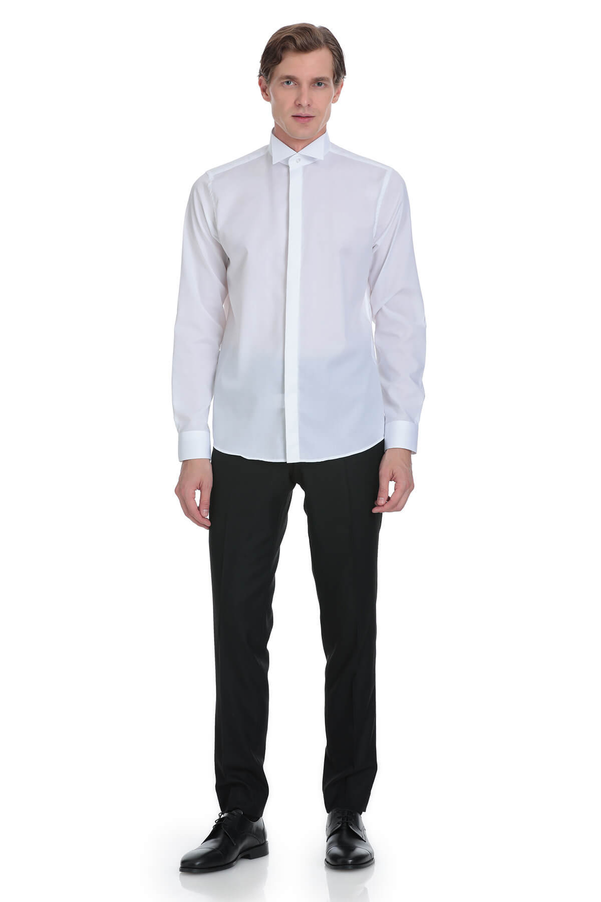 Beyaz Comfort Fit Ata Yaka 100% Pamuk Uzun Kollu Damatlık Gömlek