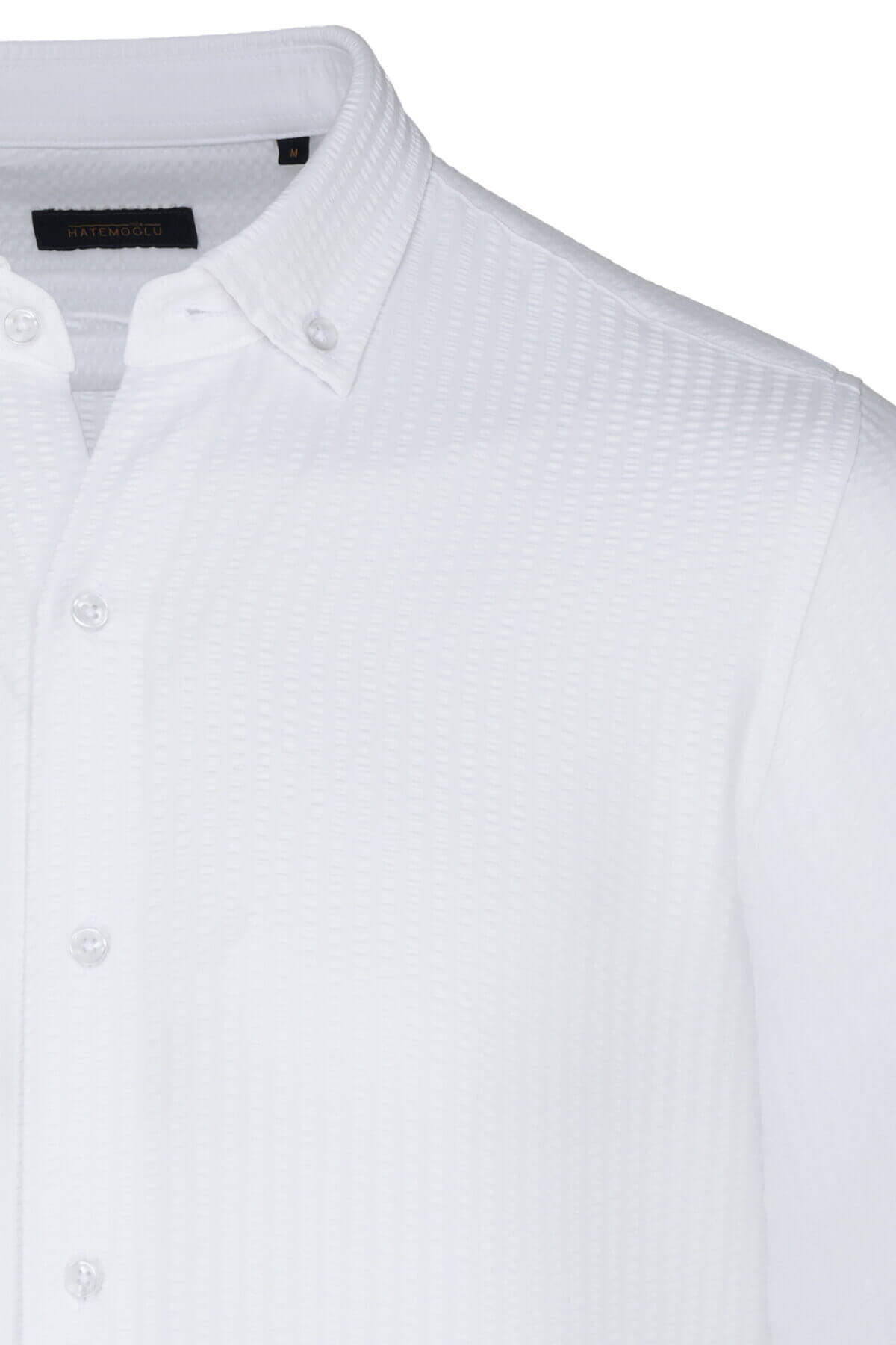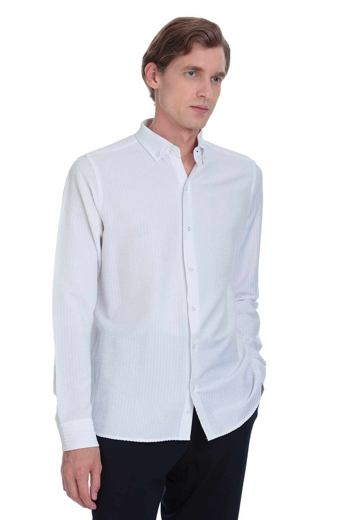 Beyaz Comfort Fit Düğmeli Yaka Gömlek, modern erkeğin hem iş hem de günlük hayatında rahatlıkla tercih edebileceği, zamansız bir şıklık sunar. Viskonun yumuşak dokusu, polyesterin dayanıklılığı ve elastanın esnekliğiyle birleşen özel kumaşı (%62 Viskon, %36 Polyester, %2 Elastan) sayesinde, gün boyu süren konforlu bir kullanım sağlar. Düz deseni ve zarif düğmeli yaka detayları, bu gömleği gardırobunuzun vazgeçilmez bir parçası haline getirir.