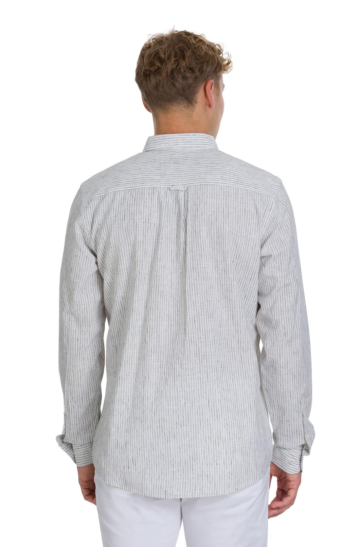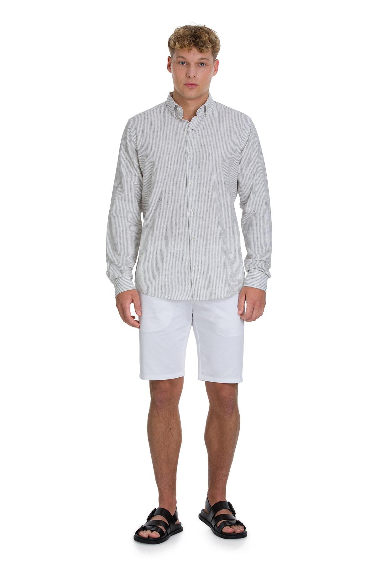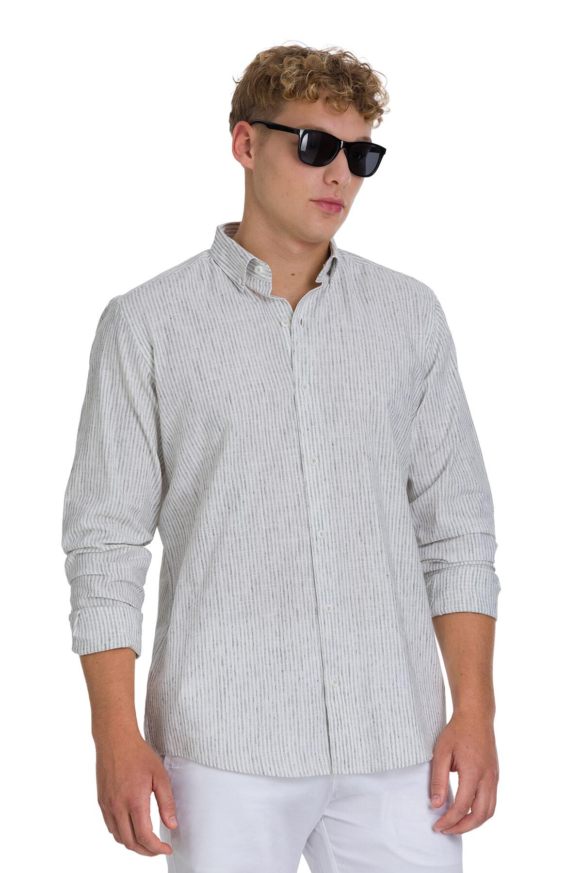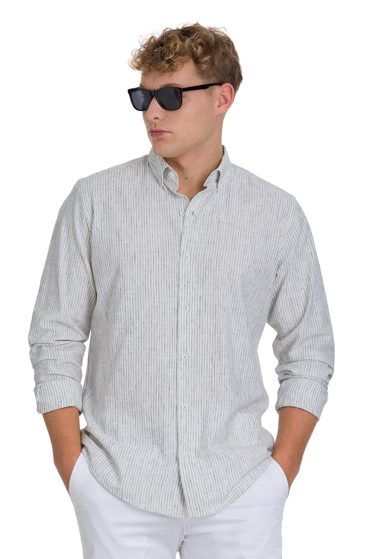 Gri Comfort Fit Çizgili Düğmeli Yaka Pamuk-Keten Uzun Kollu Gömlek