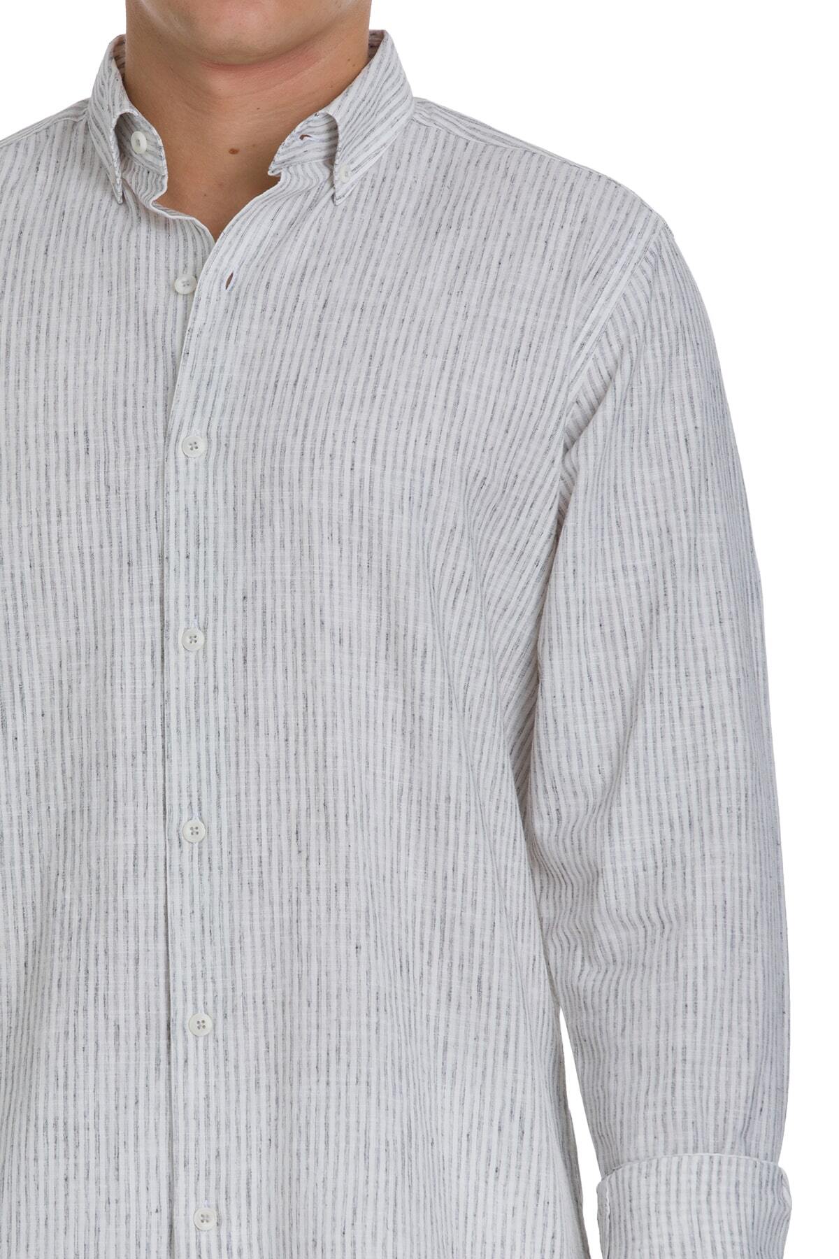 Gri Comfort Fit Çizgili Düğmeli Yaka Pamuk-Keten Uzun Kollu Gömlek - 5