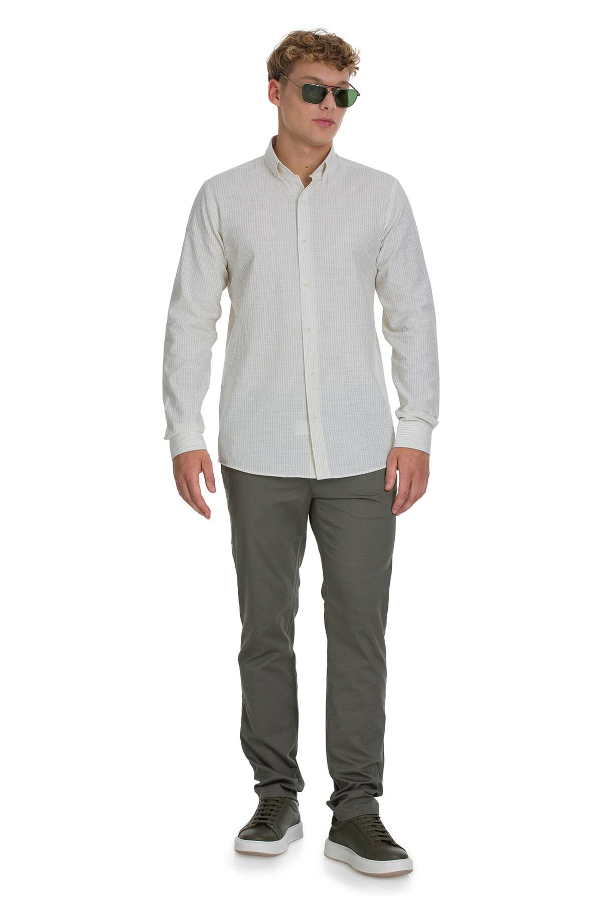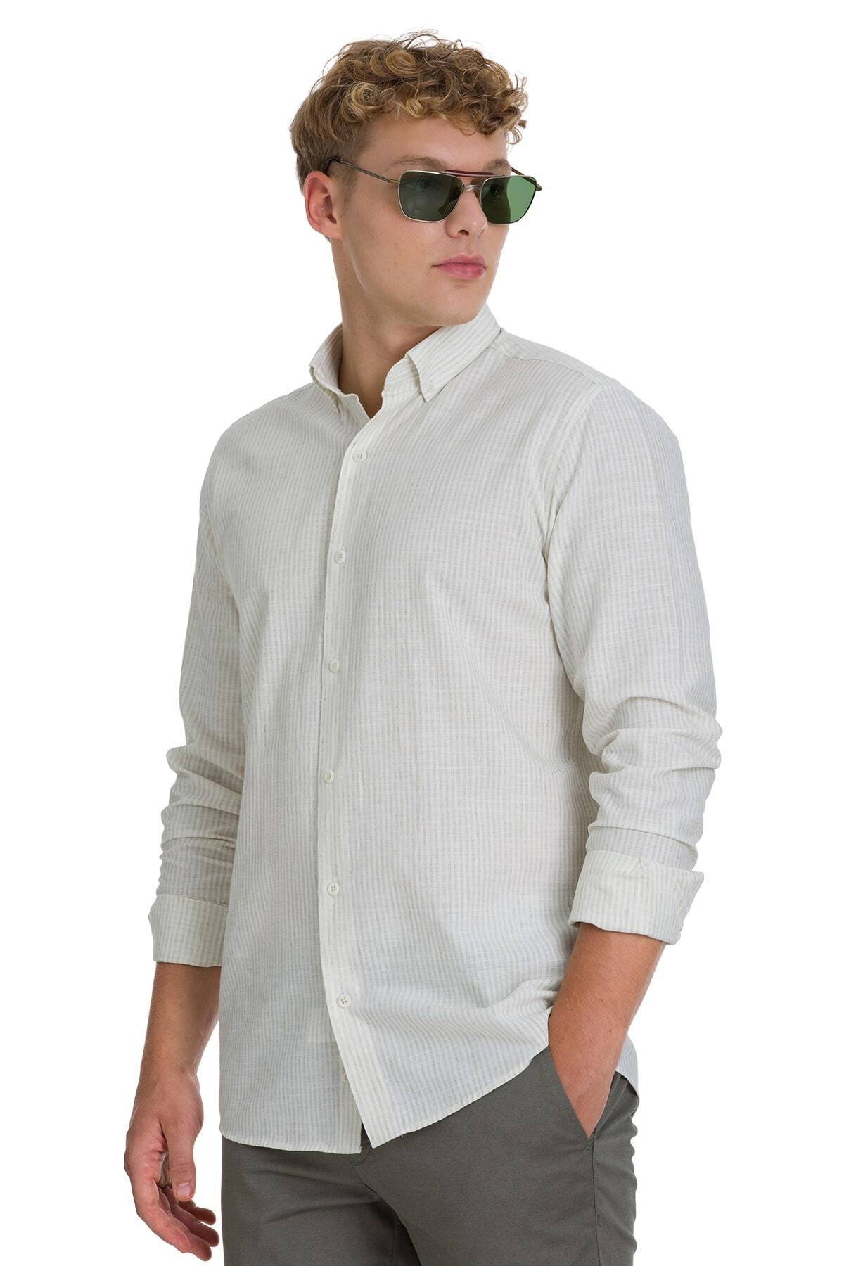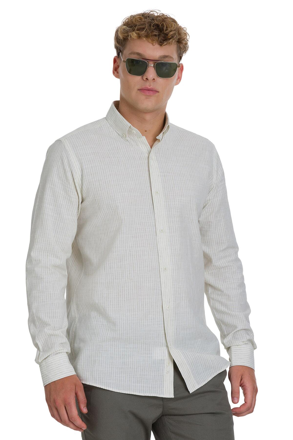 Haki Comfort Fit Çizgili Düğmeli Yaka Pamuk-Keten Uzun Kollu Gömlek