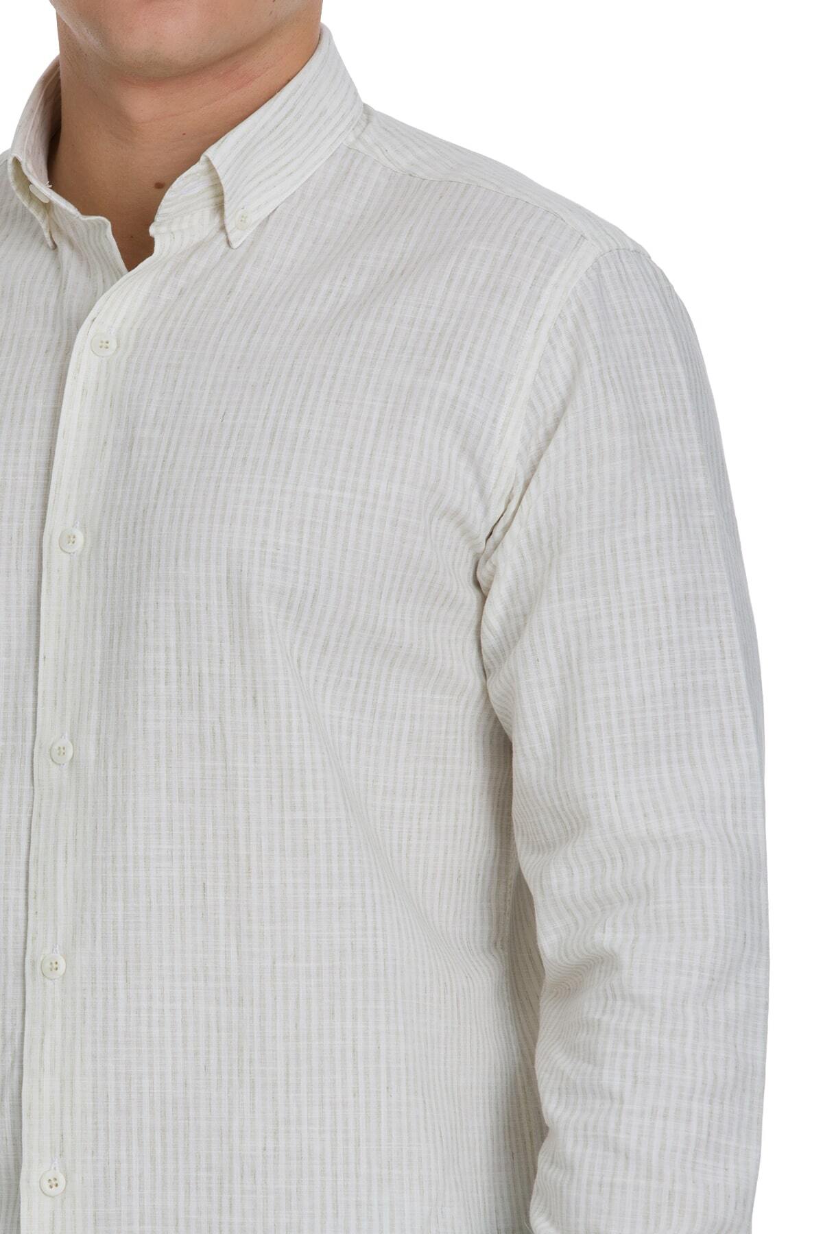 Haki Comfort Fit Çizgili Düğmeli Yaka Pamuk-Keten Uzun Kollu Gömlek - 5