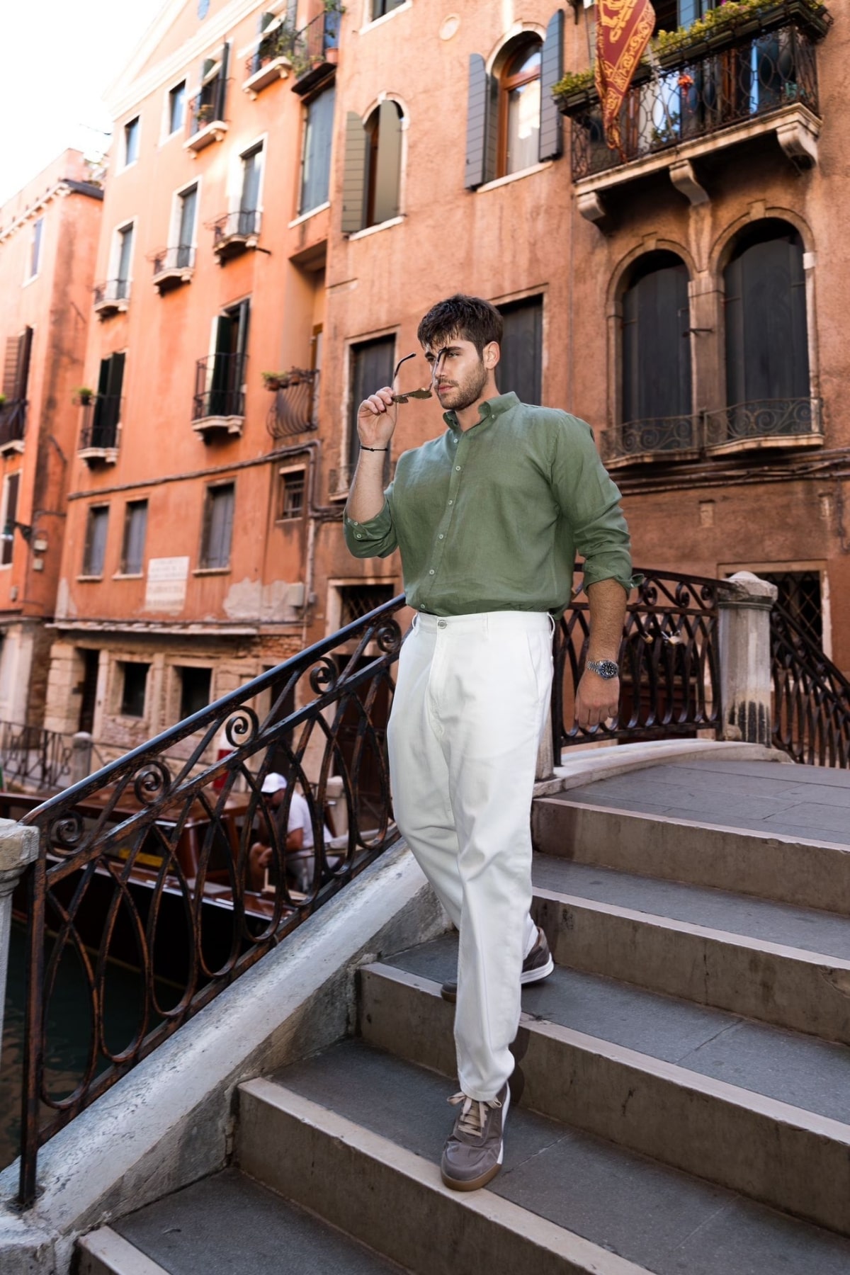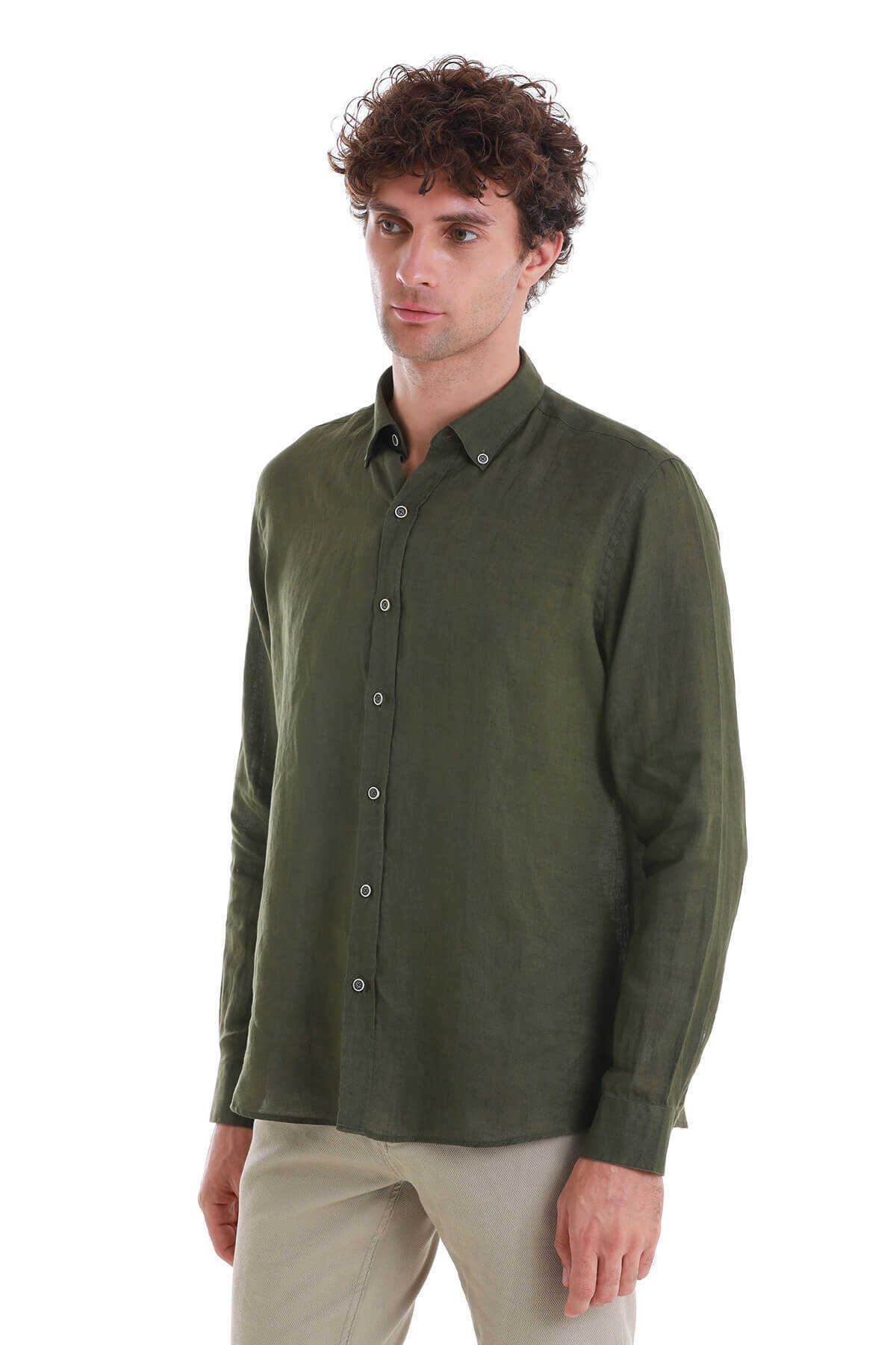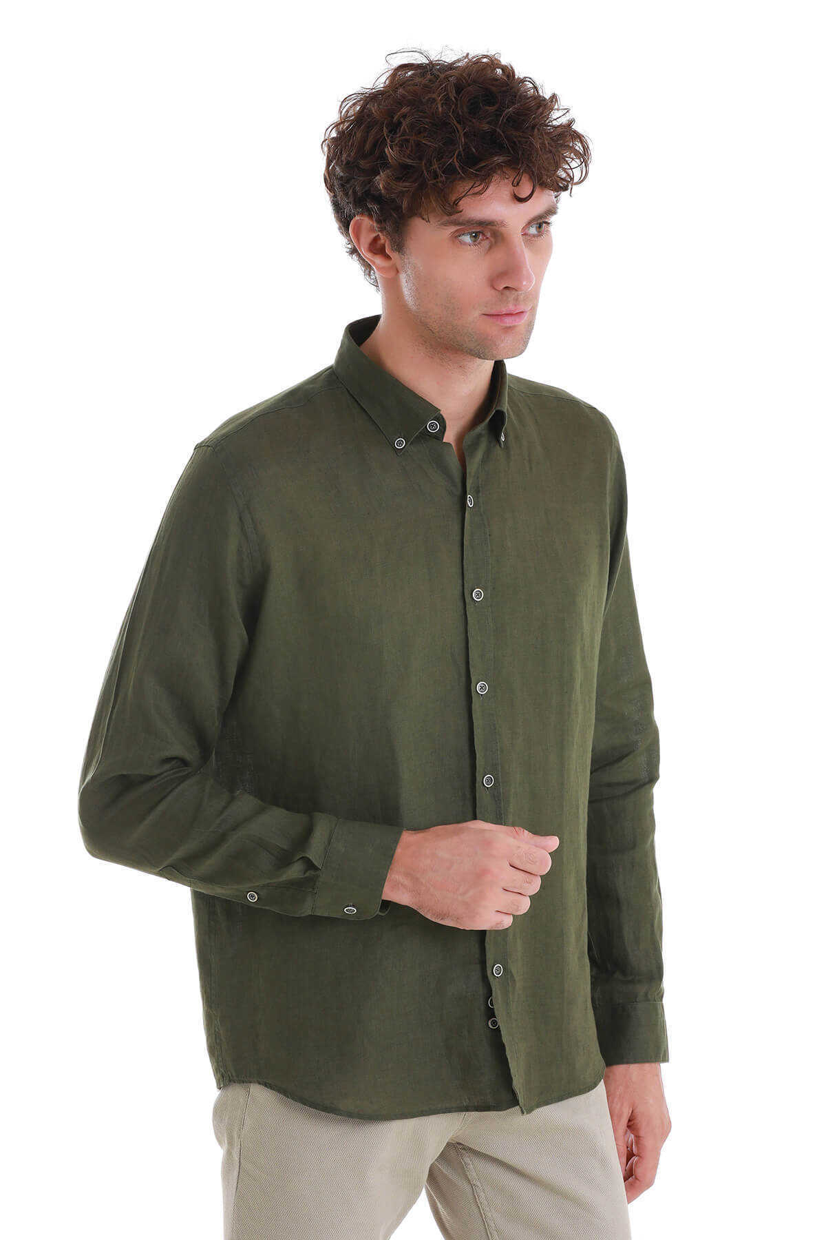 Haki Comfort Fit Düğmeli Yaka Uzun Kollu Keten Gömlek