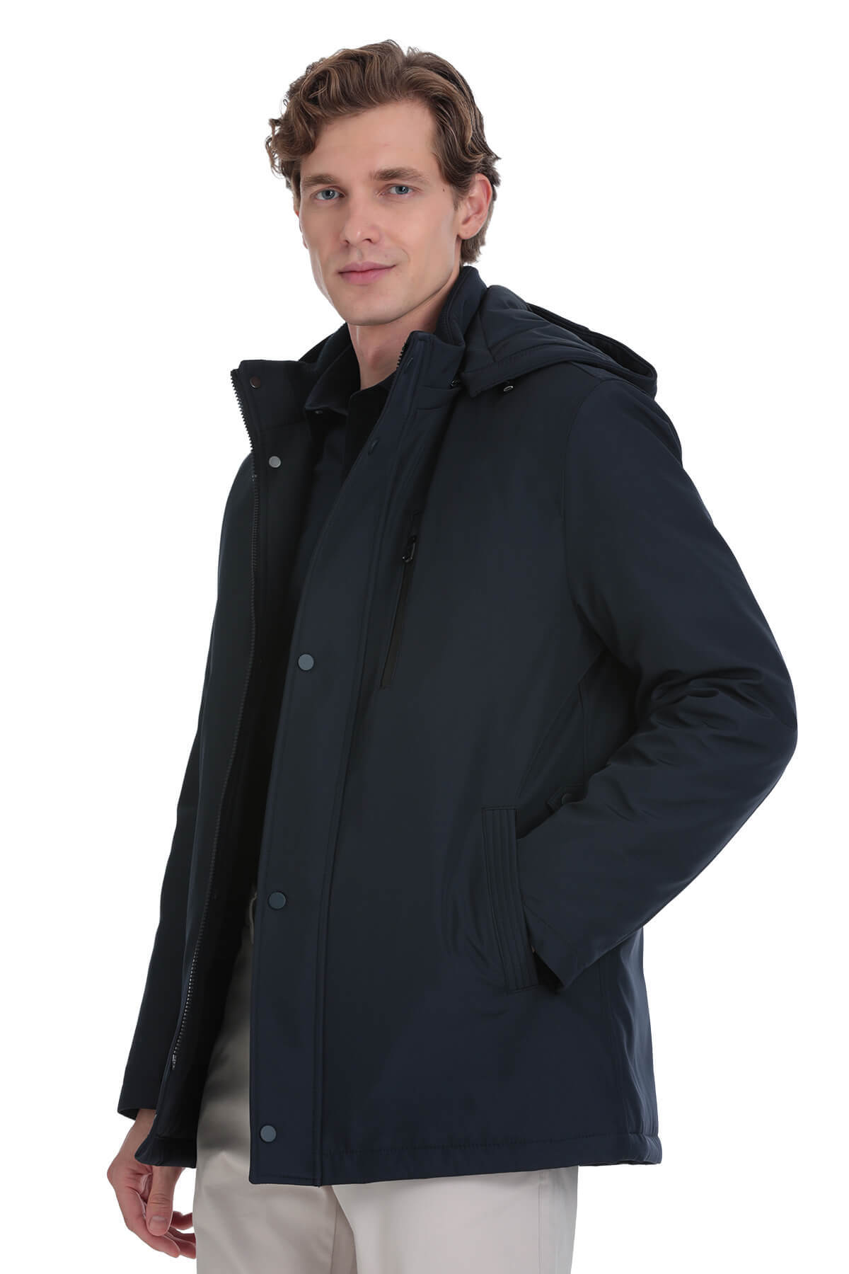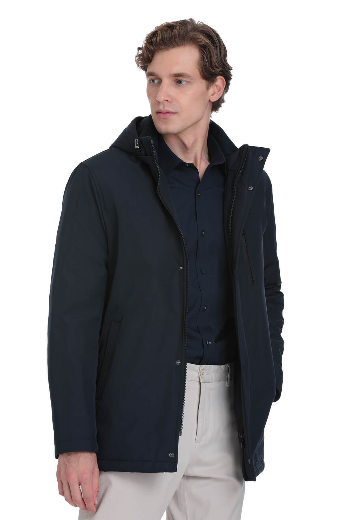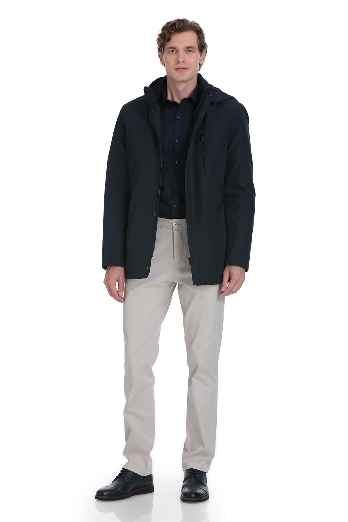 Lacivert Regular Fit Hakim Yaka Kapüşonlu Kaban