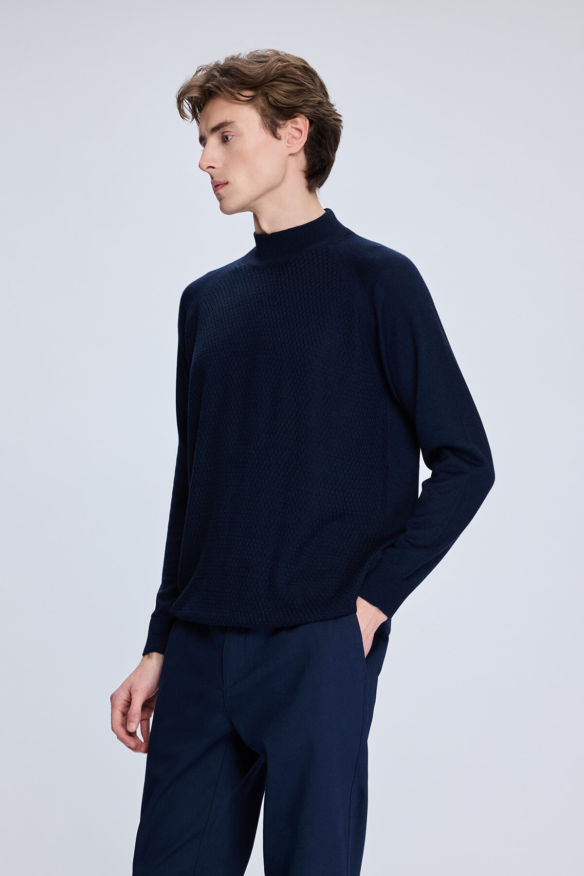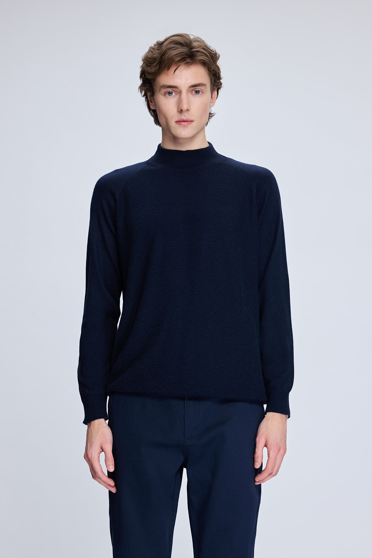 Lacivert Regular Fit Jakarlı Yarım Balıkçı Yaka Yünlü Kazak
