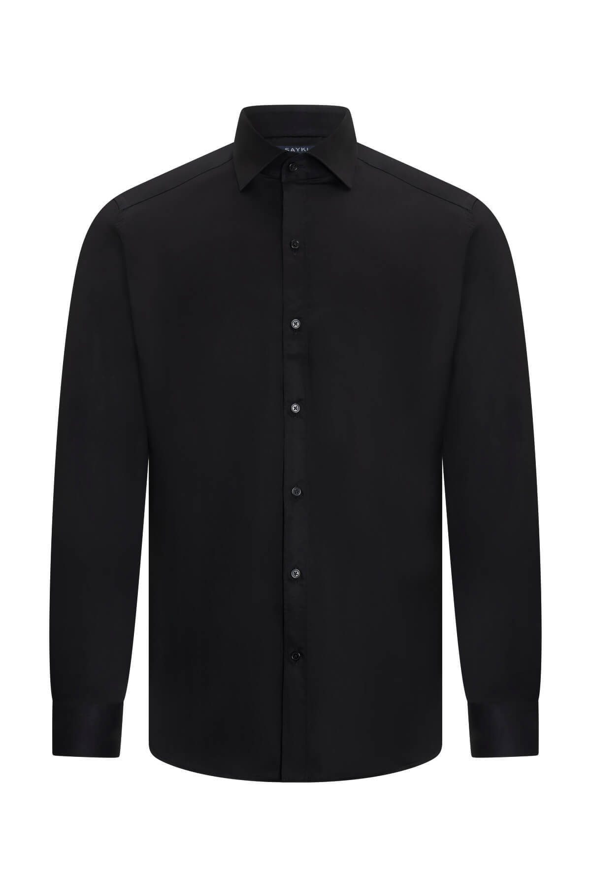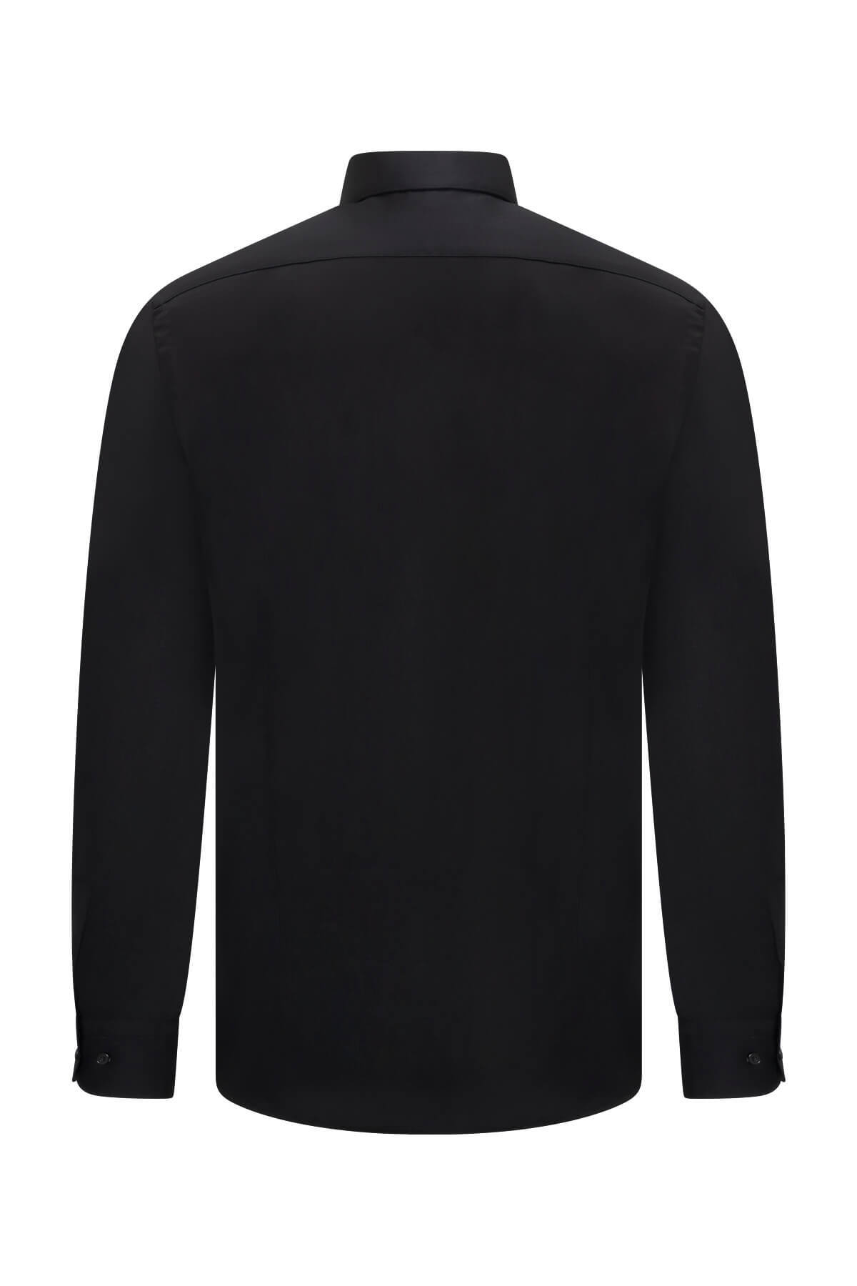 Siyah Comfort Fit Slim Yaka Gömlek, modern ve zamansız bir tarz sunar. %100 pamuk kumaşı sayesinde doğal, nefes alabilen ve rahat bir kullanım sağlar. Comfort Fit kalıbı ve cepsiz tasarımıyla sade ve şık bir görünüm sunar.