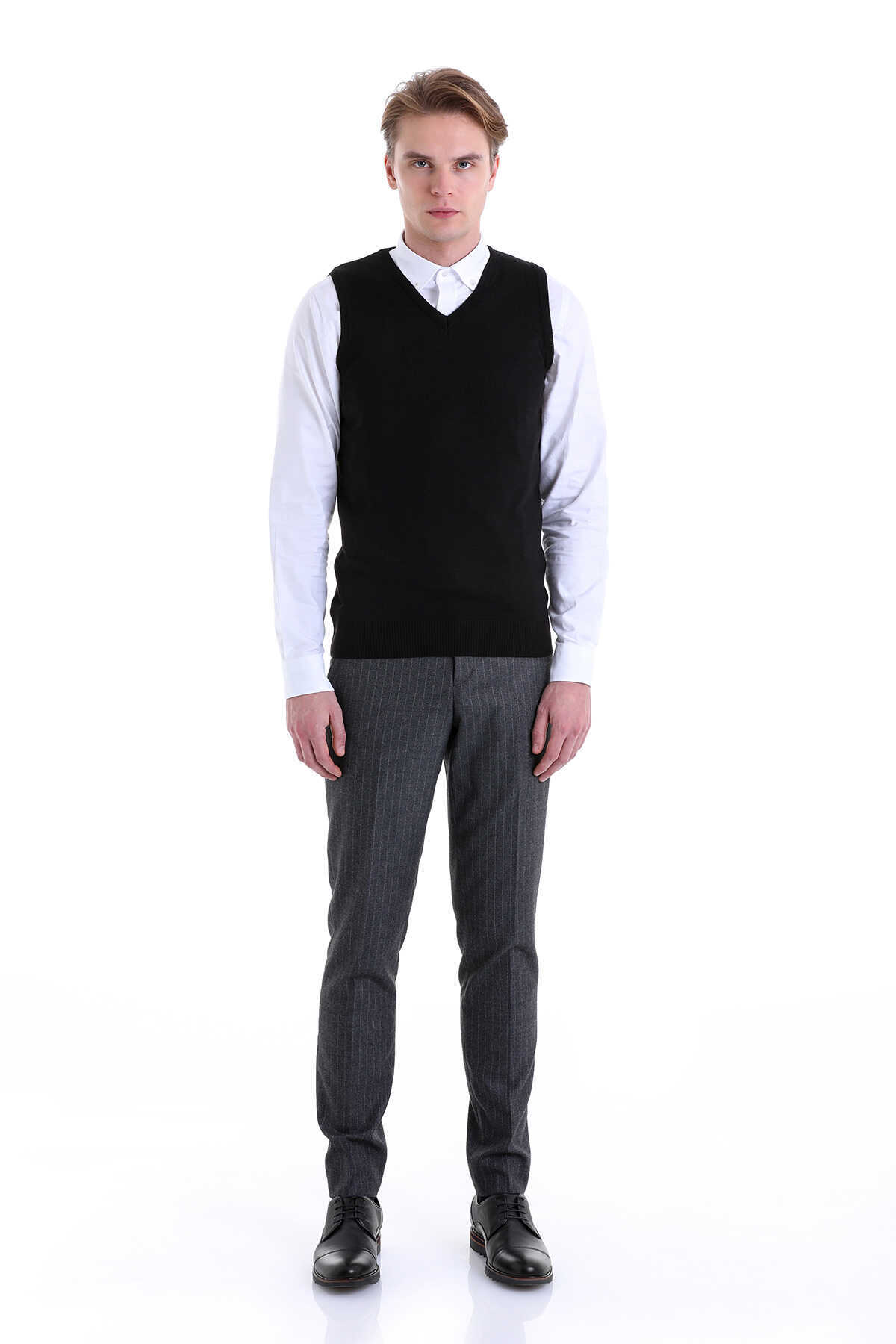 Siyah Comfort Fit V Yaka Yünlü Triko Süveter