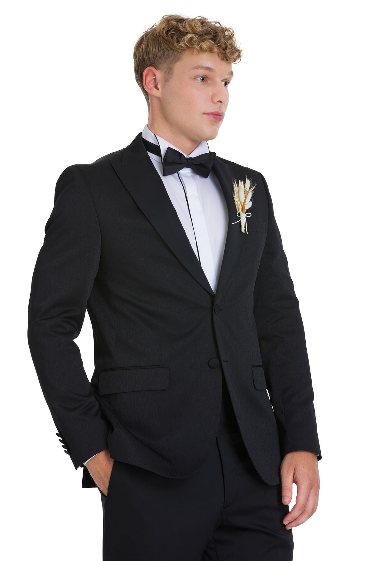 Siyah Slim Fit Çıkma Sivri Yaka Klasik Damatlık, damatlık ve smokin koleksiyonunun gözde parçasıdır. Geleneksel siyah rengi ve modern Slim Fit (vücuda oturan) kalıbı ile şıklığı ve karizmayı birleştirir. Takımın öne çıkan detayı, klasik ve gösterişli bir görünüm sunan Çıkma Sivri Yaka'dır.