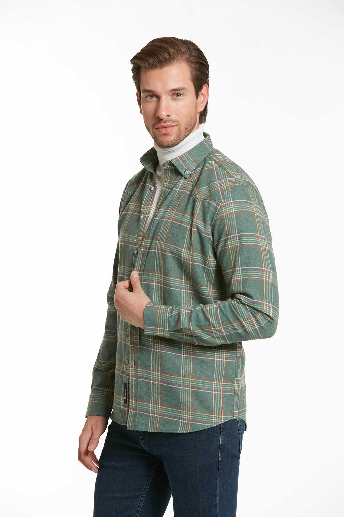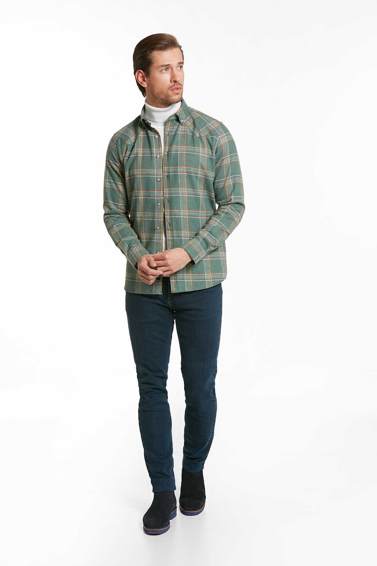 Yeşil Slim Fit Kareli Düğmeli Yaka Uzun Kollu Casual Flanel Gömlek