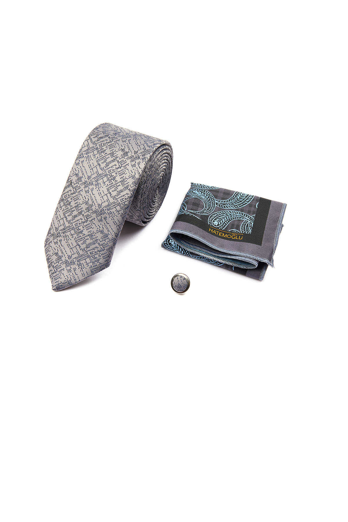 Antrasit Üçlü Yaka Rozeti Kravat Mendil Set