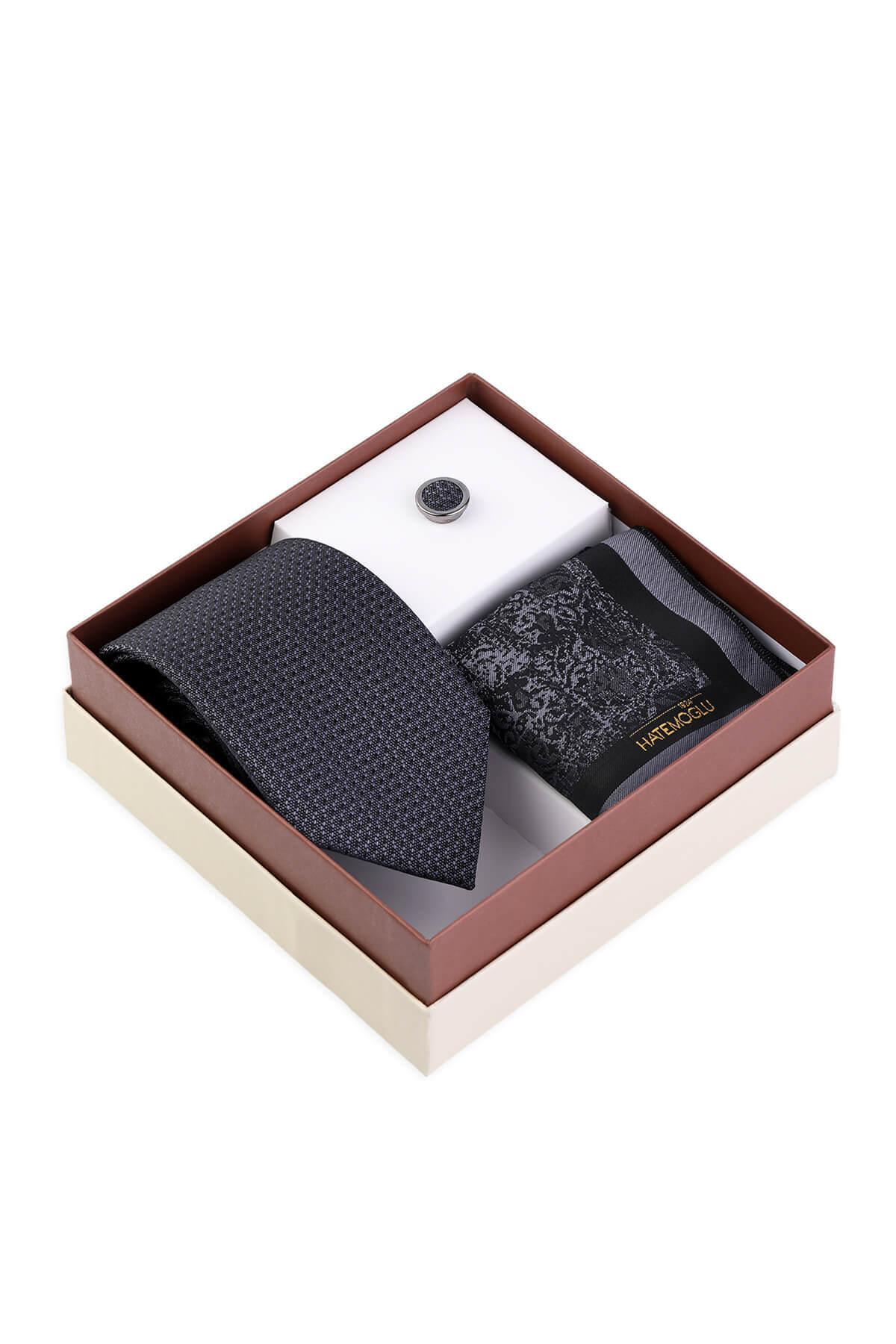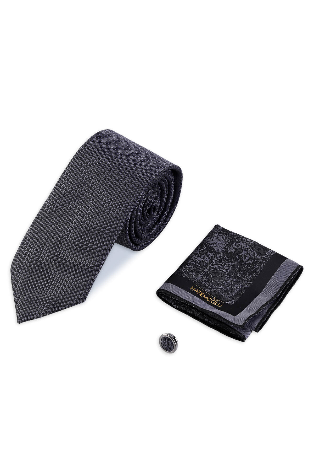 Antrasit Kravat Mendil ve Yaka Rozeti 3'lü Set