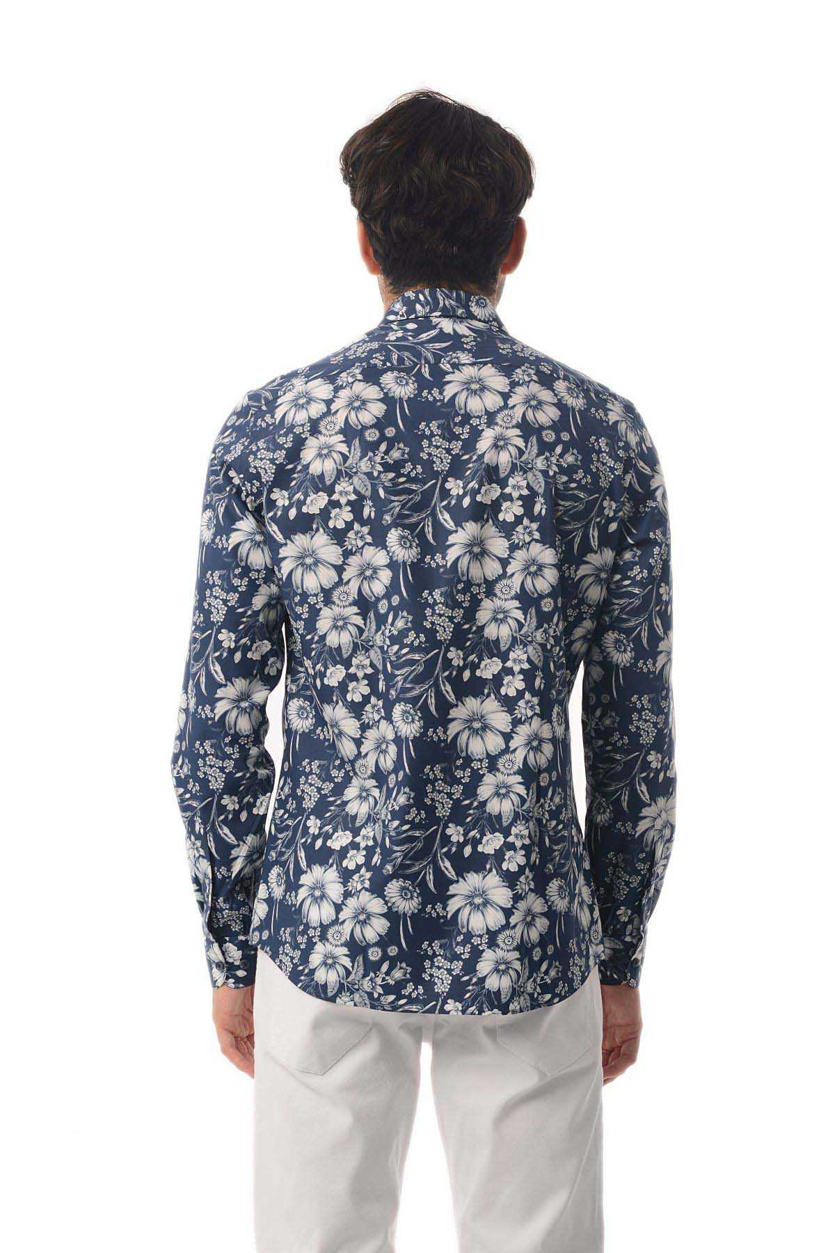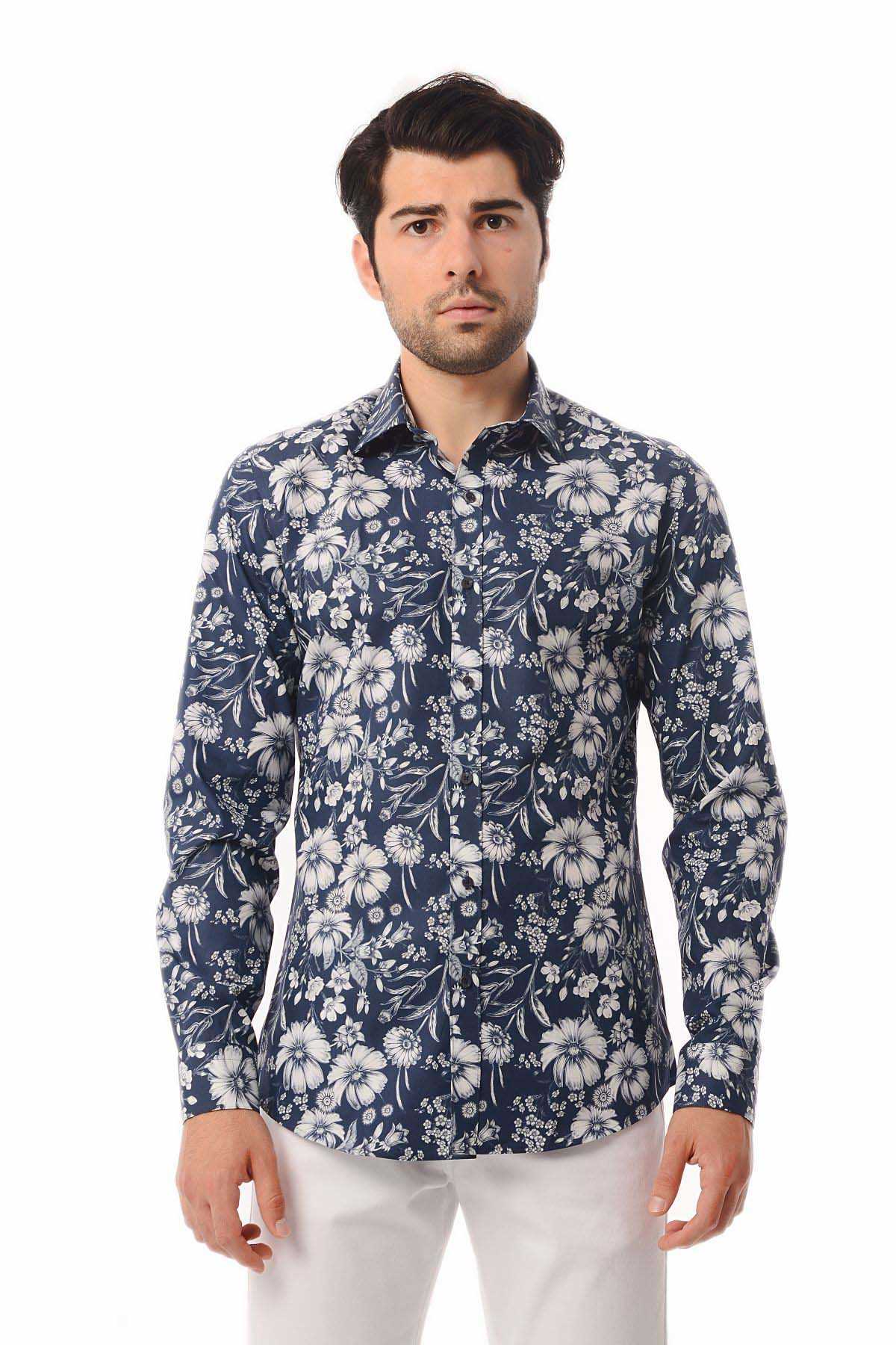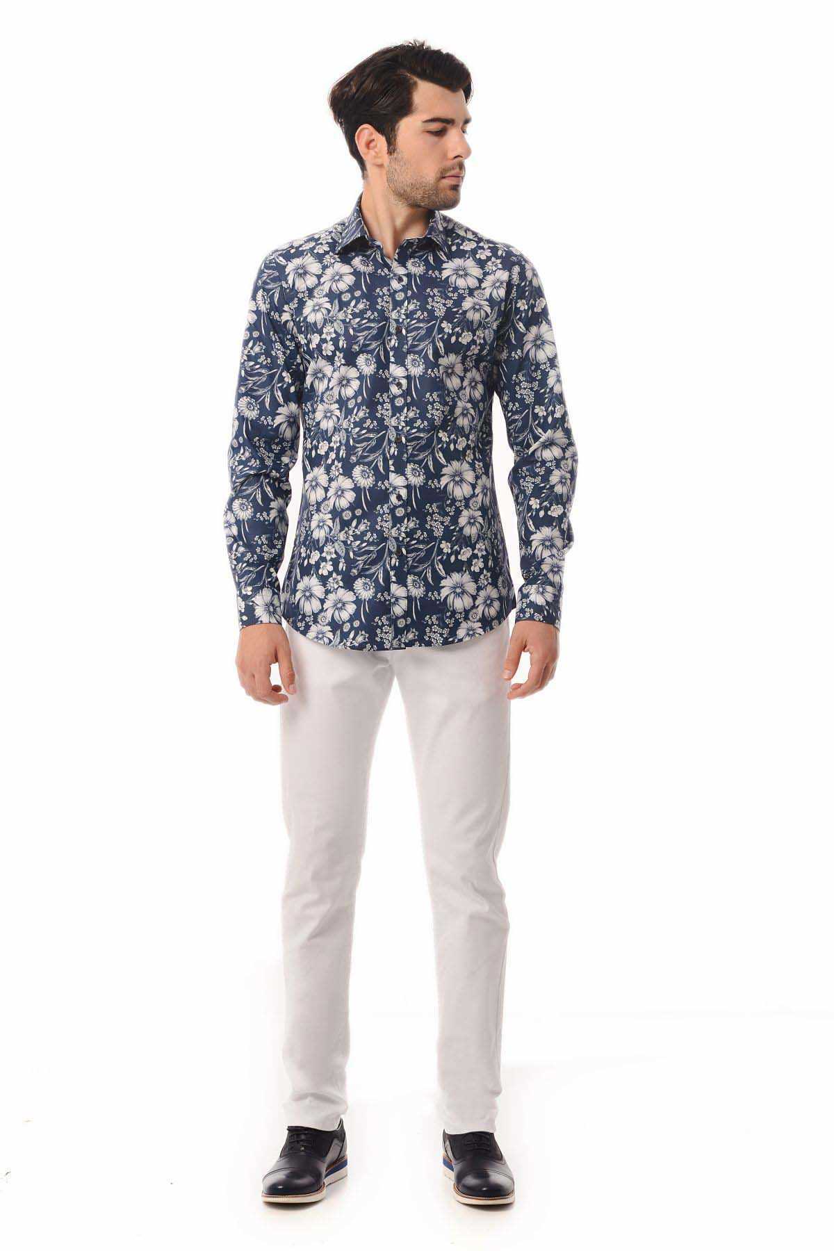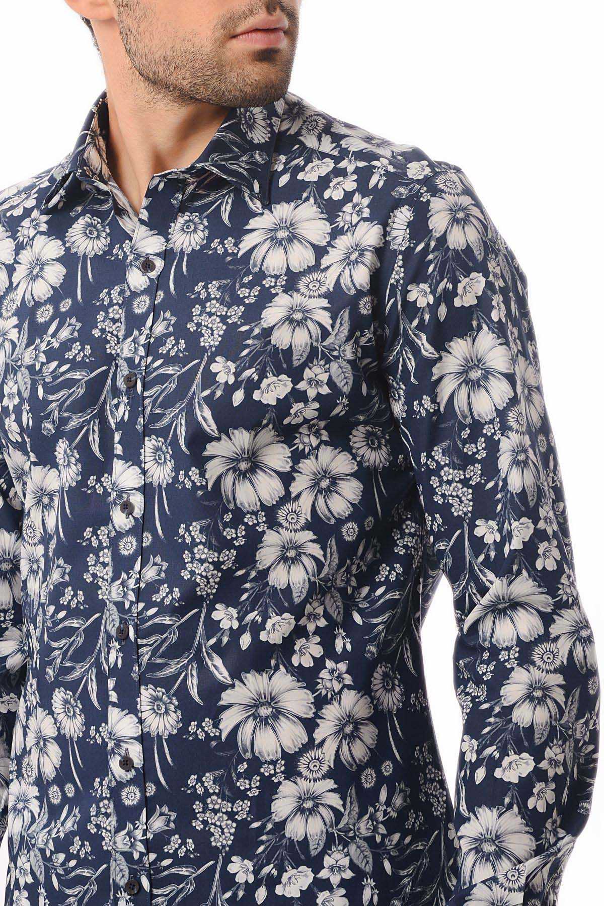 Baskılı Slim Fit Lacivert Gömlek