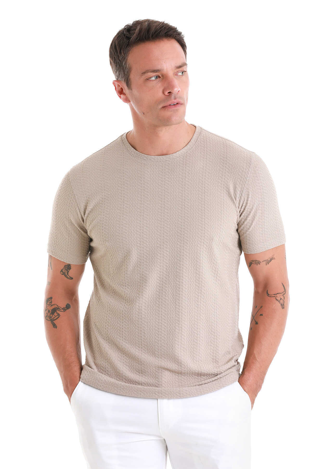 Bej Regular Fit Jakarlı Bisiklet Yaka Tişört
