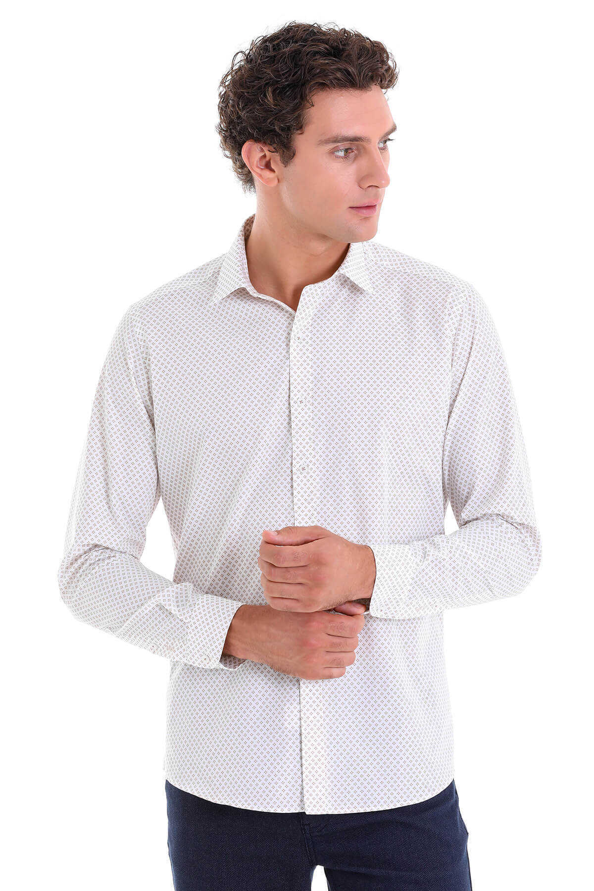 Bej Slim Fit Baskılı 100% Pamuk Slim Yaka Uzun Kollu Casual Gömlek