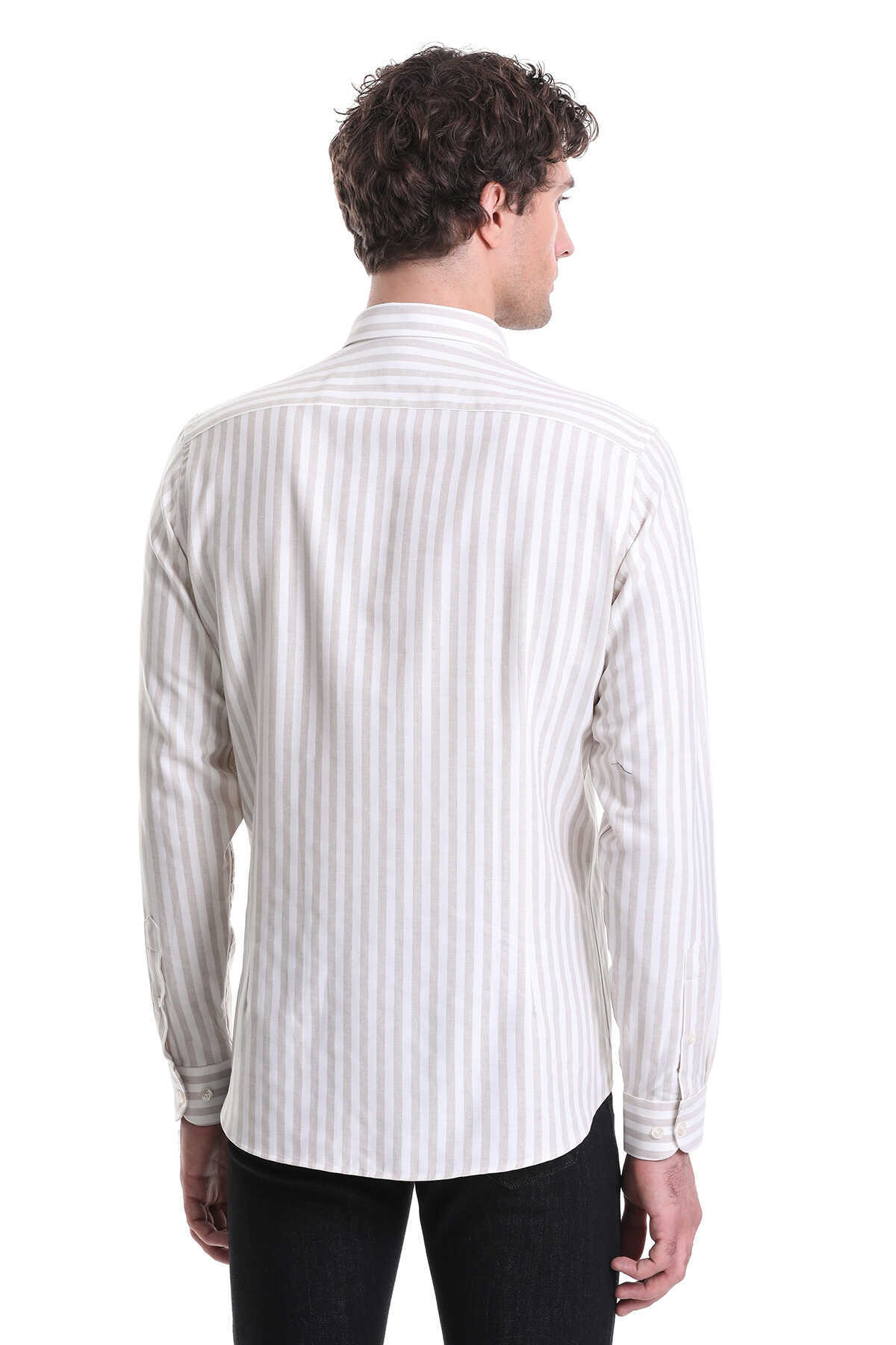 Bej Slim Fit Çizgili Dik Yaka Pamuklu Uzun Kollu Casual Gömlek - 6