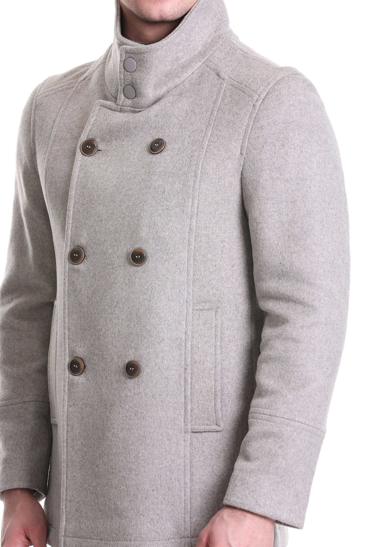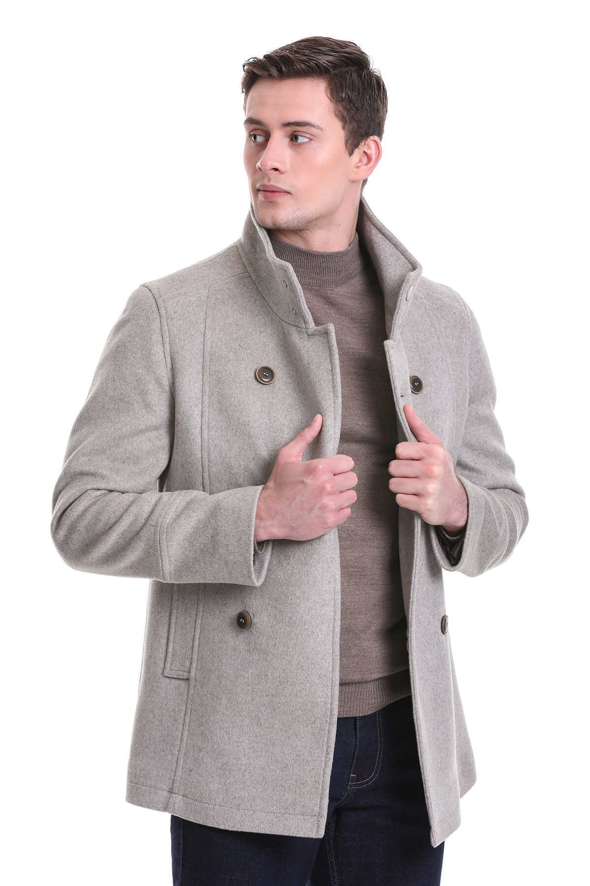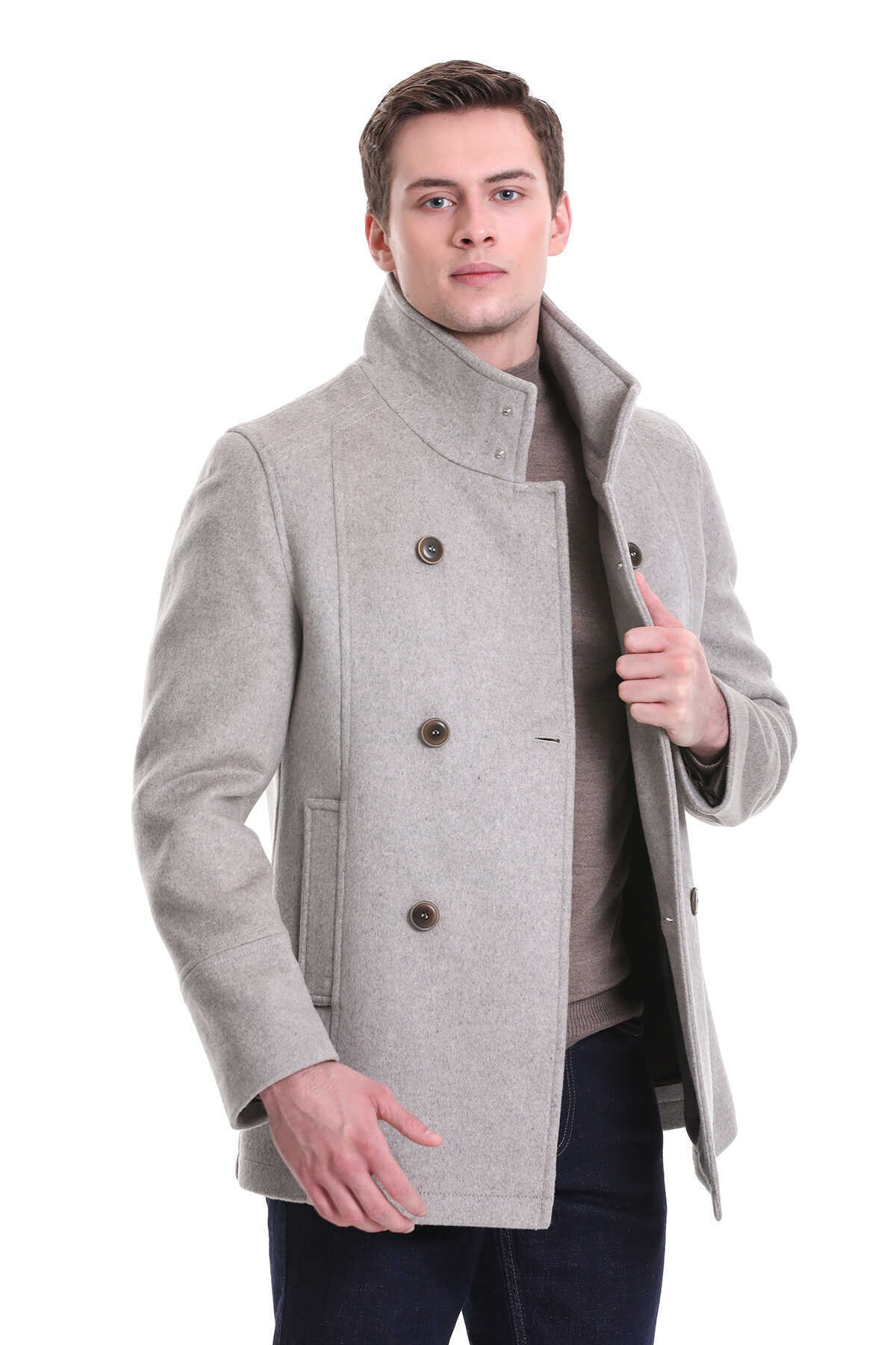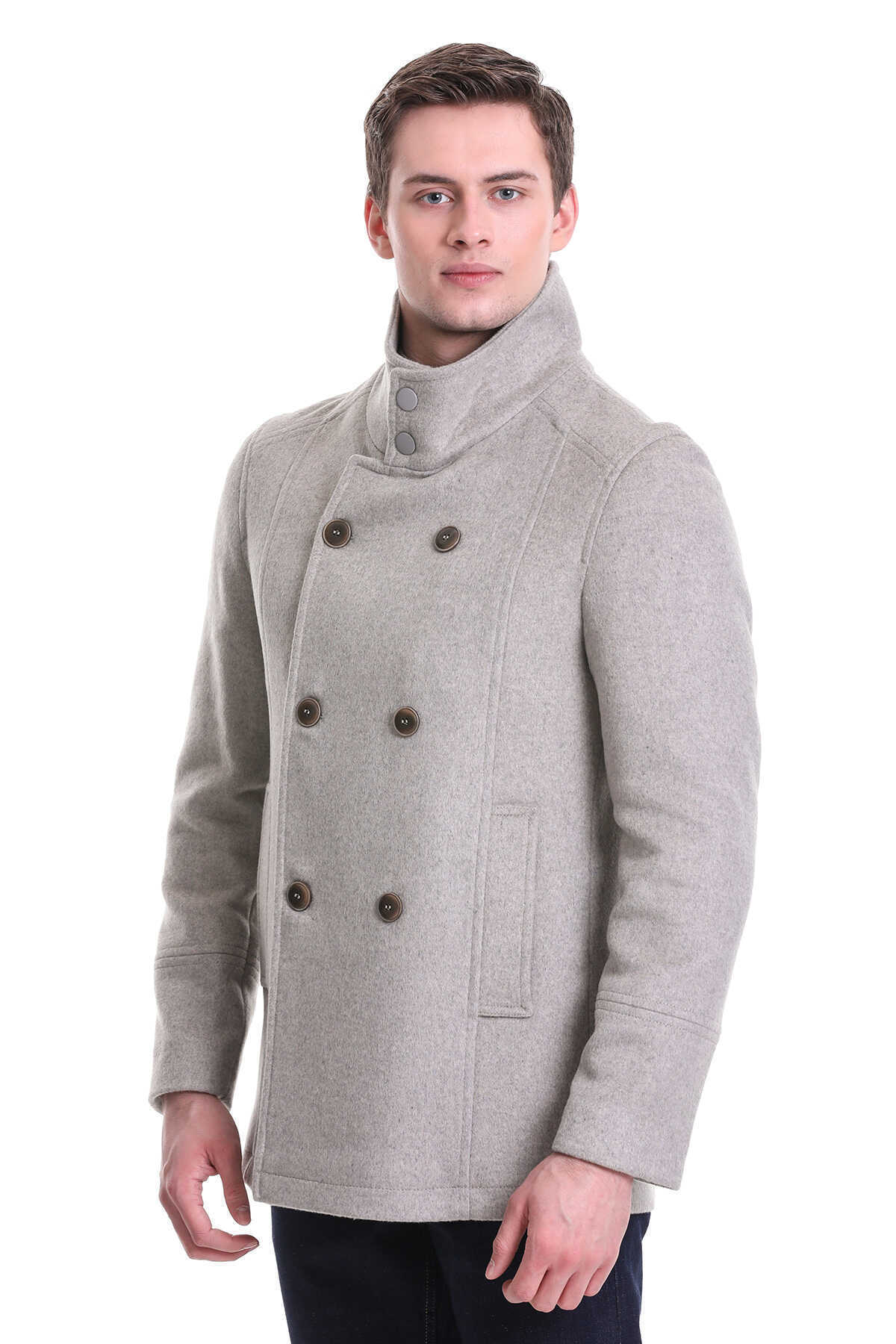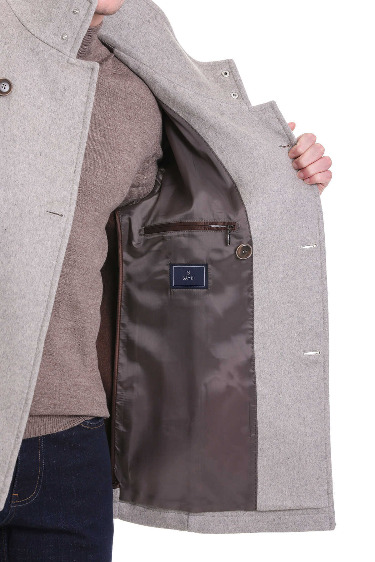 Bej Slim Fit Hakim Yaka Kruvaze Yünlü Kaşe Kaban