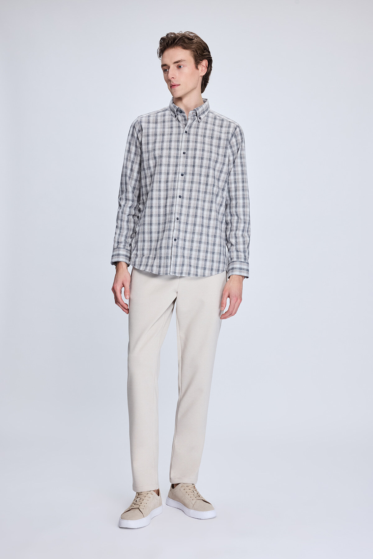 Bej Slim Fit Kareli Düğmeli Yaka Uzun Kollu Pamuklu Gömlek
