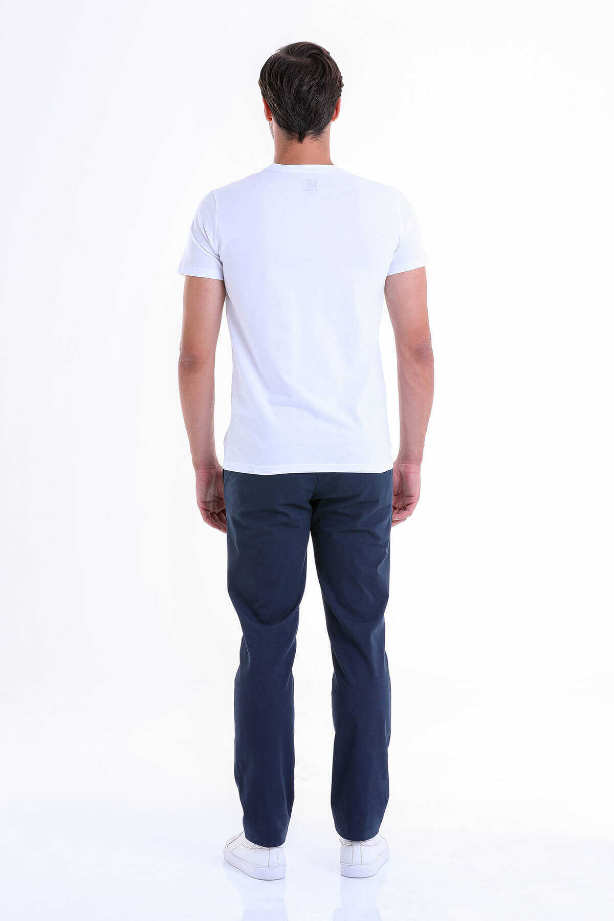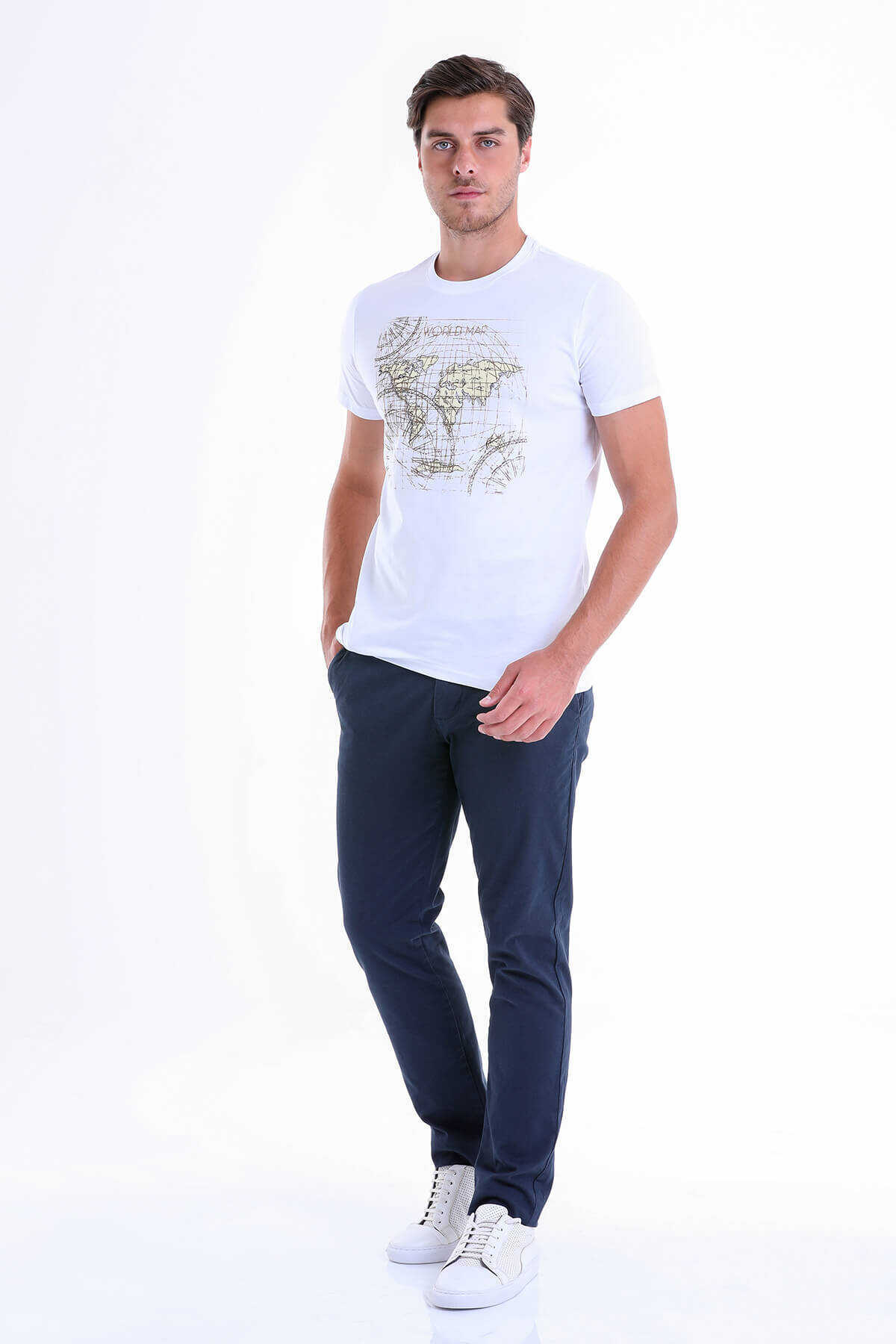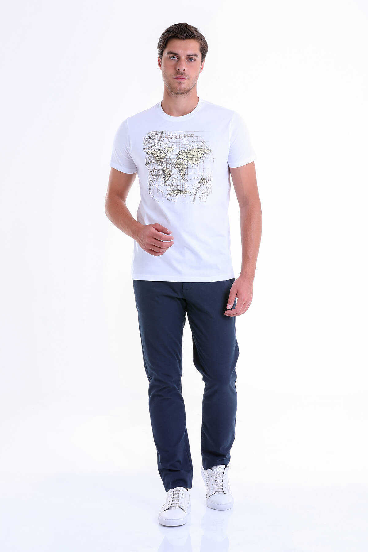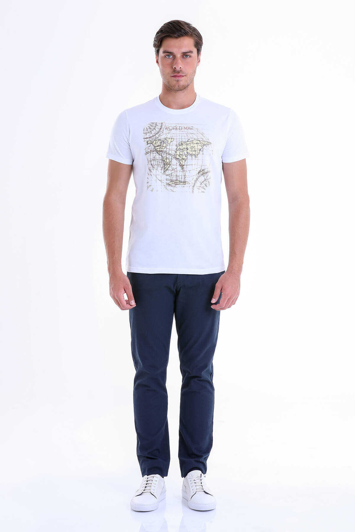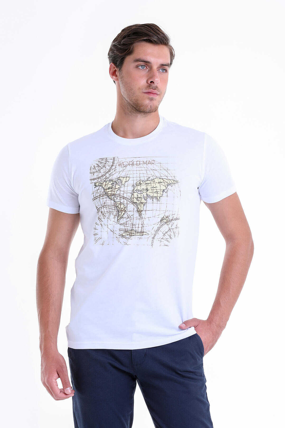 Beyaz Slim Fit Baskılı 100% Pamuk Bisiklet Yaka Tişört