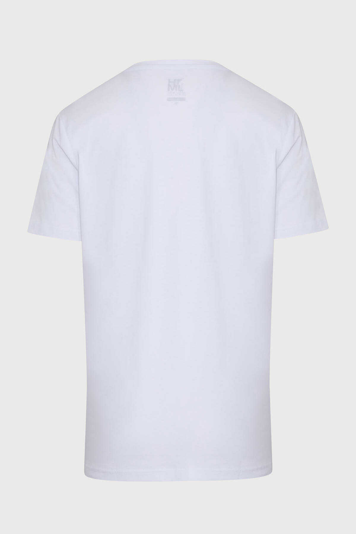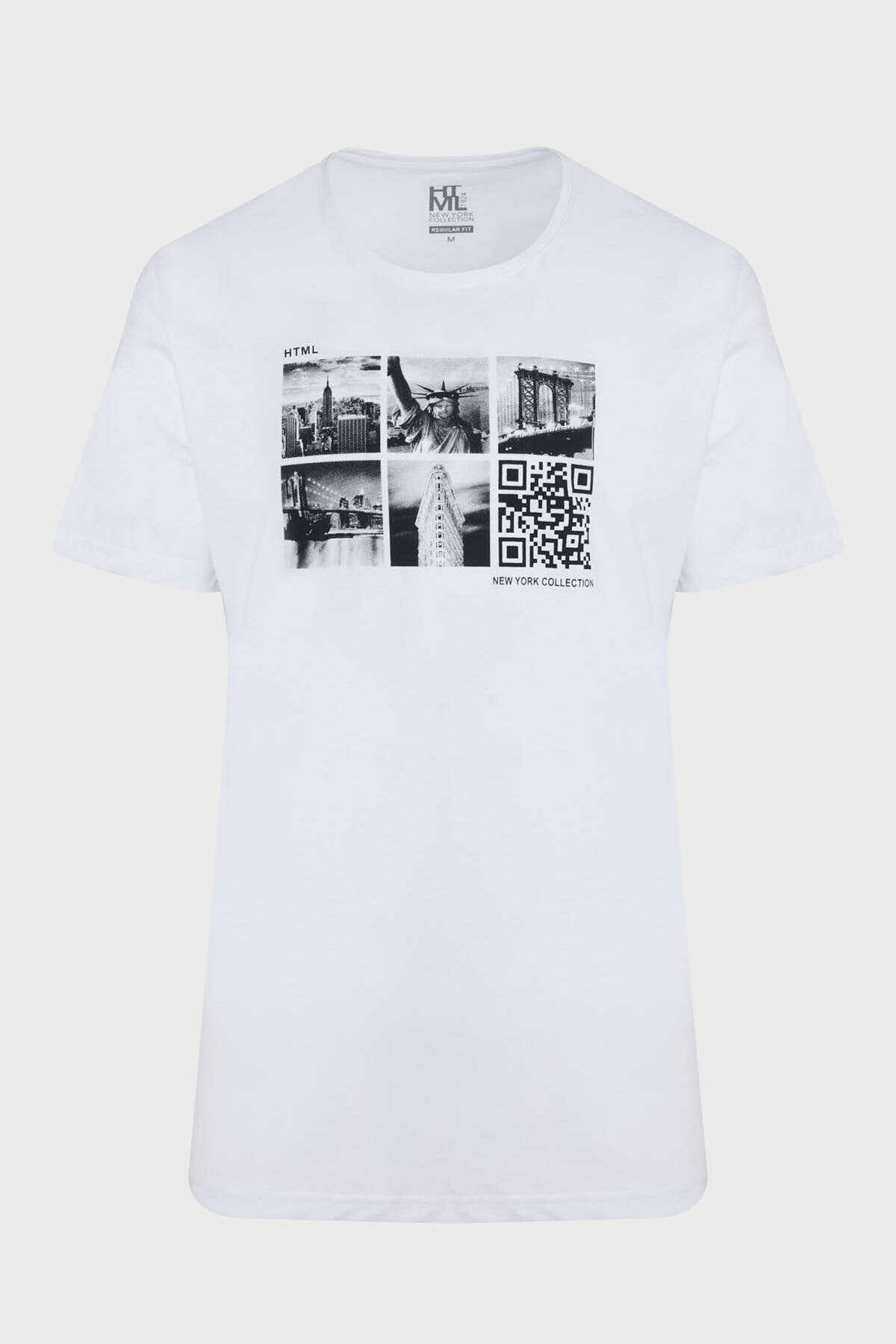 Beyaz Slim Fit Baskılı 100% Pamuk Bisiklet Yaka Tişört