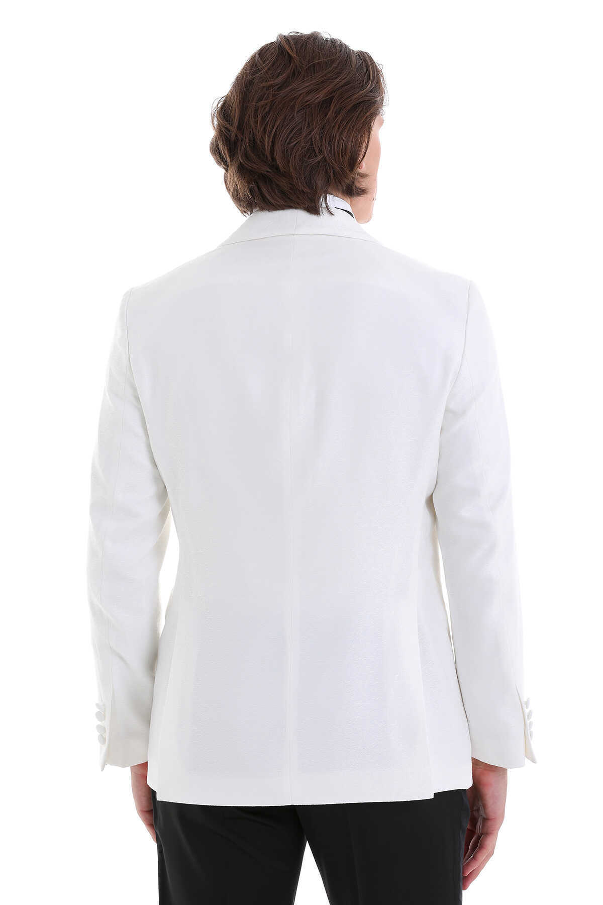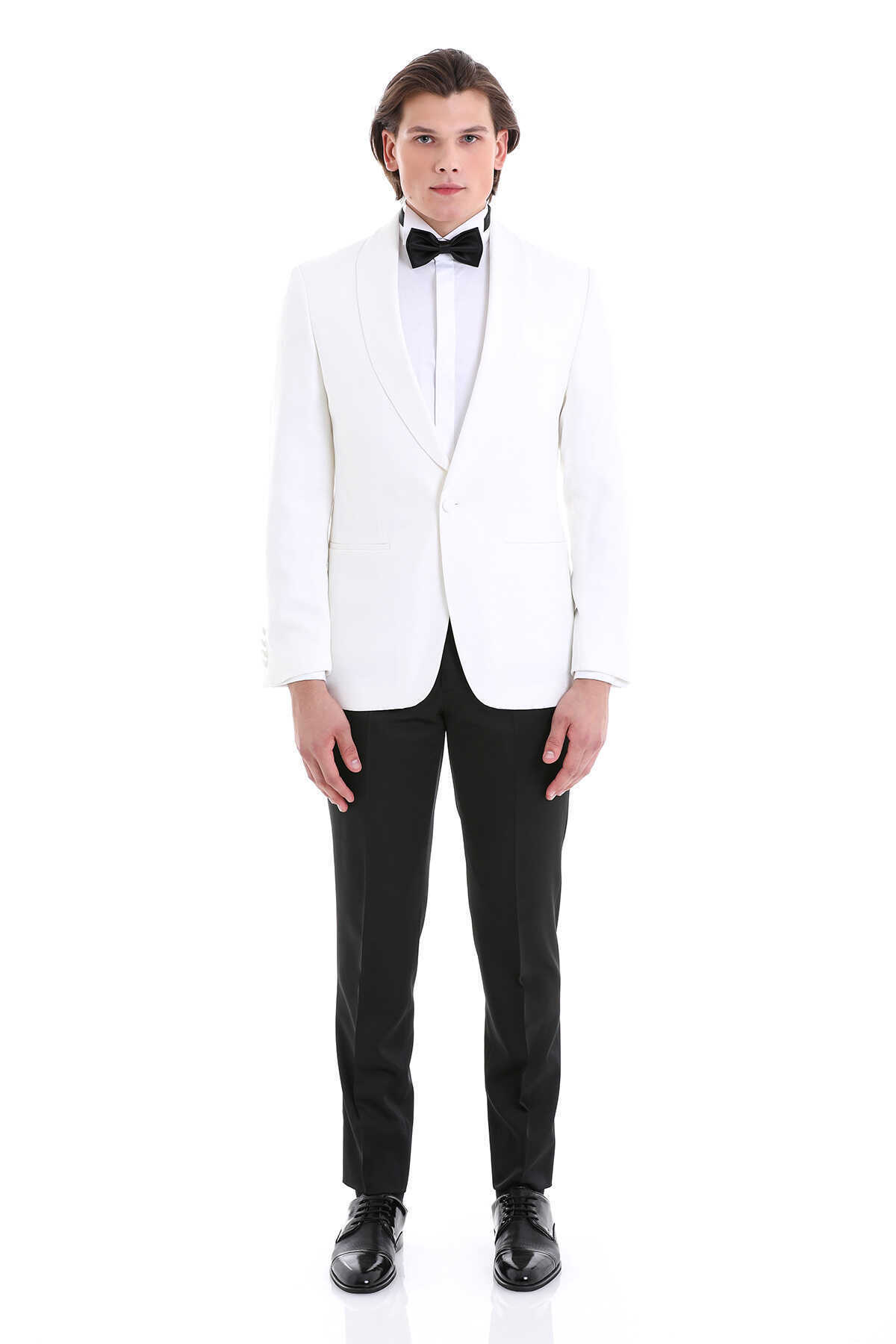 • Beyaz Slim Fit Desenli Şal Yaka Klasik Damatlık / Smokin, beyazın zarafetiyle desenli dokusunu birleştirerek düğün ve özel davetlerde klasik ve göz alıcı bir stil sunar. Slim Fit kalıp sayesinde vücuda tam oturur; desenli kumaş ve şal yaka detayıyla dikkat çeker.