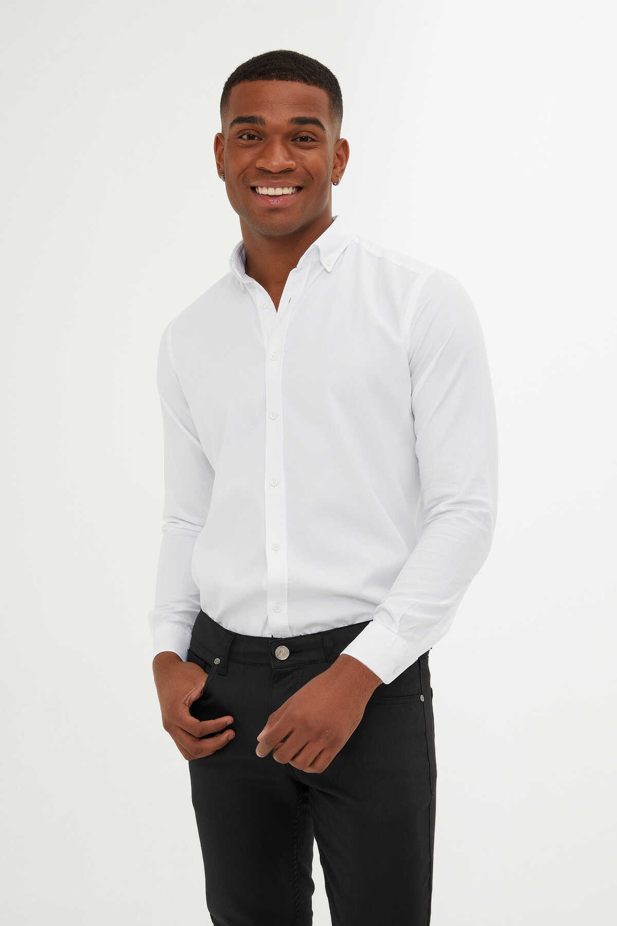 Beyaz Slim Fit 100% Pamuk Düğmeli Yaka Uzun Kollu Casual Gömlek