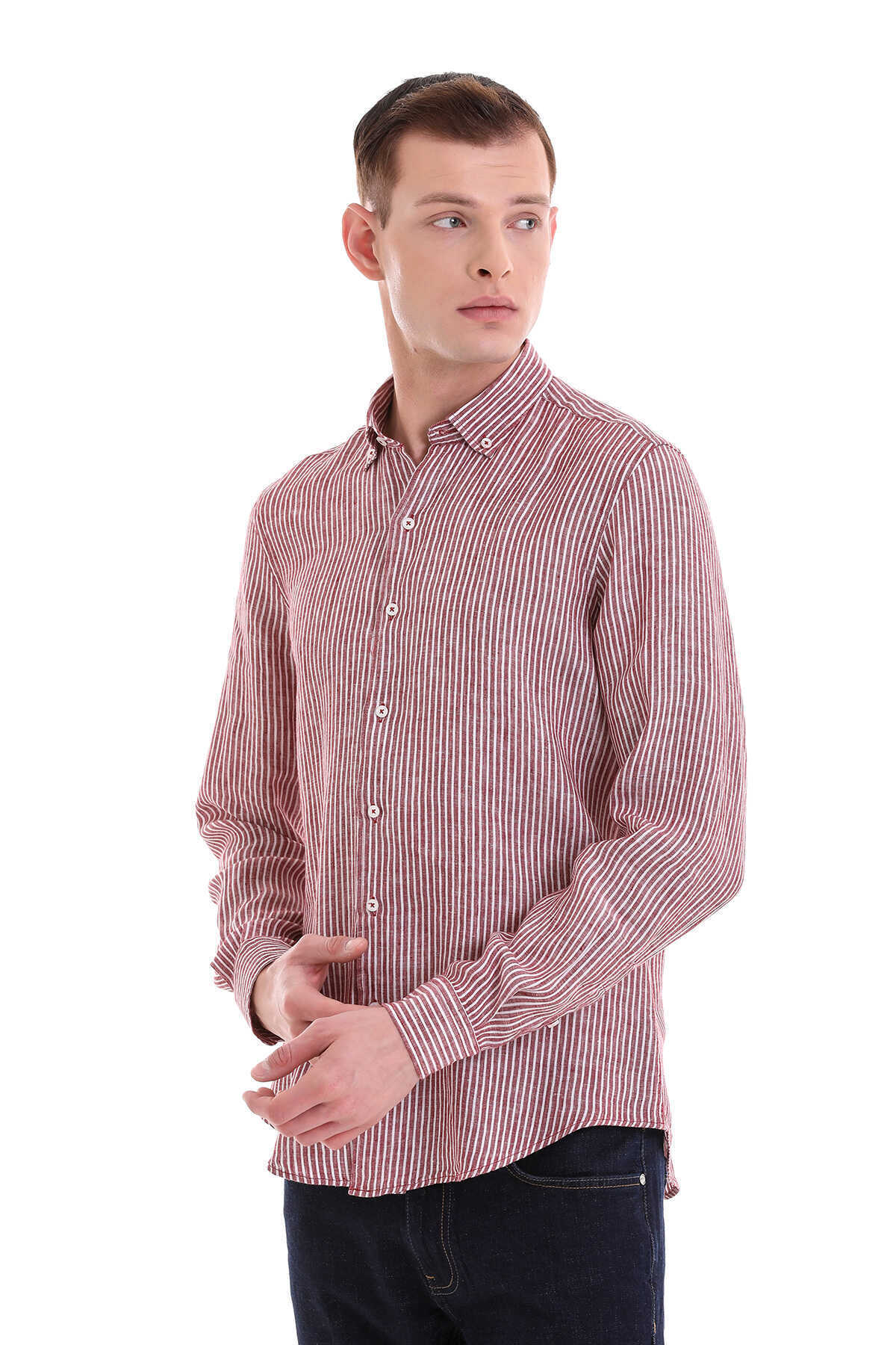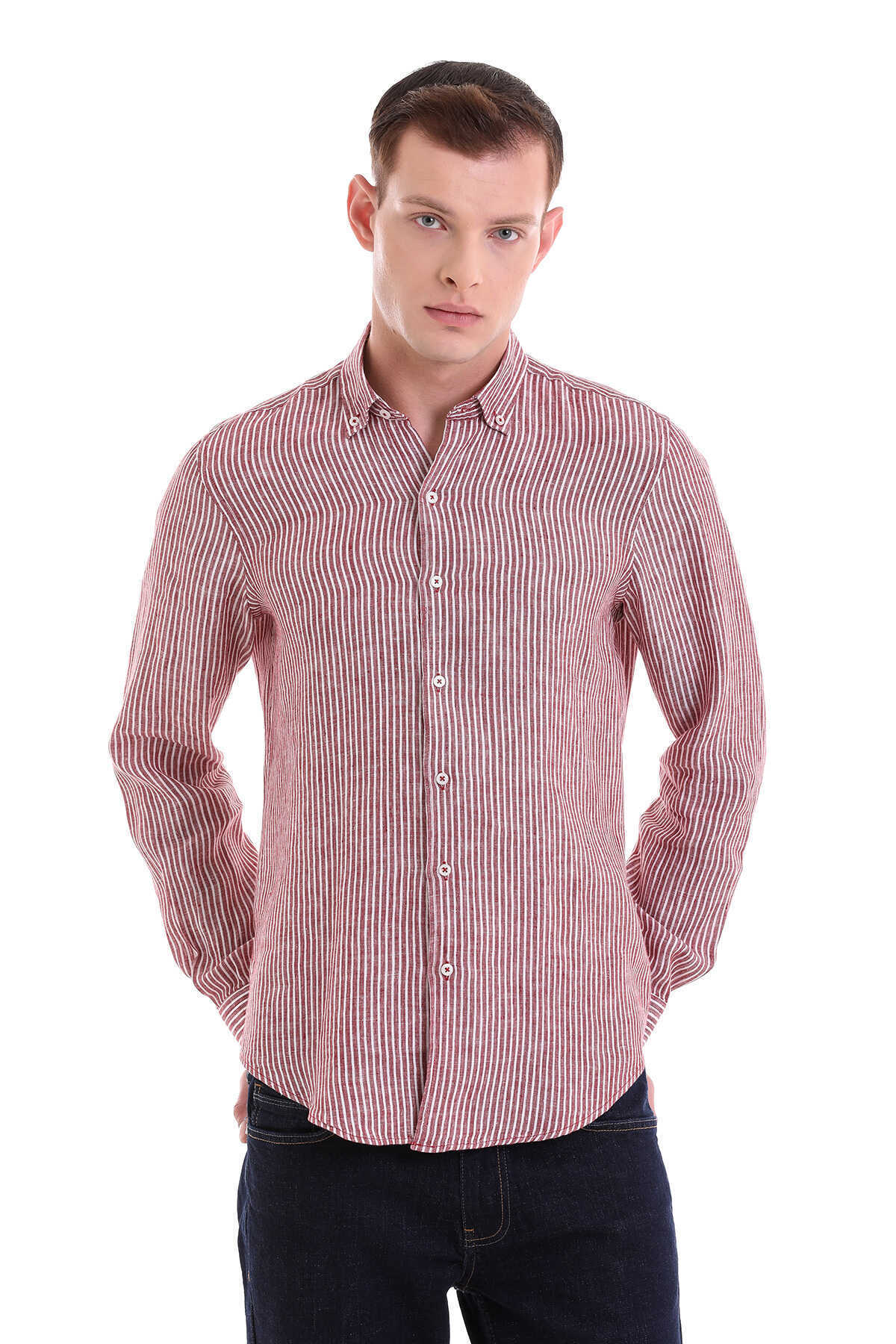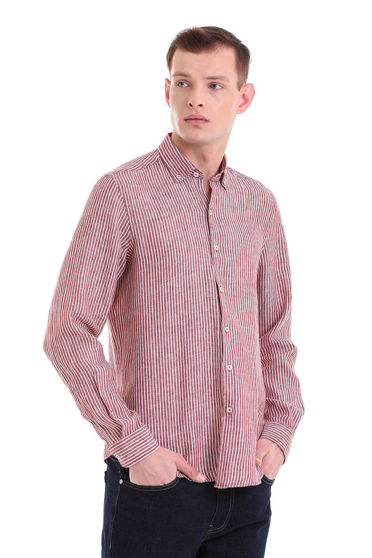 Bordo Comfort Fit Çizgili 100% Keten Düğmeli Yaka Uzun Kollu Casual Gömlek
