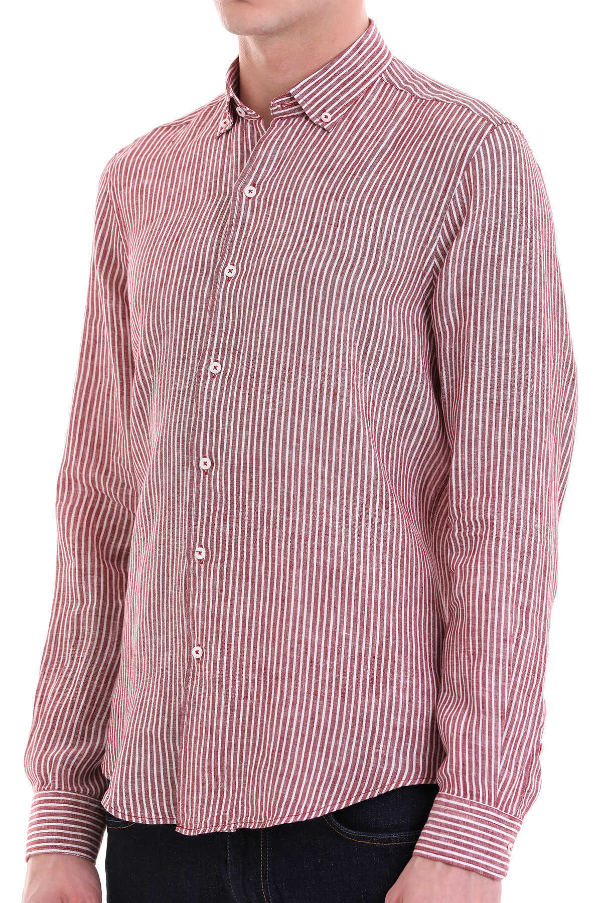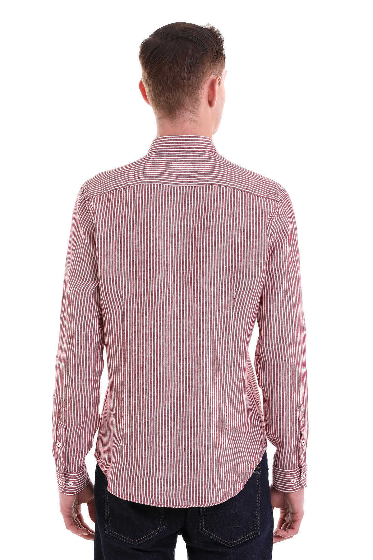 Bordo Comfort Fit Çizgili 100% Keten Düğmeli Yaka Uzun Kollu Casual Gömlek - 6