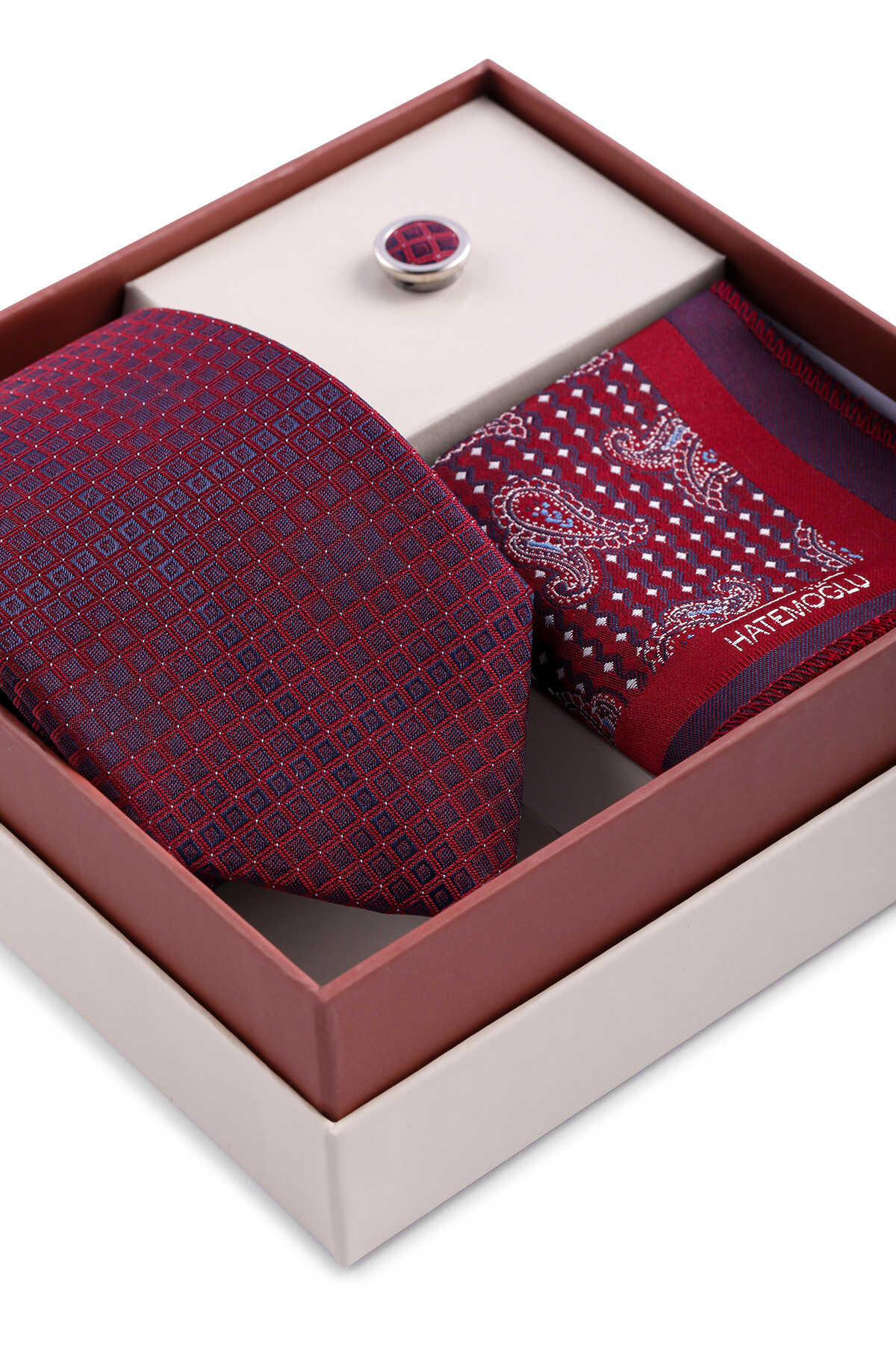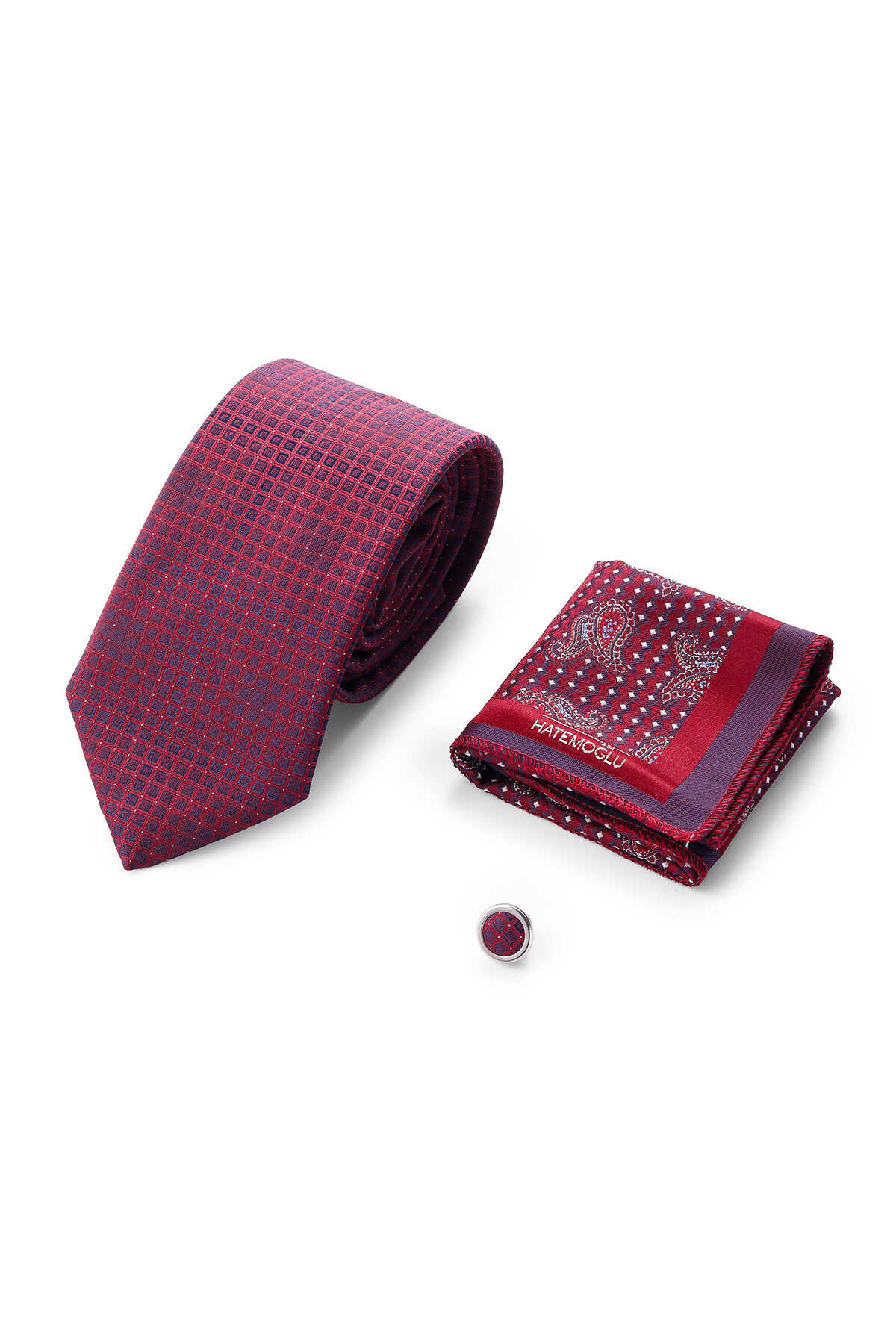 Bordo Üçlü Yaka Rozeti Kravat Mendil Set