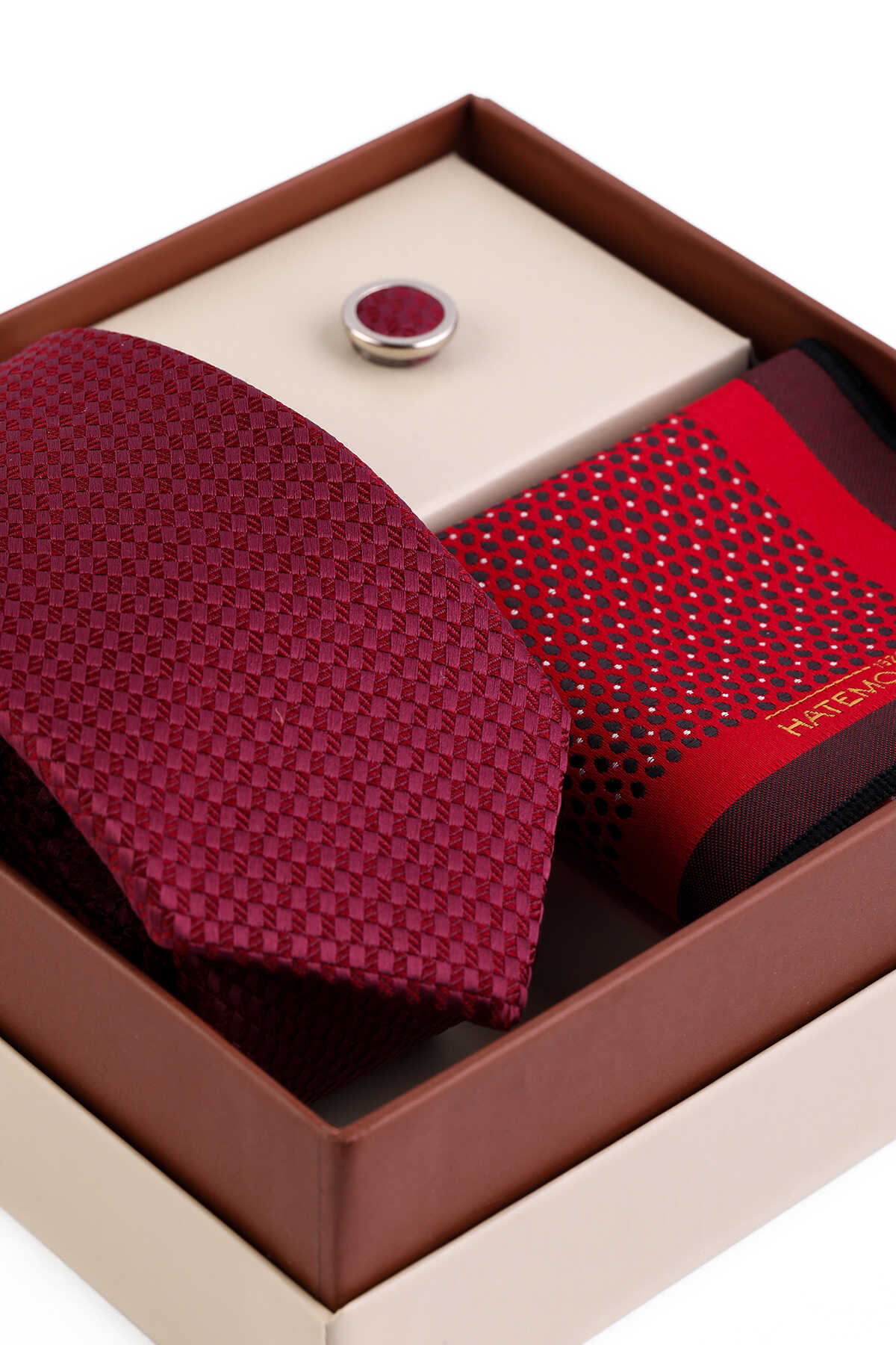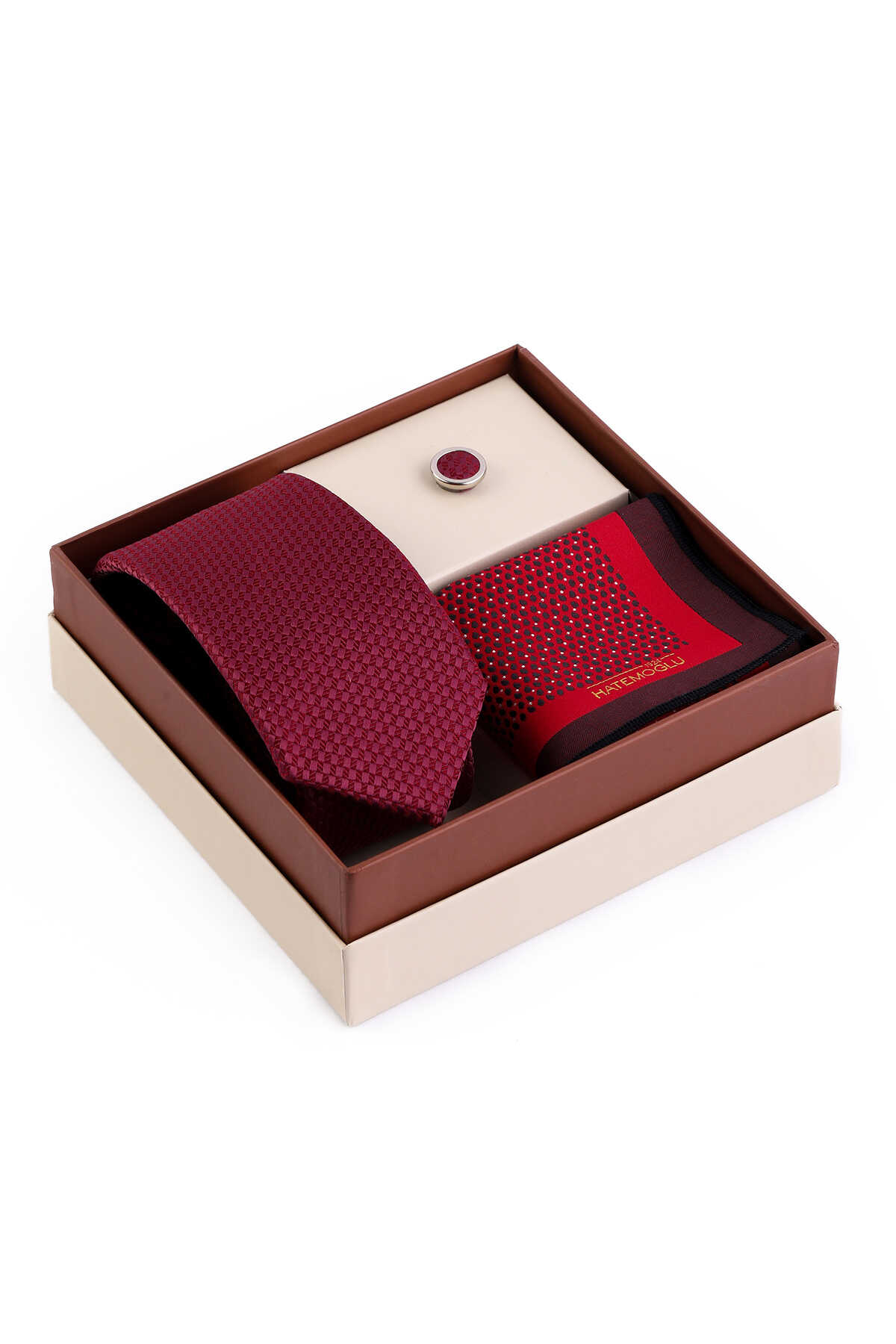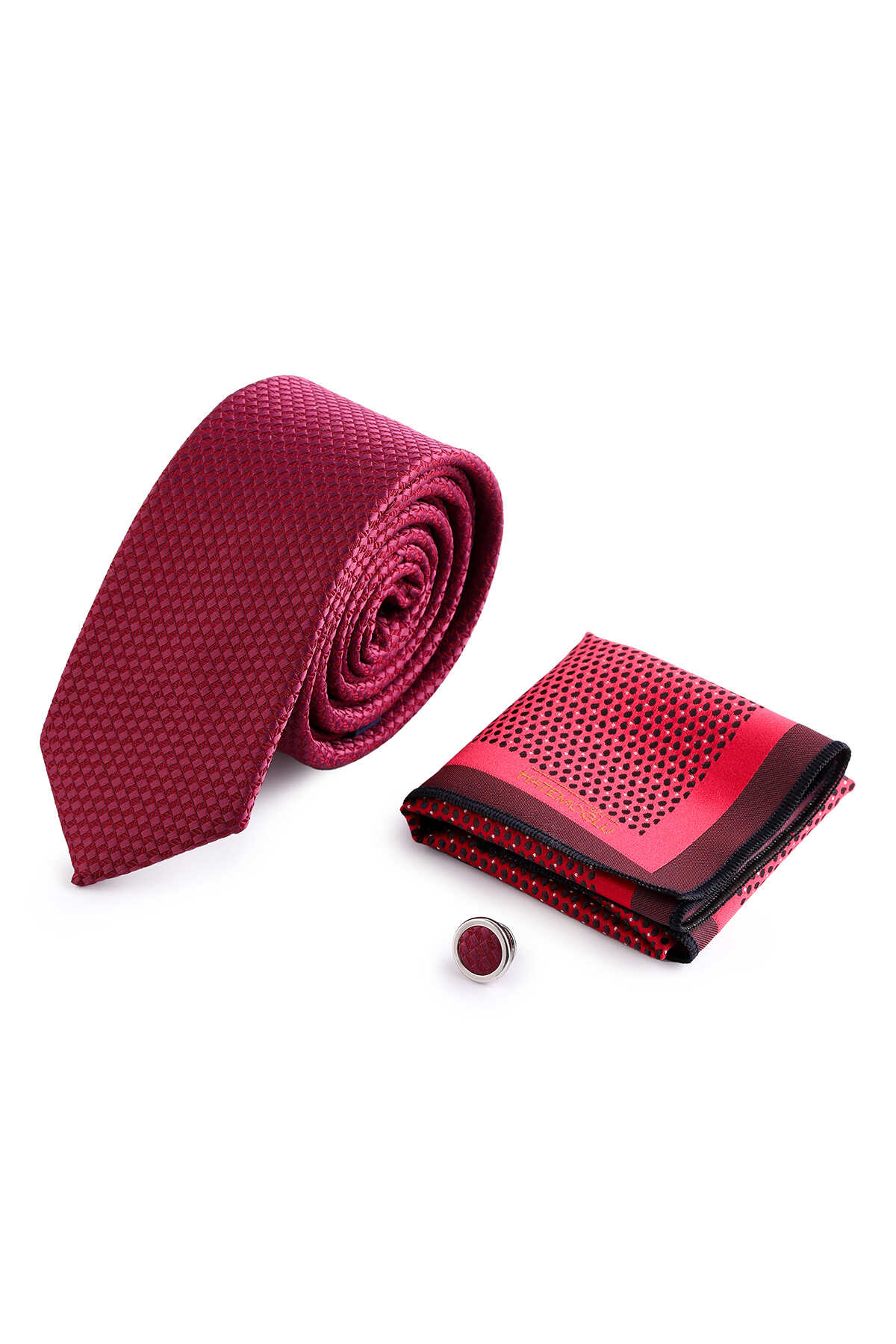 Bordo Üçlü Yaka Rozeti Kravat Mendil Set