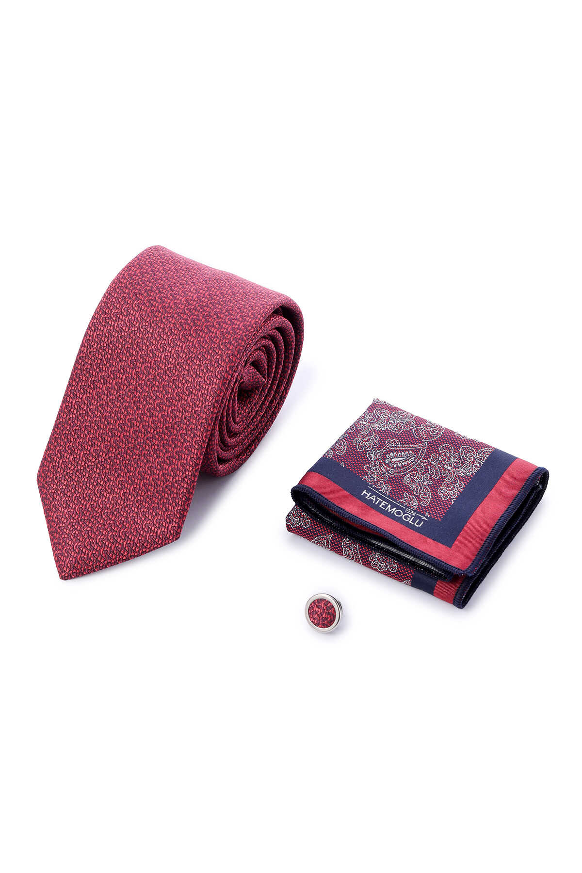 Bordo Üçlü Yaka Rozeti Kravat Mendil Set