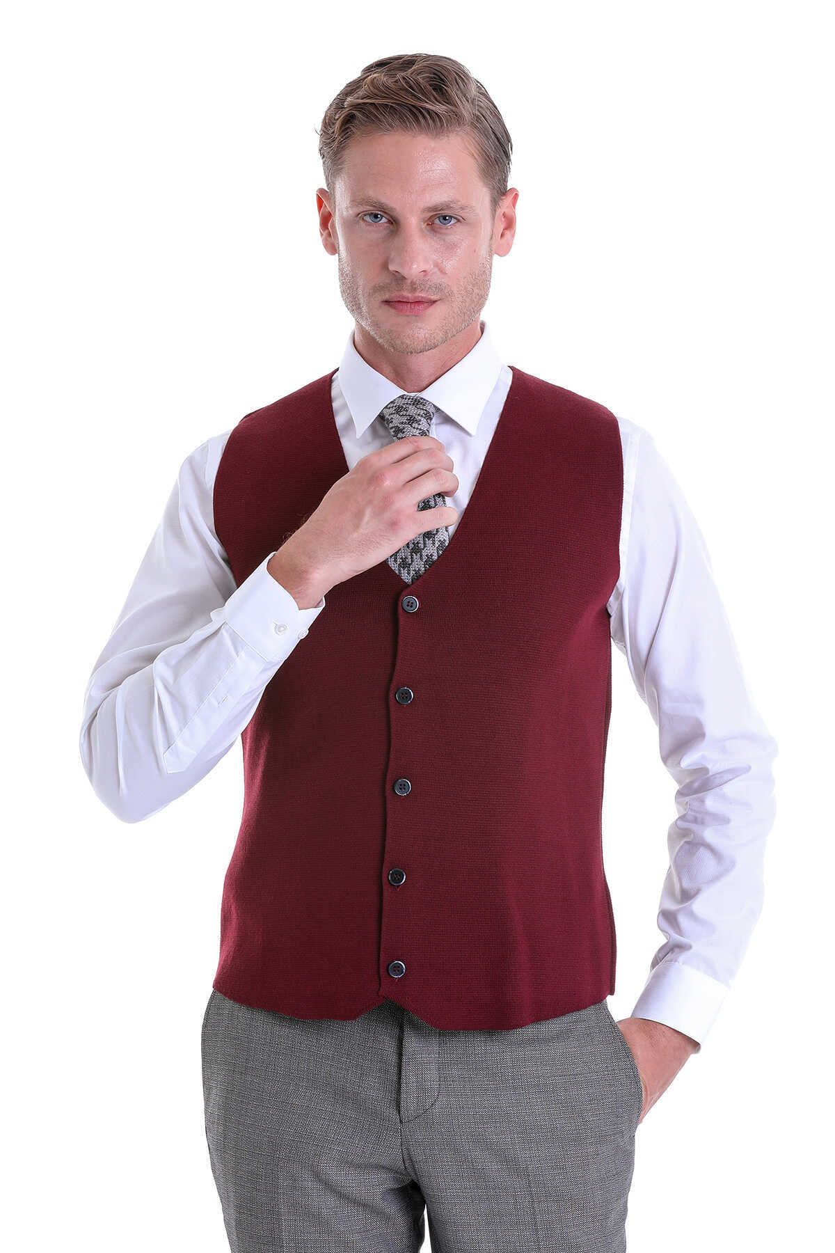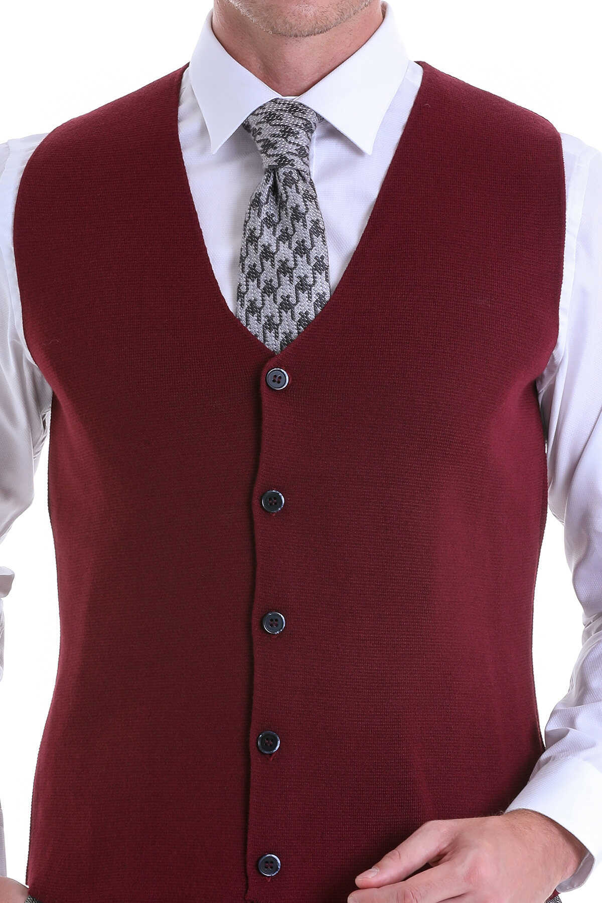 Bordo Comfort Fit V Yaka Yünlü Klasik Triko Yelek