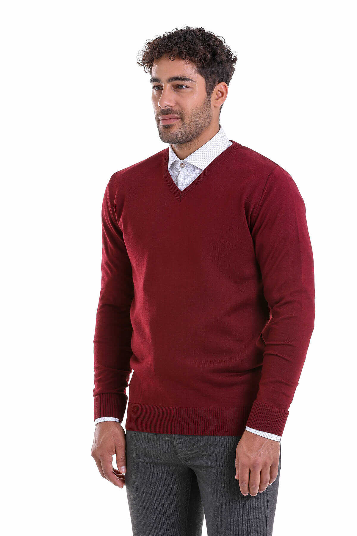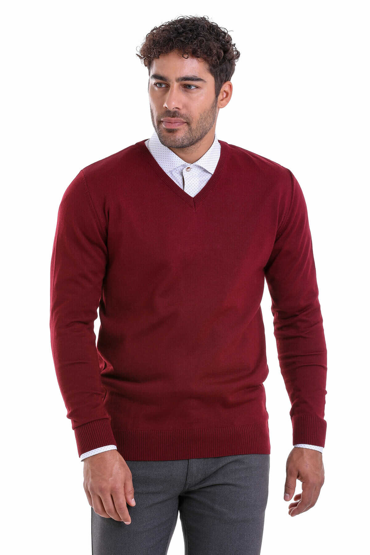 Bordo Comfort Fit V Yaka Yünlü Kazak