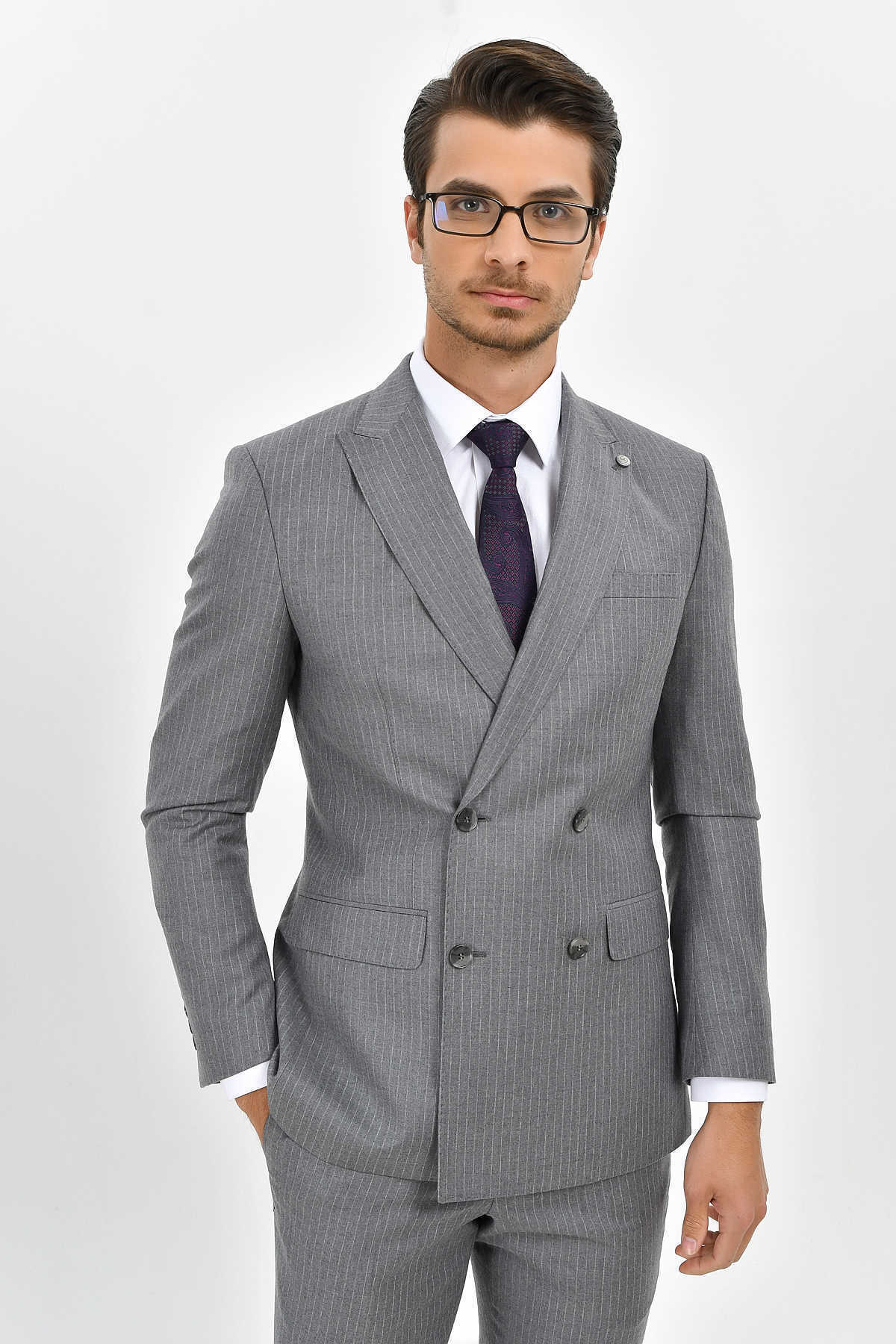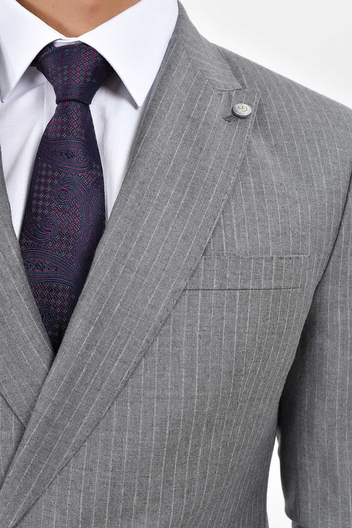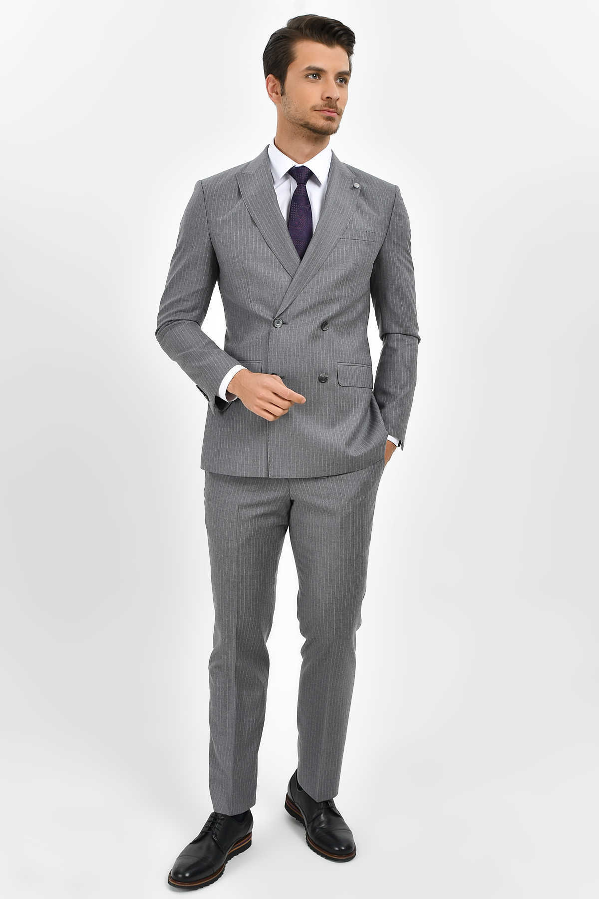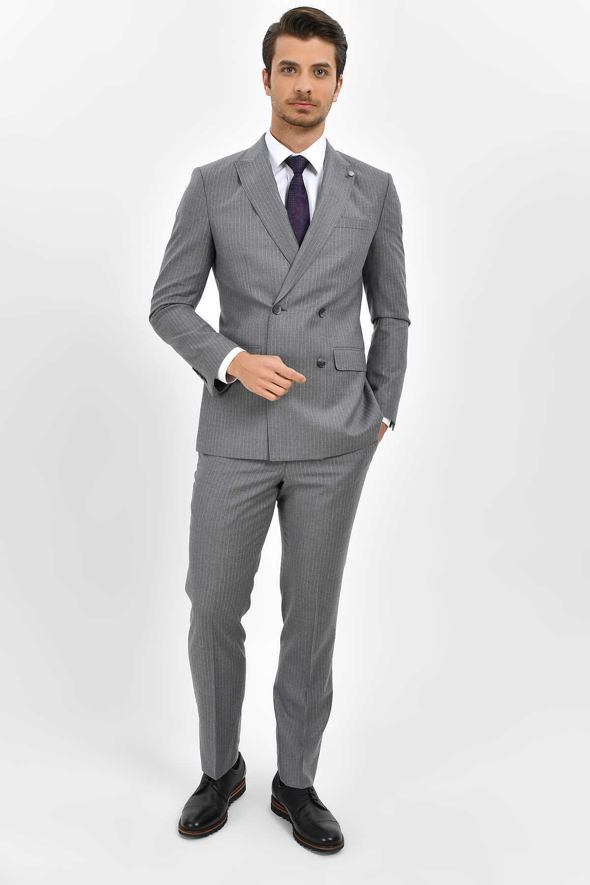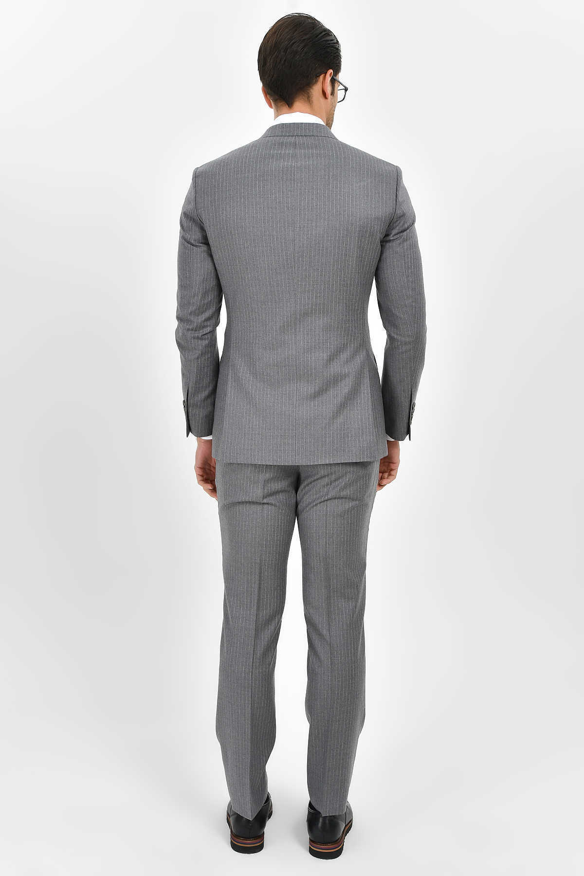 Çizgili Slim Fit Gri Takım Elbise
