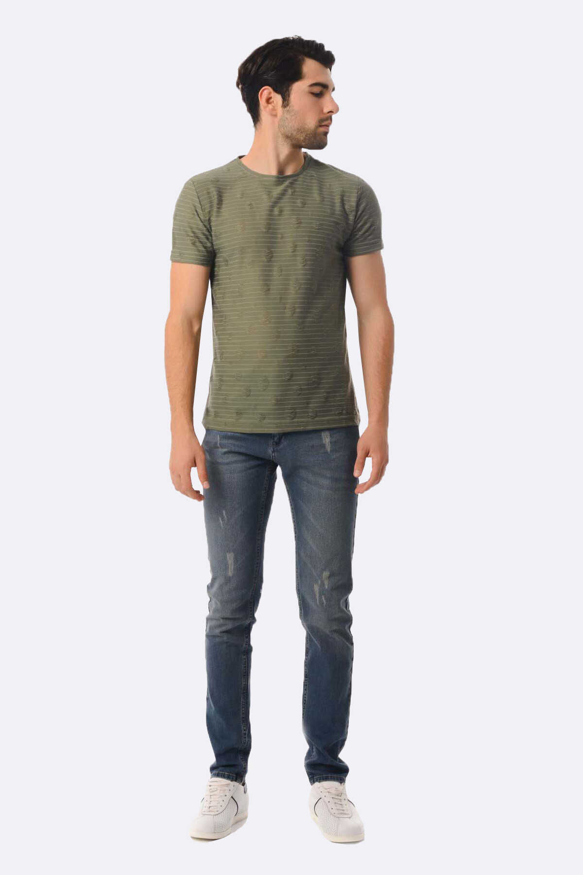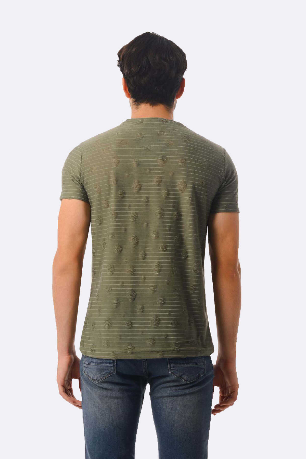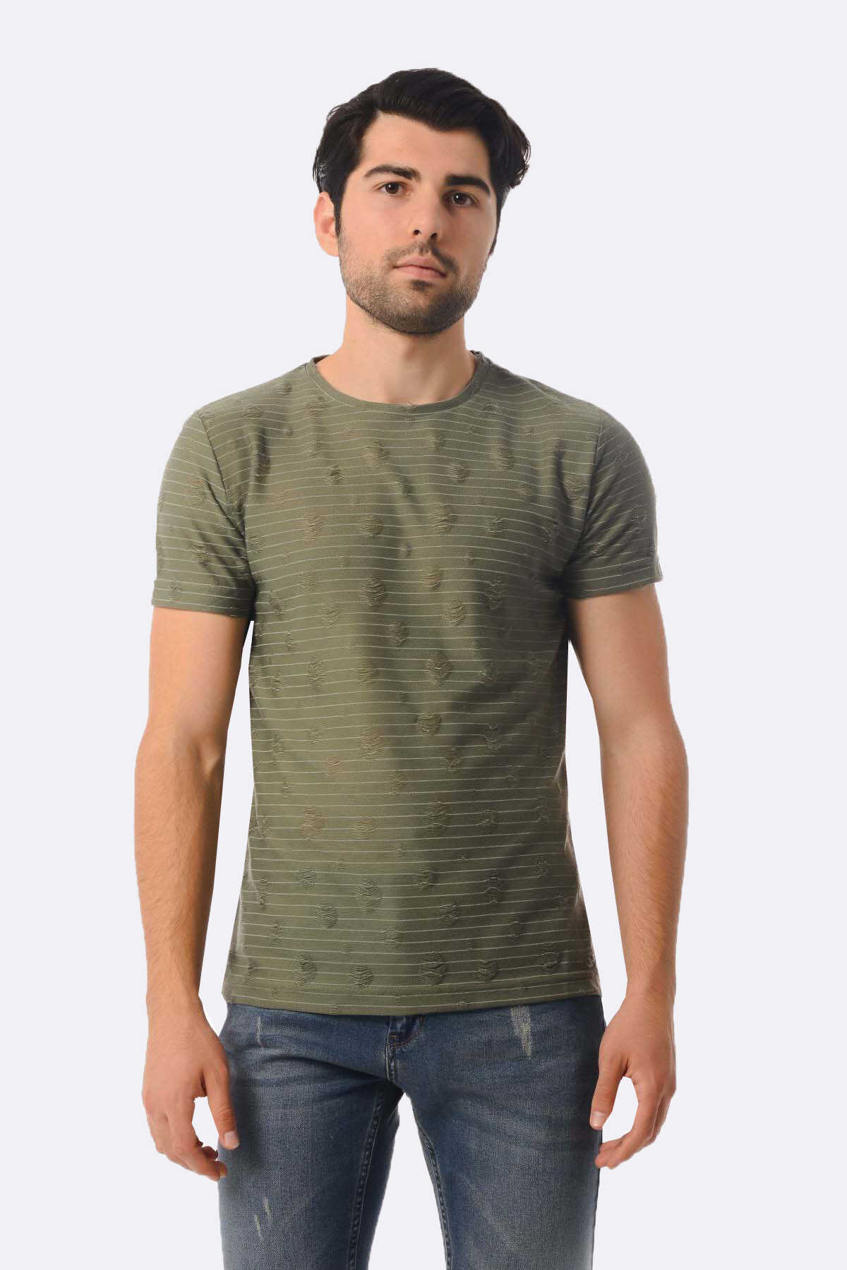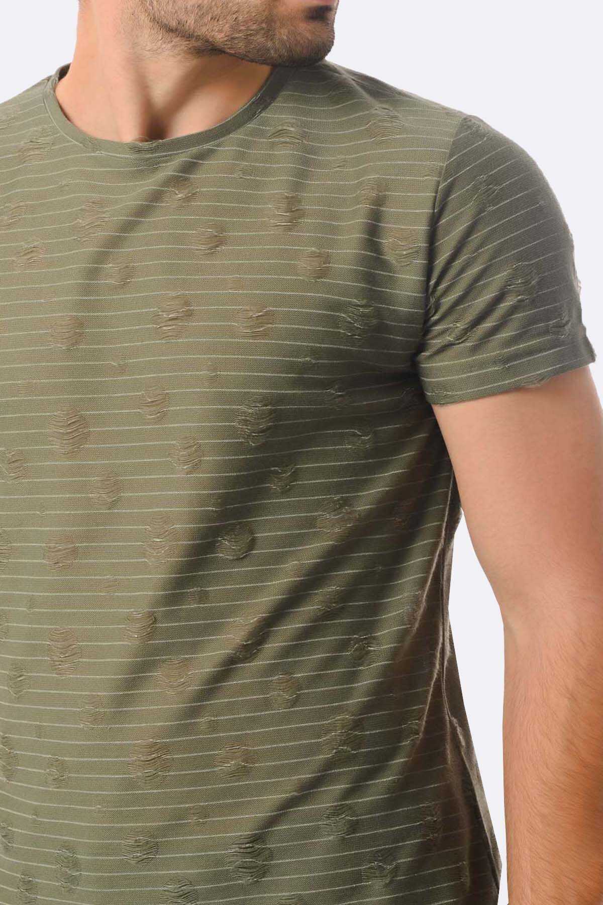 Haki Çizgili Bisiklet Yaka Tişört