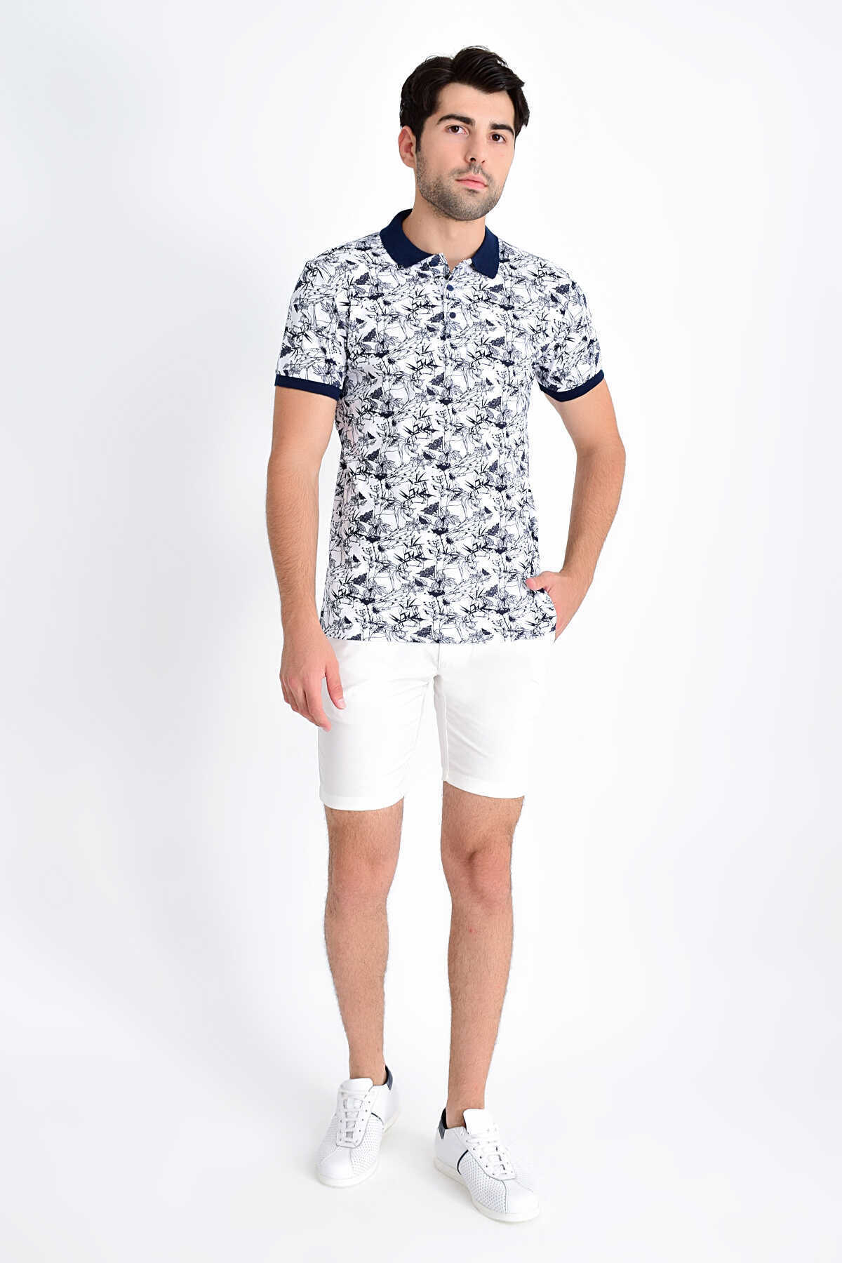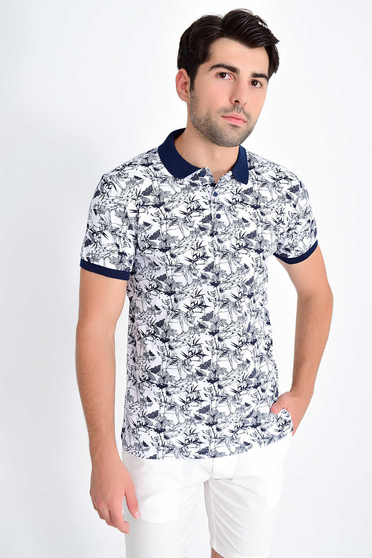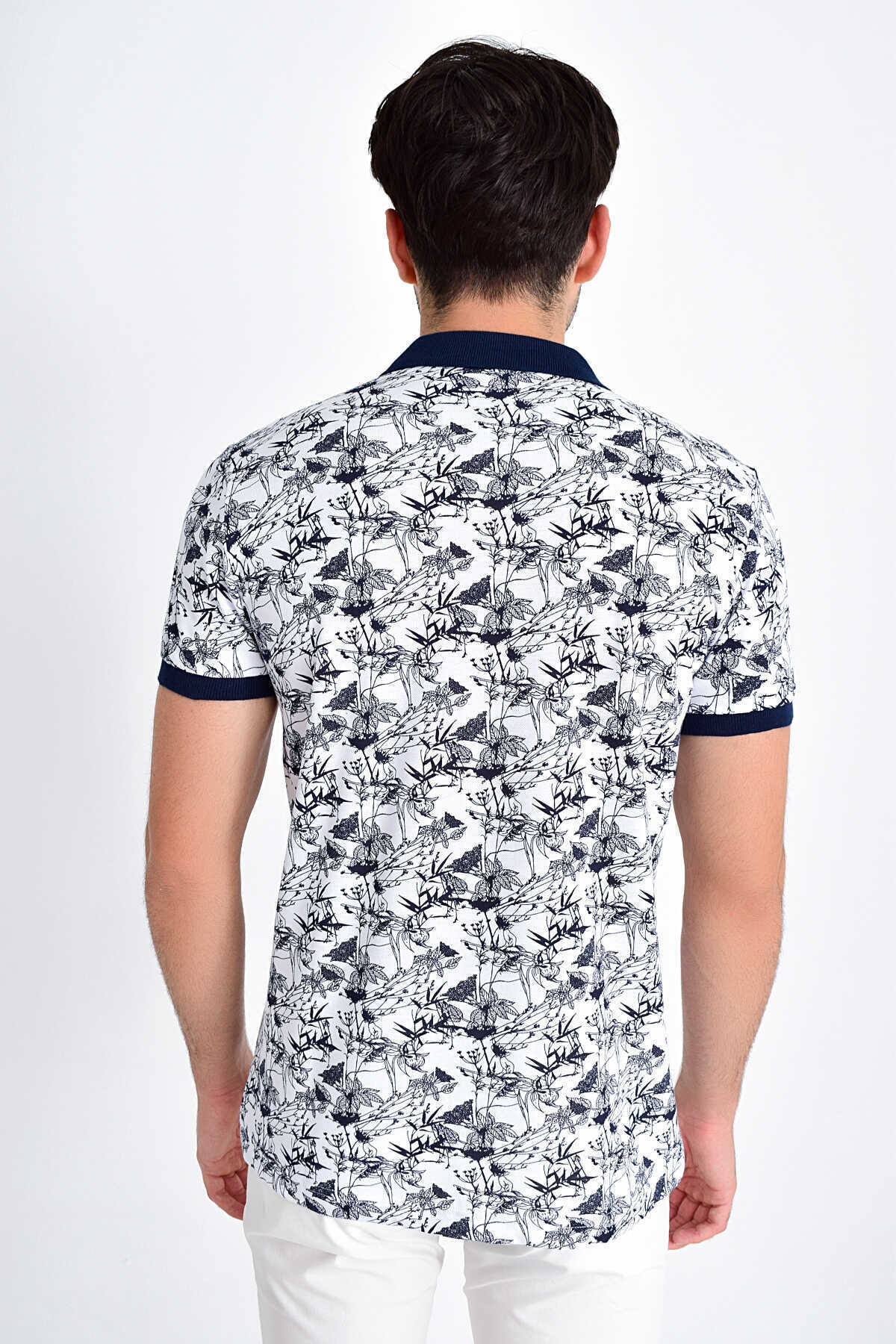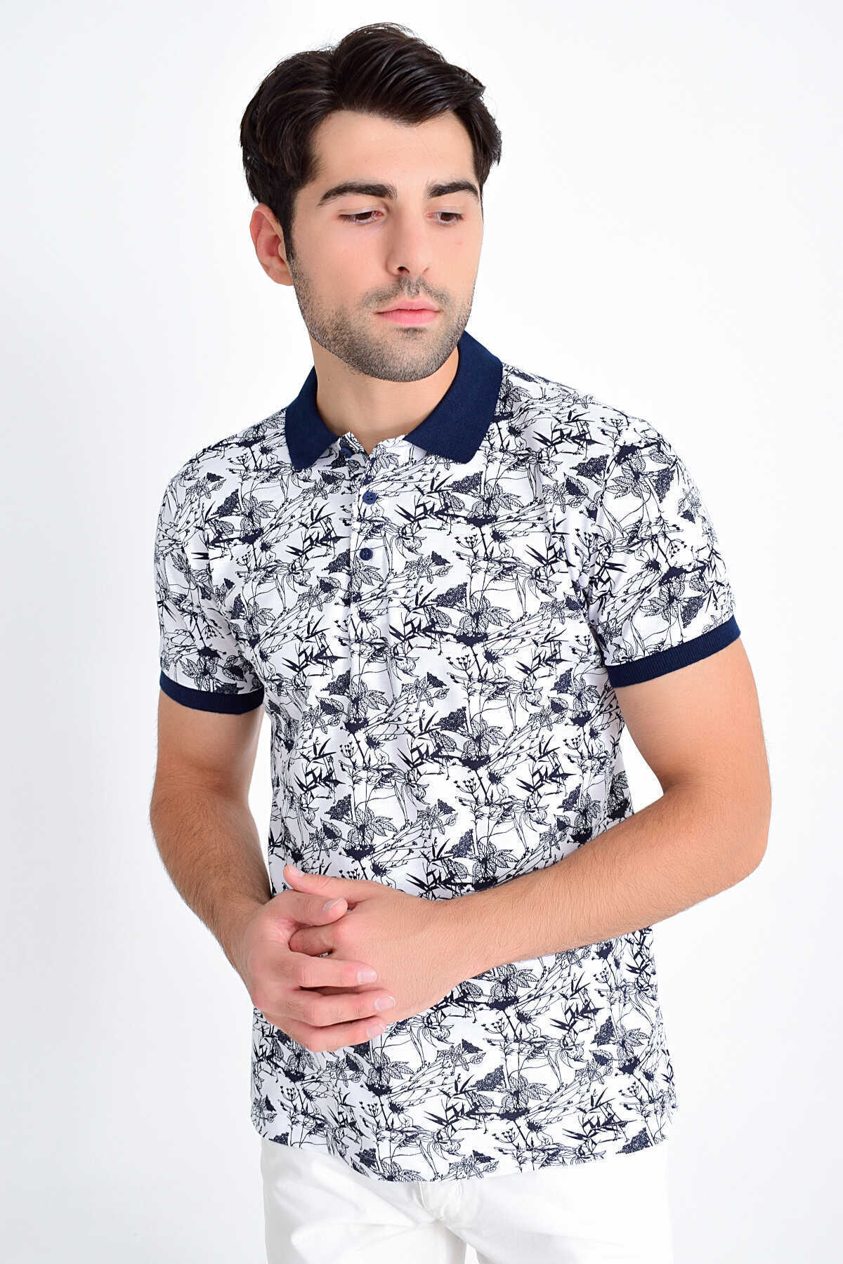 Lacivert Beyaz Çiçek Desenli Polo Tişört
