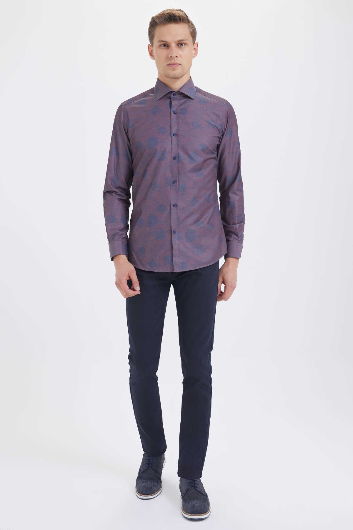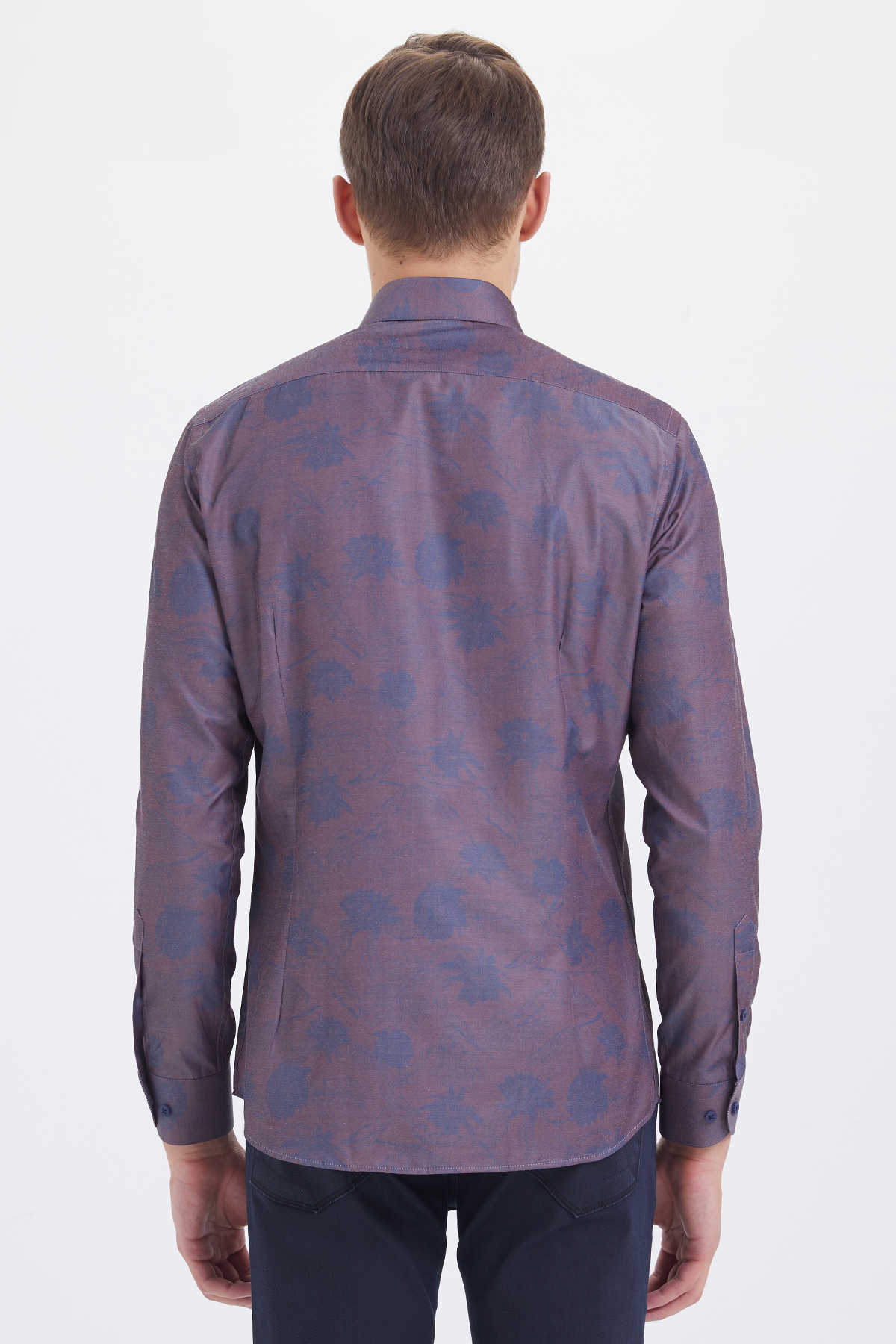 Bordo Slim Fit Baskılı Pamuklu Uzun Kol Spor Gömlek