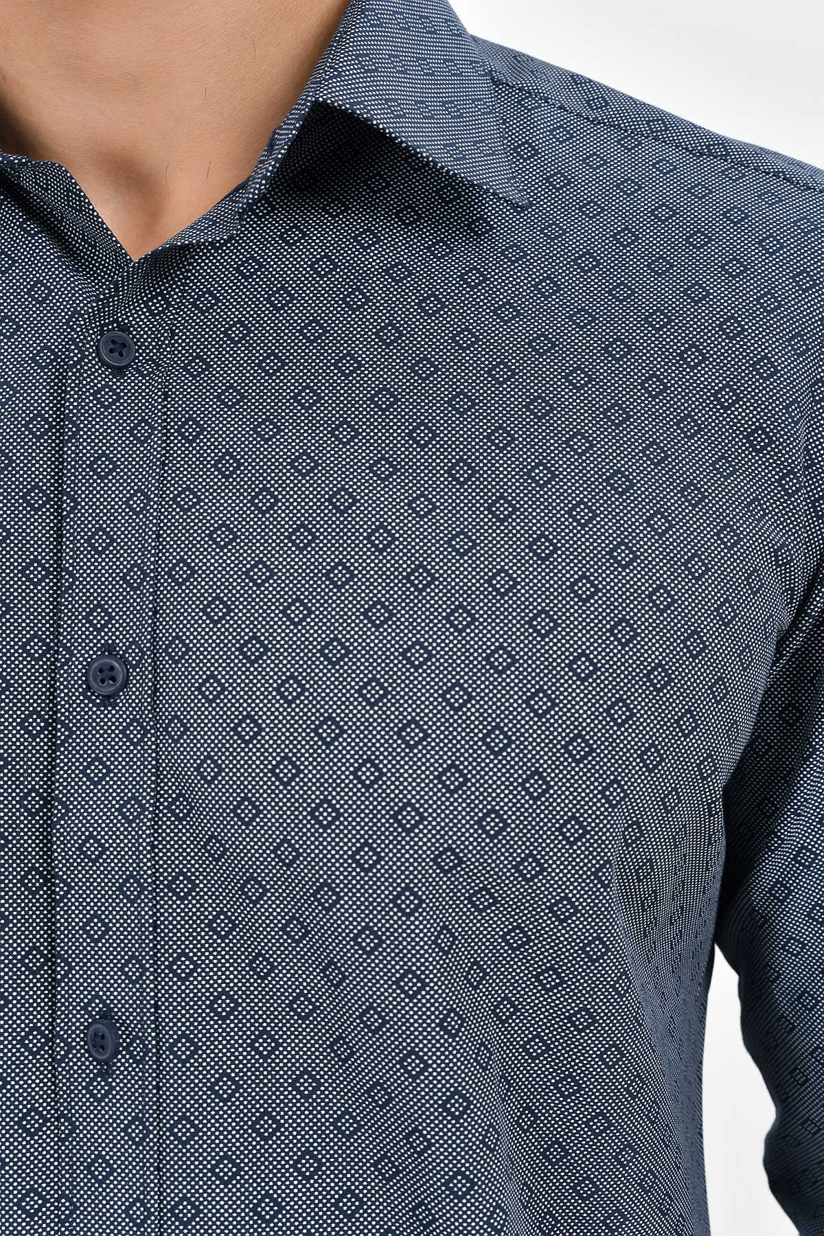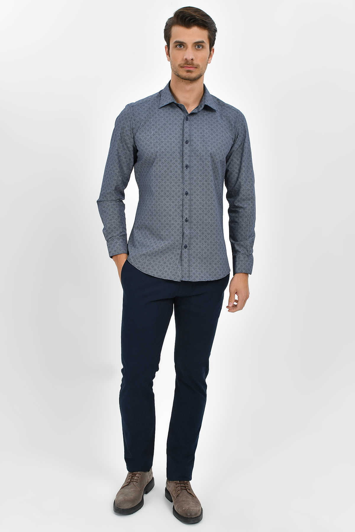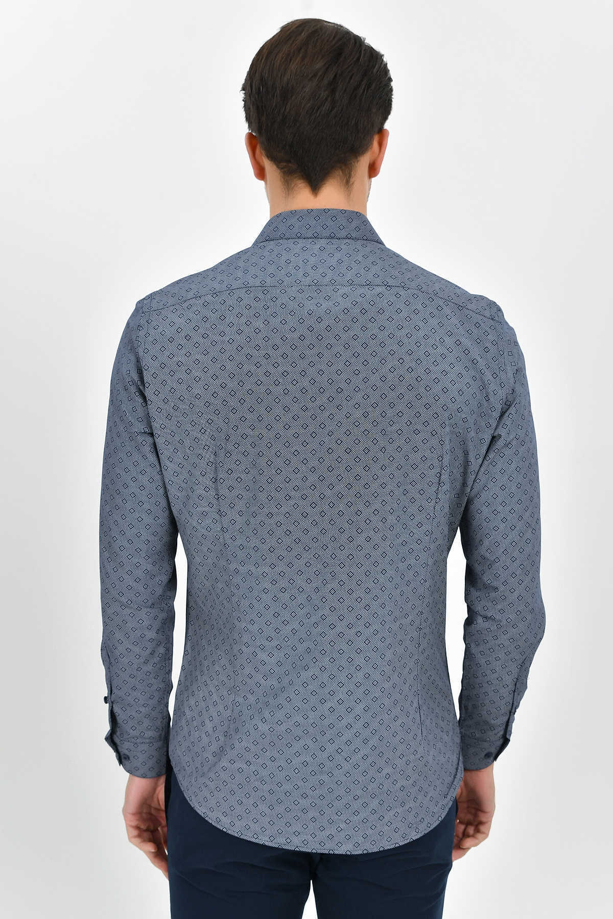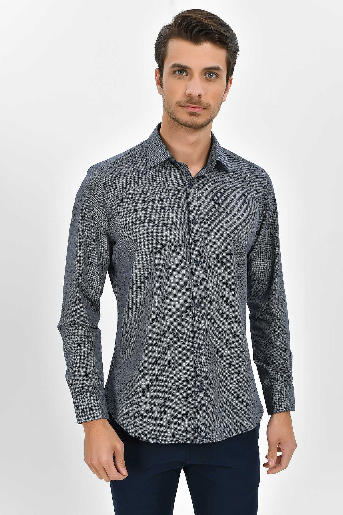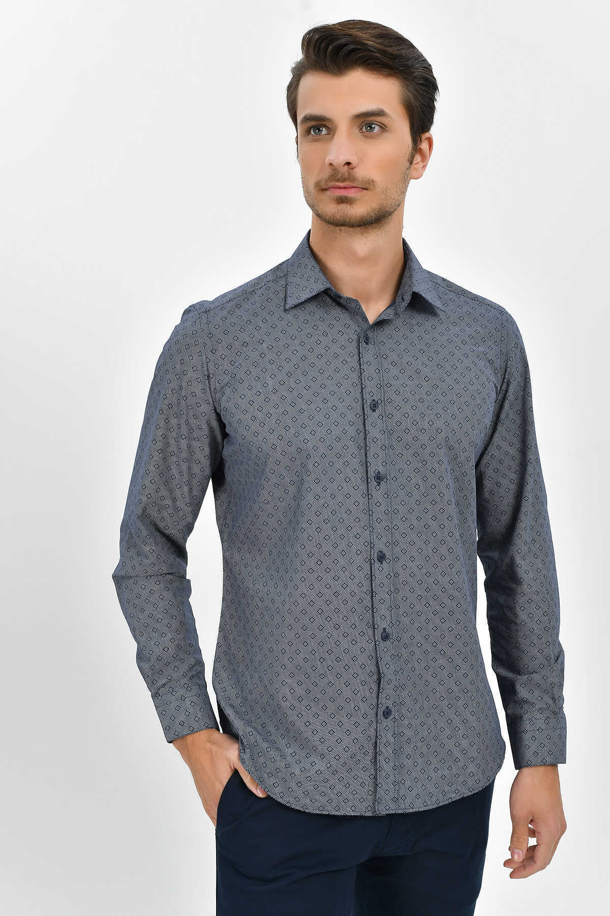 Lacivert Slim Fit Baskılı Pamuklu Uzun Kol Spor Gömlek