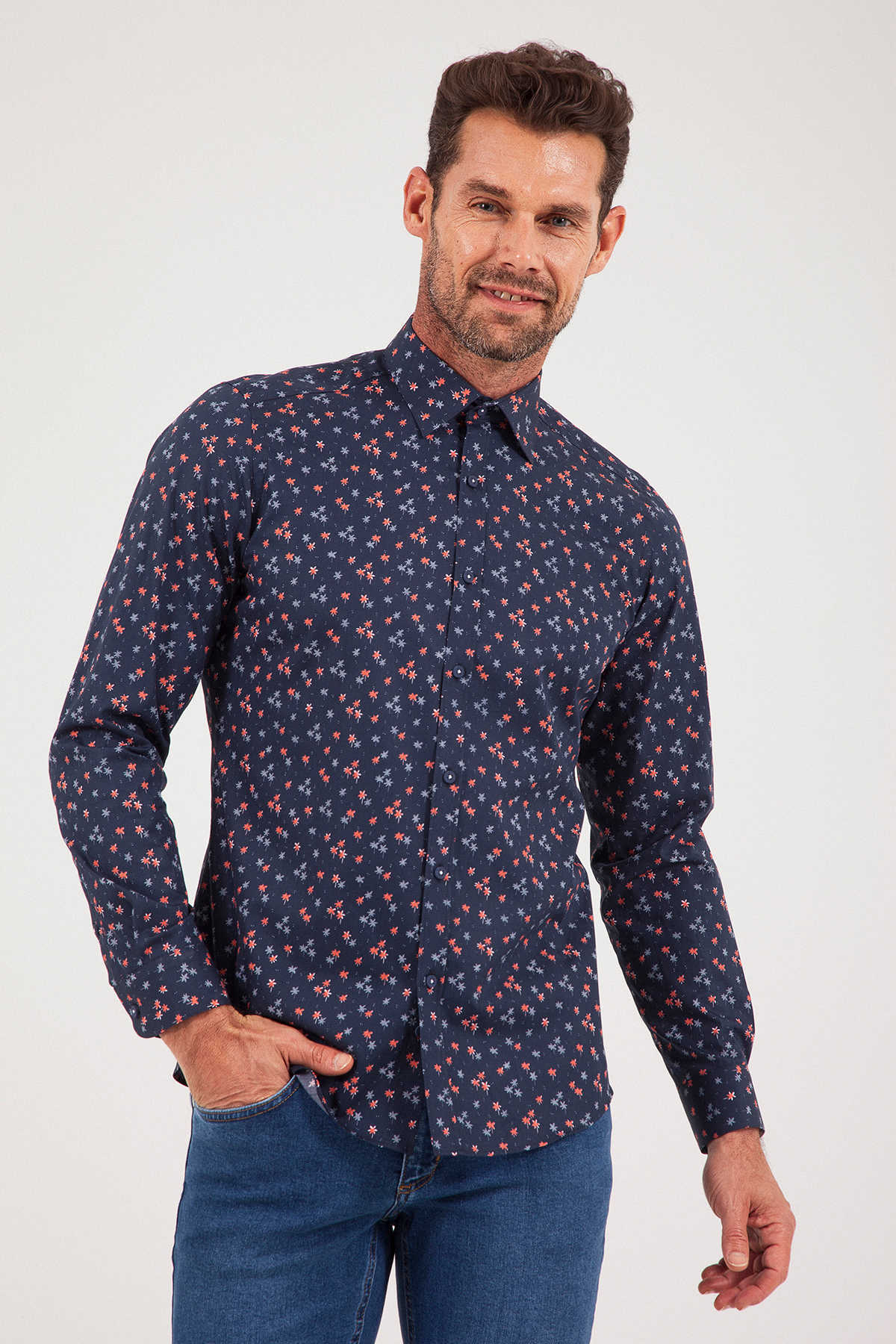 Lacivert Slim Fit Baskılı 100% Pamuk Uzun Kol Spor Gömlek