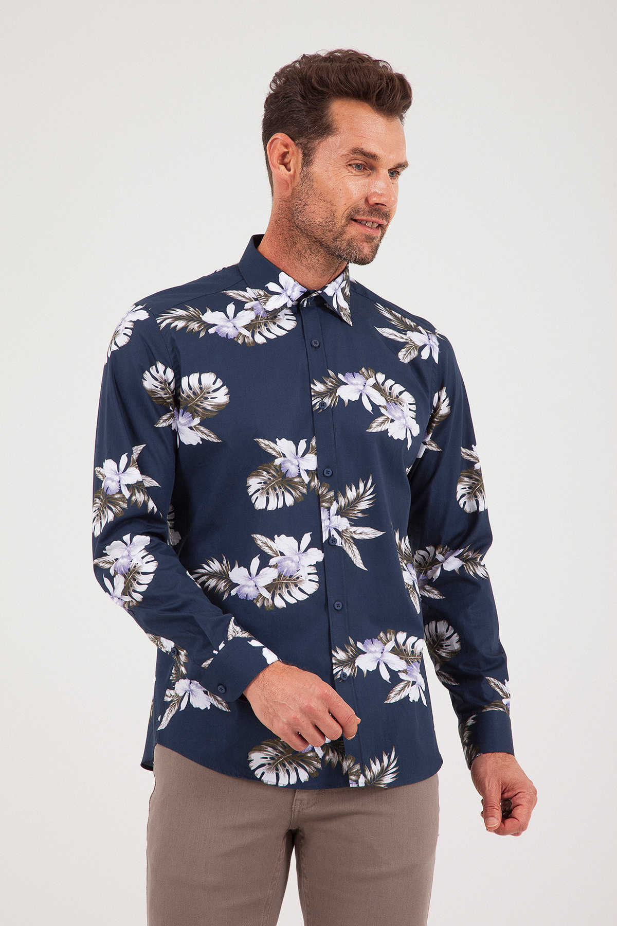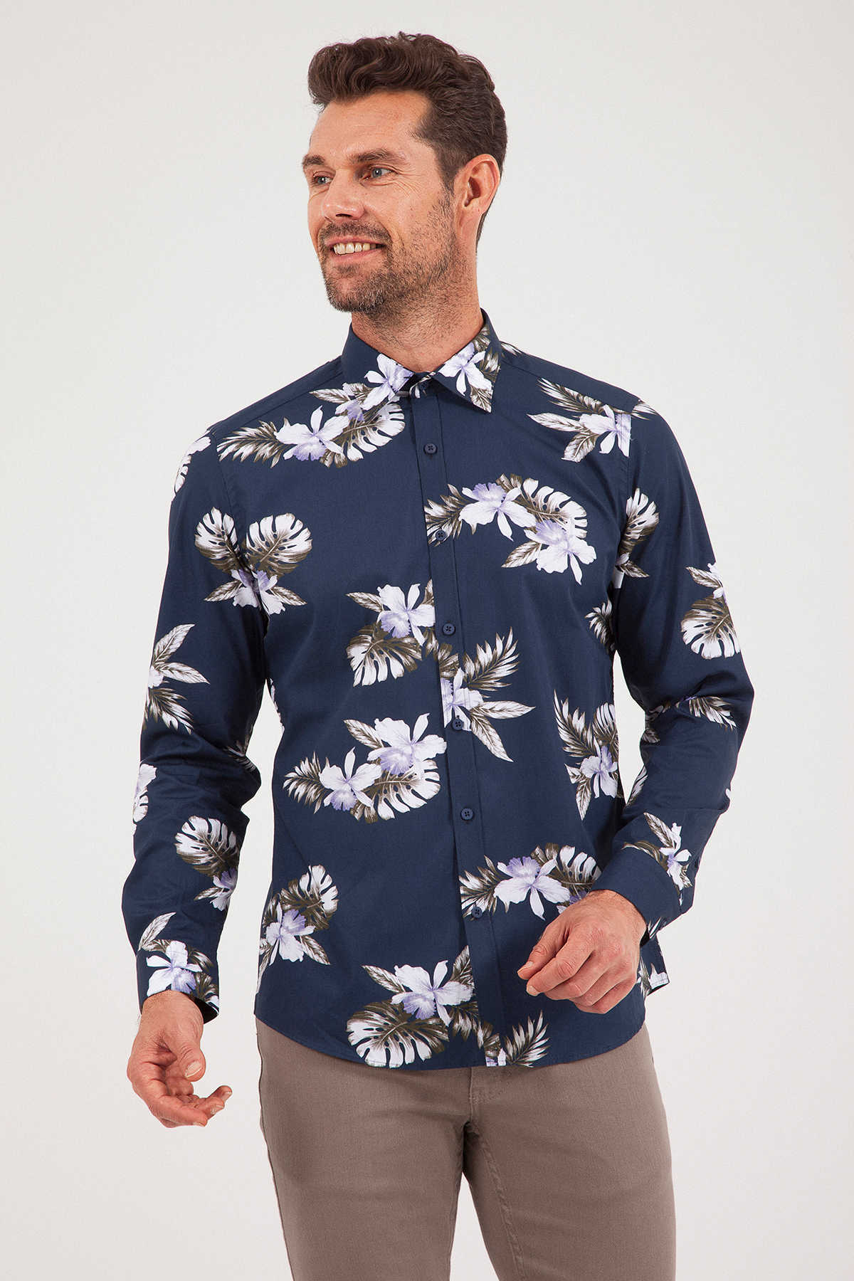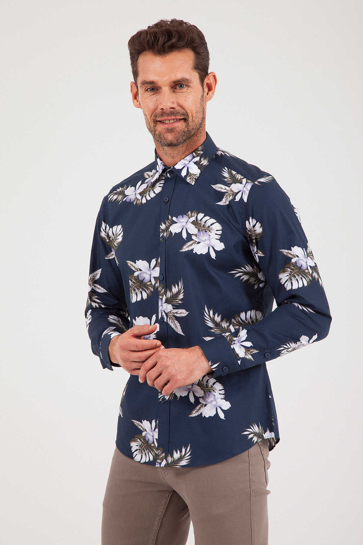 Lacivert Slim Fit Baskılı 100% Pamuk Uzun Kol Spor Gömlek