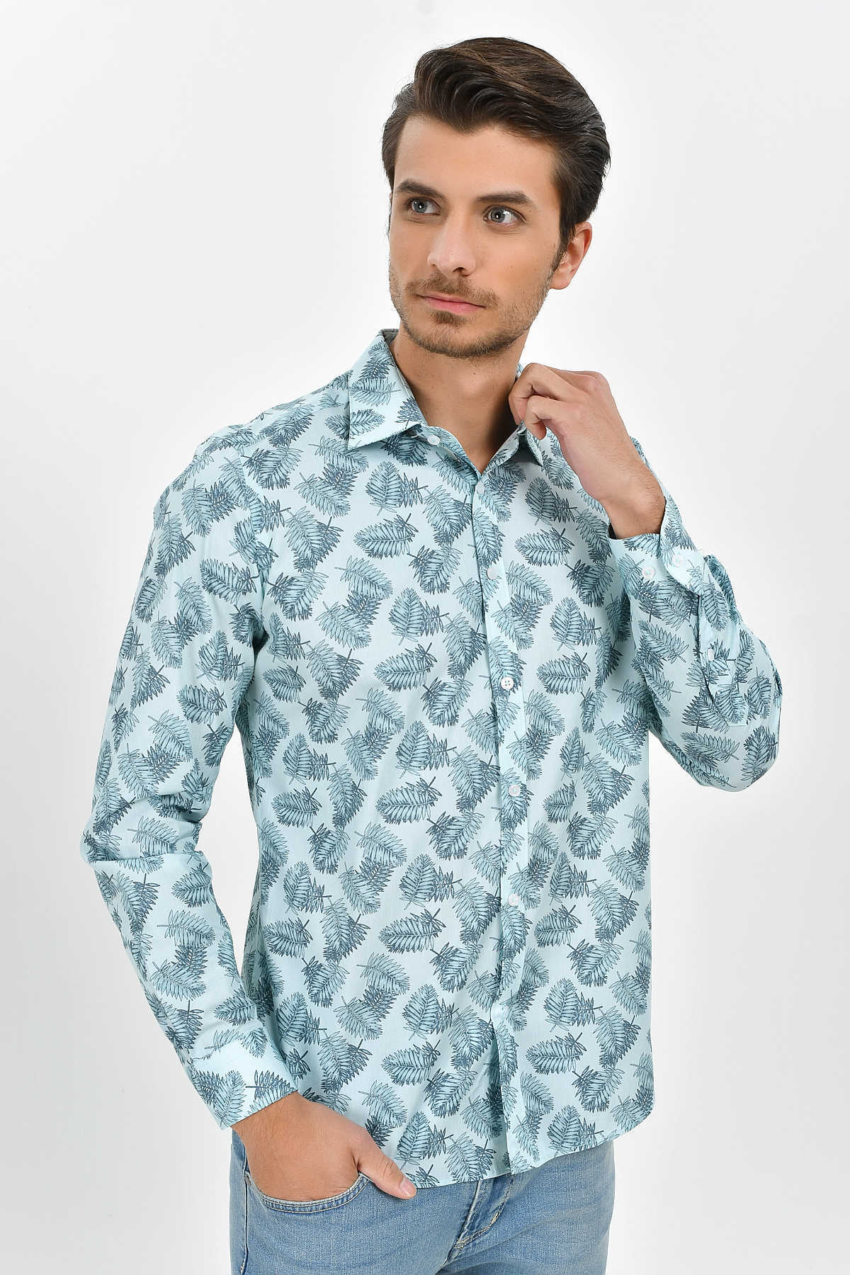 Mavi Slim Fit Baskılı 100% Pamuk Uzun Kol Spor Gömlek