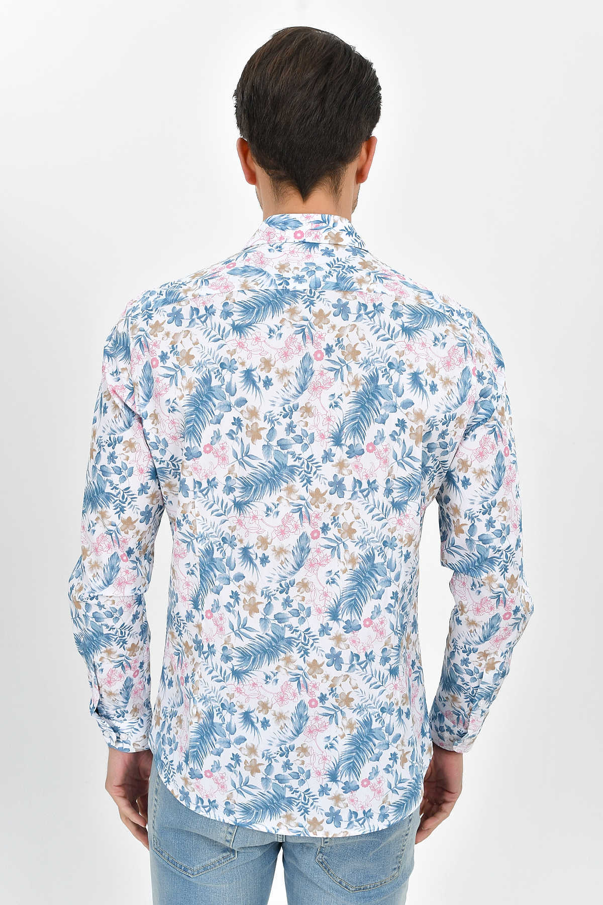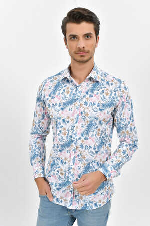 Pembe Slim Fit Baskılı 100% Pamuk Uzun Kol Spor Gömlek