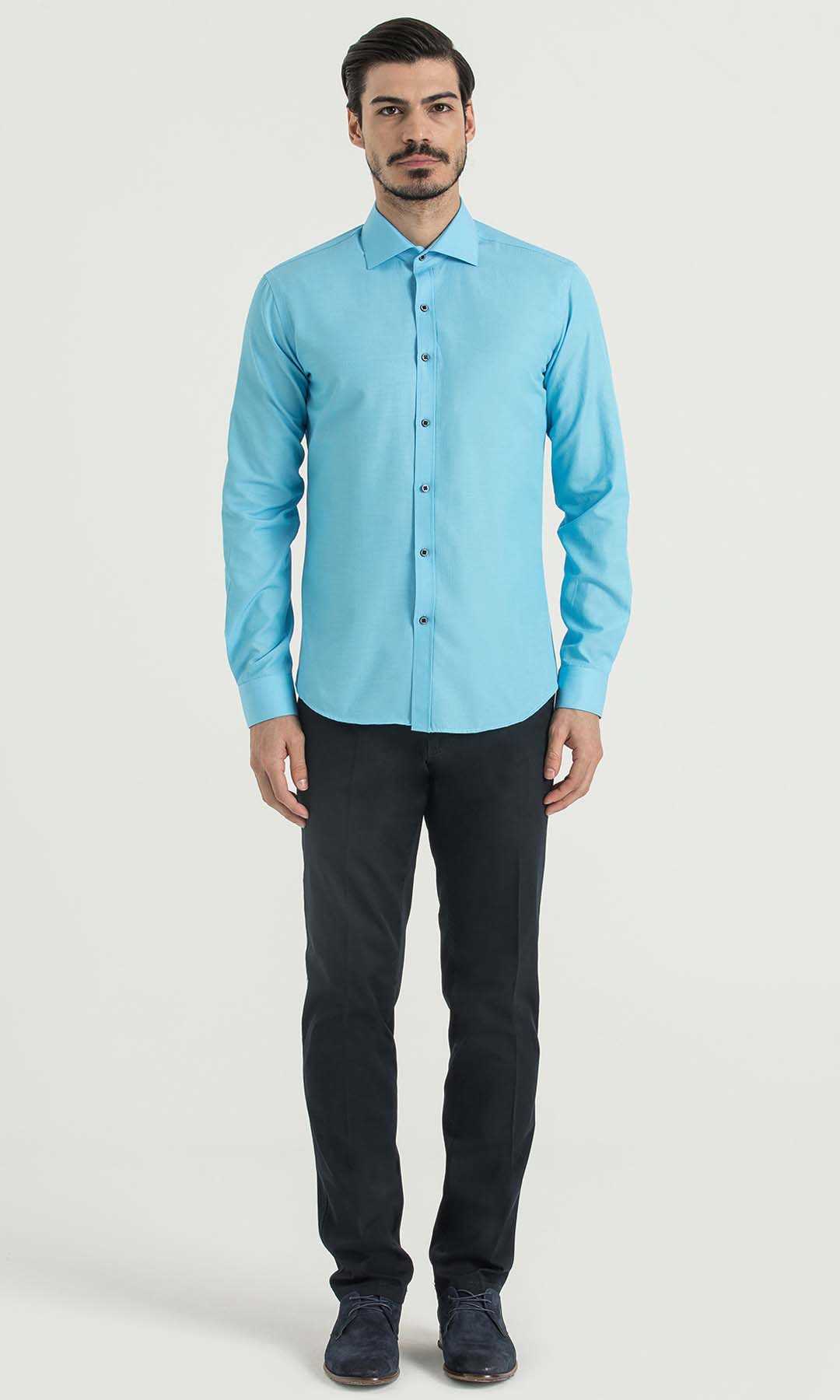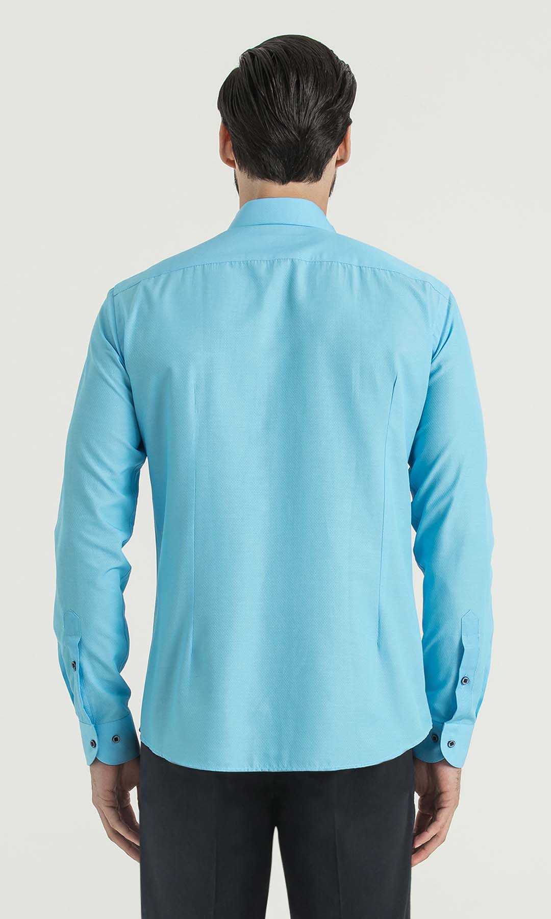 Turkuaz Slim Fit Desenli Pamuklu Uzun Kol Spor Gömlek