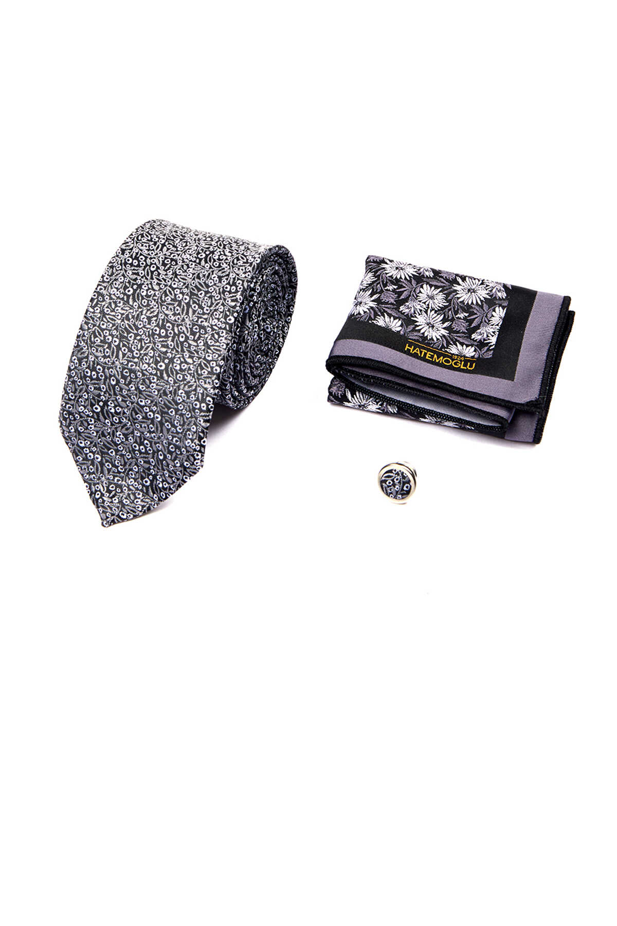 Gri Üçlü Yaka Rozeti Kravat Mendil Set
