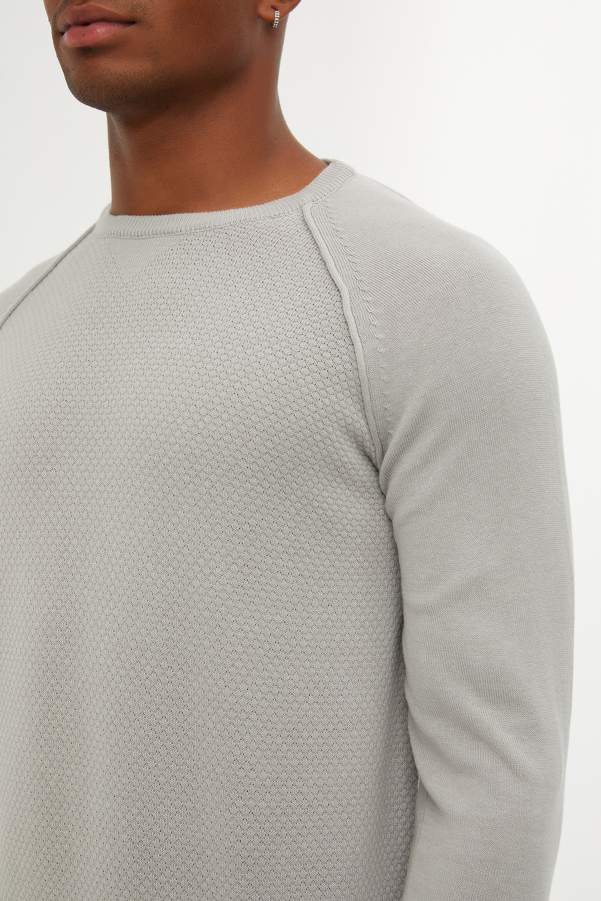 Gri Slim Fit Desenli Pamuklu Bisiklet Yaka Triko Kazak