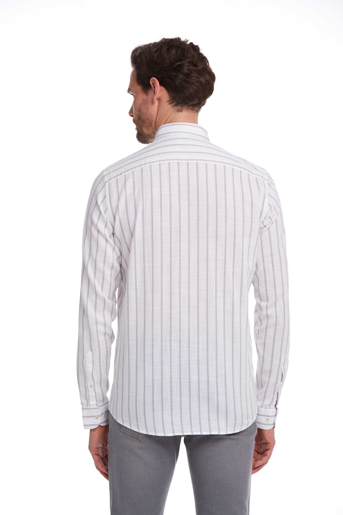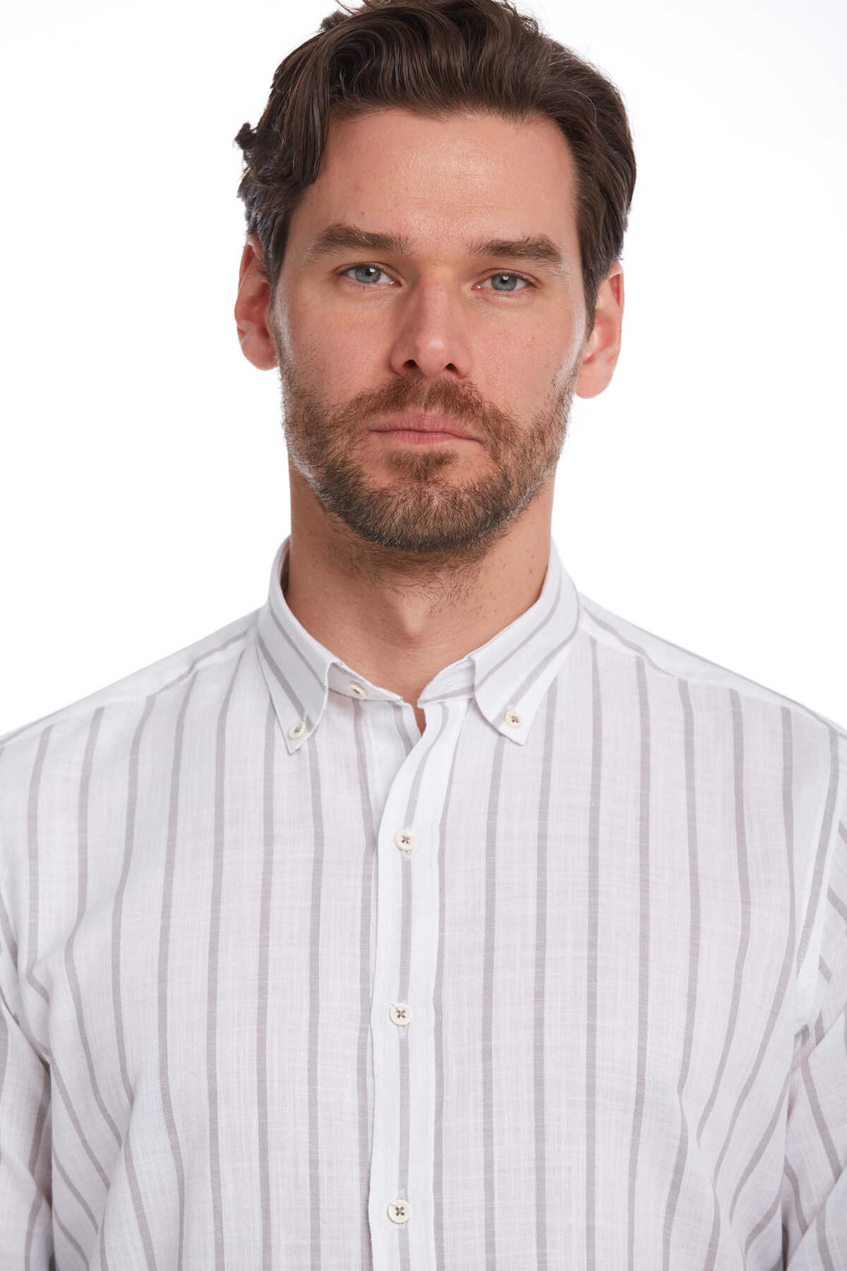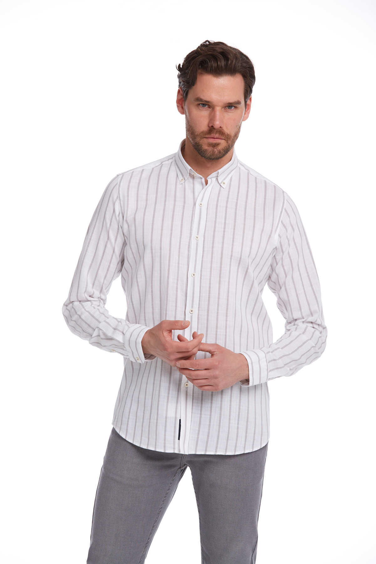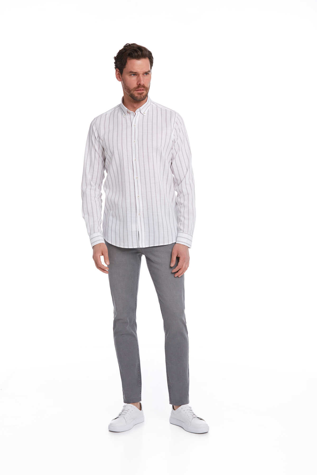 Gri Comfort Fit Çizgili 100% Pamuk Düğmeli Yaka Uzun Kollu Casual Gömlek